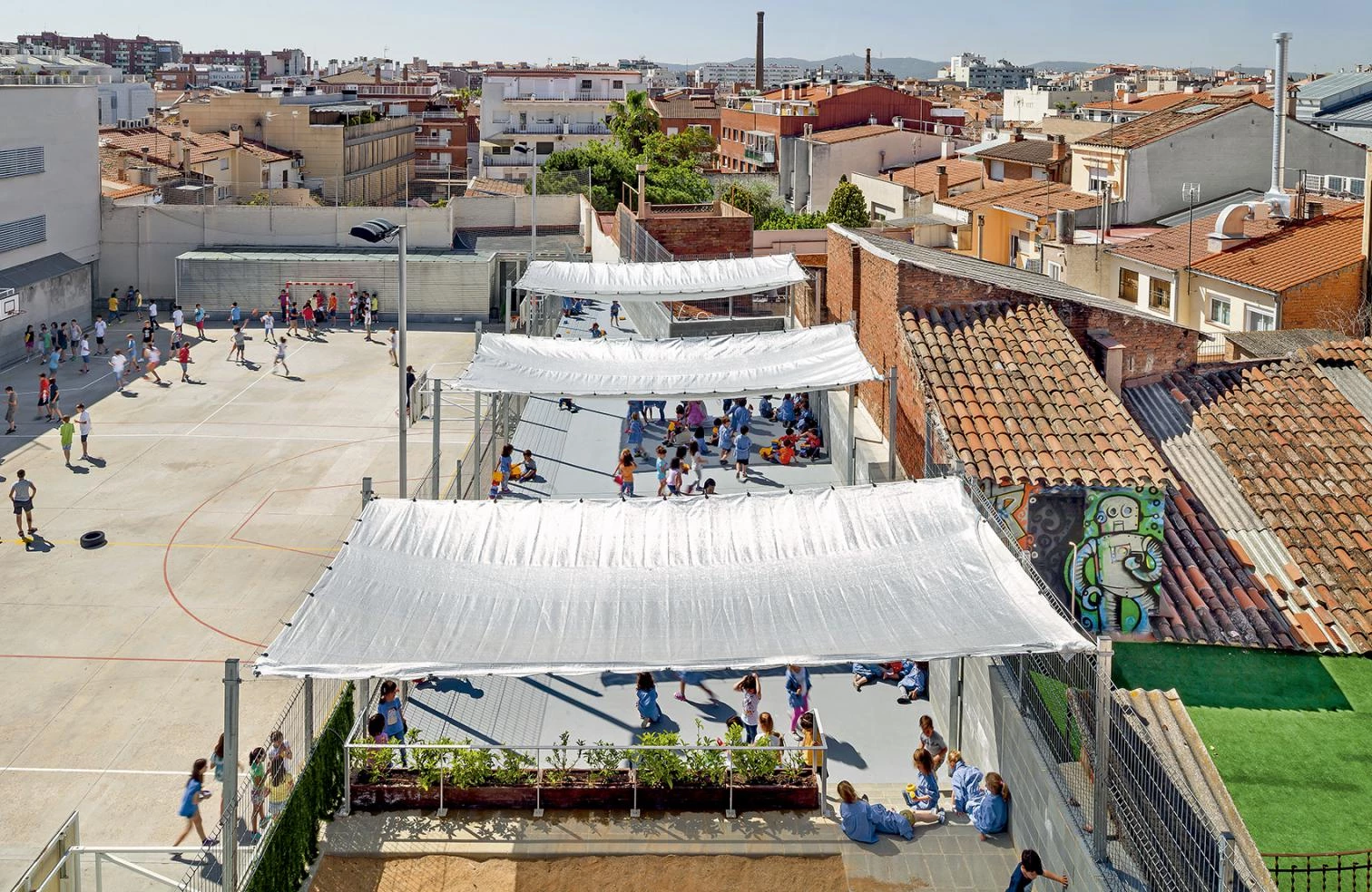La escuela se ubica en el tejido urbano del centro de Sabadell, en una esquina donde dos edificios alineados a la calle conforman un gran patio con un polideportivo soterrado en el interior de la manzana. El proyecto interviene sólo en el edificio más antiguo (1959), que acoge las clases de los más pequeños, y en unos pocos espacios exteriores.