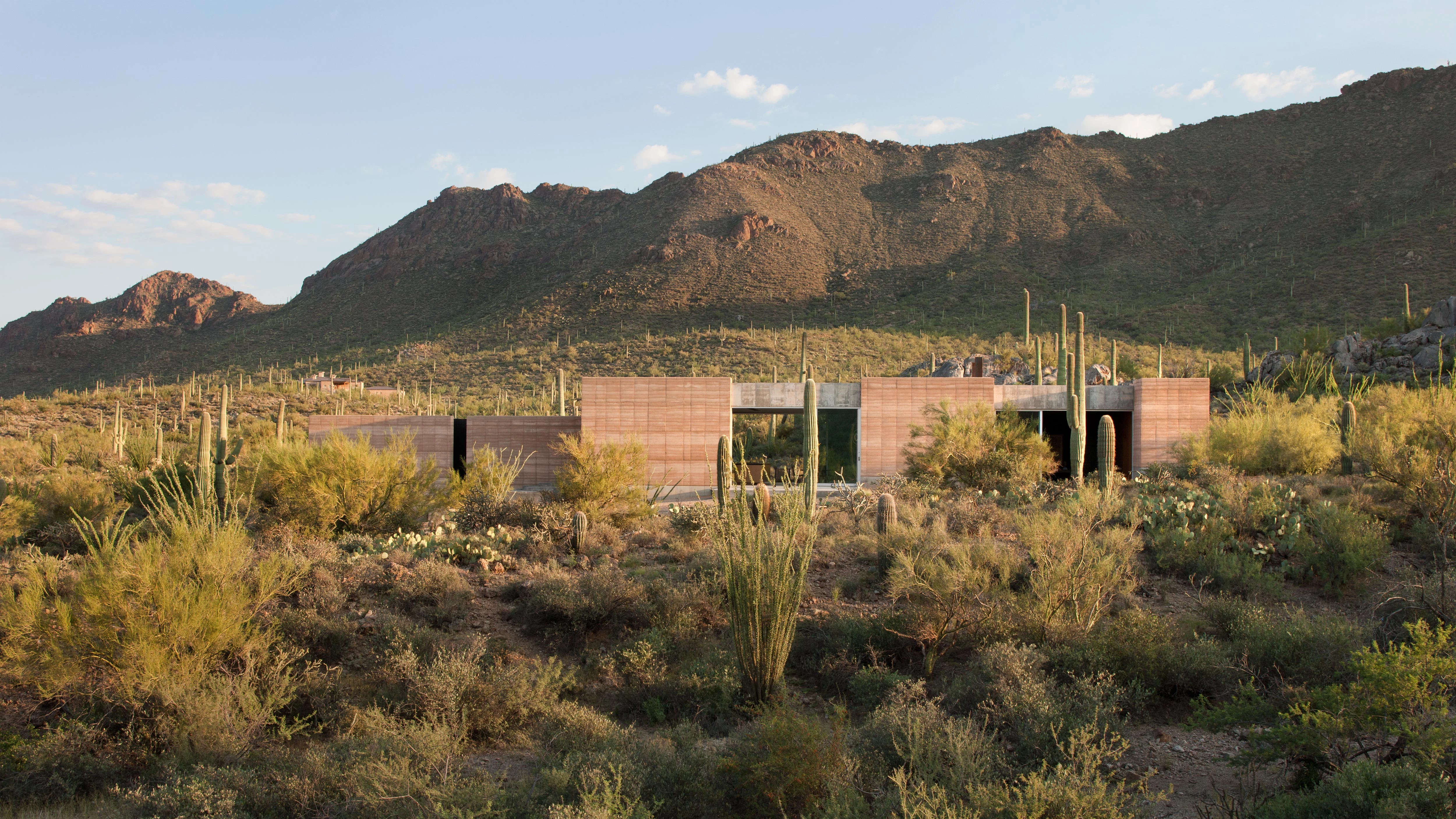 En un rincón del desierto de Sonora (Arizona) se ha construido una casa cuyo propósito es pasar desapercibida. Y lo consigue: su altura, de poco más de tres metros, no supera la de los poderosos cactus del entorno; su volumen se fragmenta en tres piezas articuladas entre sí (sala de estar, habitaciones, estudio de grabación) que no rompen la silueta del paisaje definido por lomas peladas de vegetación; y sus muros rojizos se camuflan con eficacia entre los tonos ocres y verdosos que forman la paleta cromática del lugar.