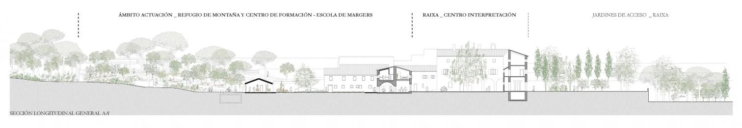 Concebida como una etapa más dentro de la historia de la Possessió de Raixa, la intervención se adapta a las nuevas necesidades (funcionales, sociales, energéticas…), respetando el carácter patrimonial del conjunto y el paisaje donde se inserta. La actuación está articulada en base a tres estrategias complementarias: la rehabilitación, que recupera el volumen, la forma y las texturas del conjunto a partir del uso de técnicas, oficios y materiales constructivos locales, eliminando la tabiquería y los añadidos de escasa calidad, mientras se consolidan las estructuras; la reconstrucción, con la reposición de piezas perdidas que ponen en valor el conjunto; y la reconfiguración, respondiendo a las demandas de accesibilidad, para acoger un refugio para senderistas con cincuenta plazas, que estará ubicado en las casas del amo, y un centro de formación agroforestal que se extiende en piezas interconectadas dispuestas de forma lineal conectadas con la zona boscosa del norte y el jardín intermedio.