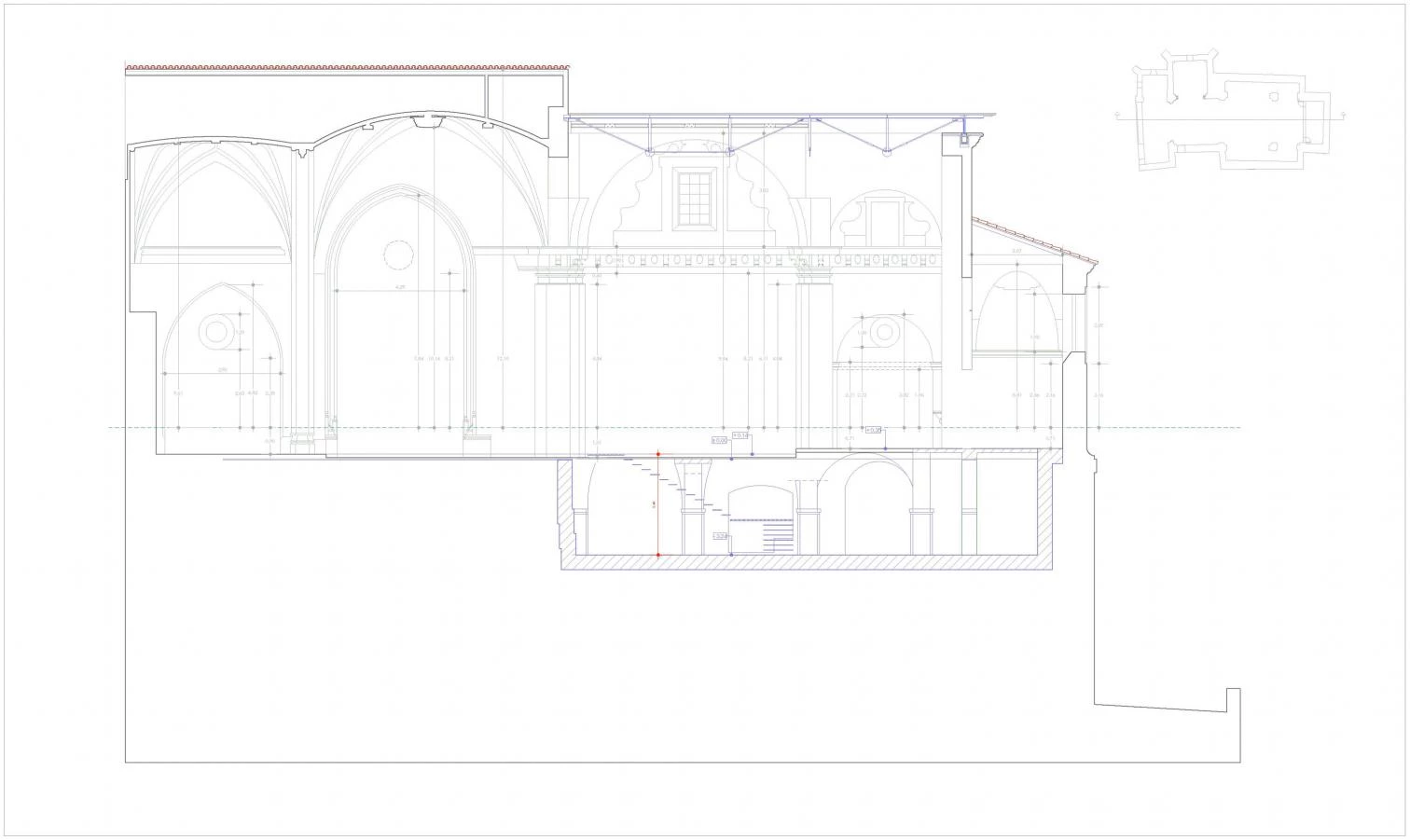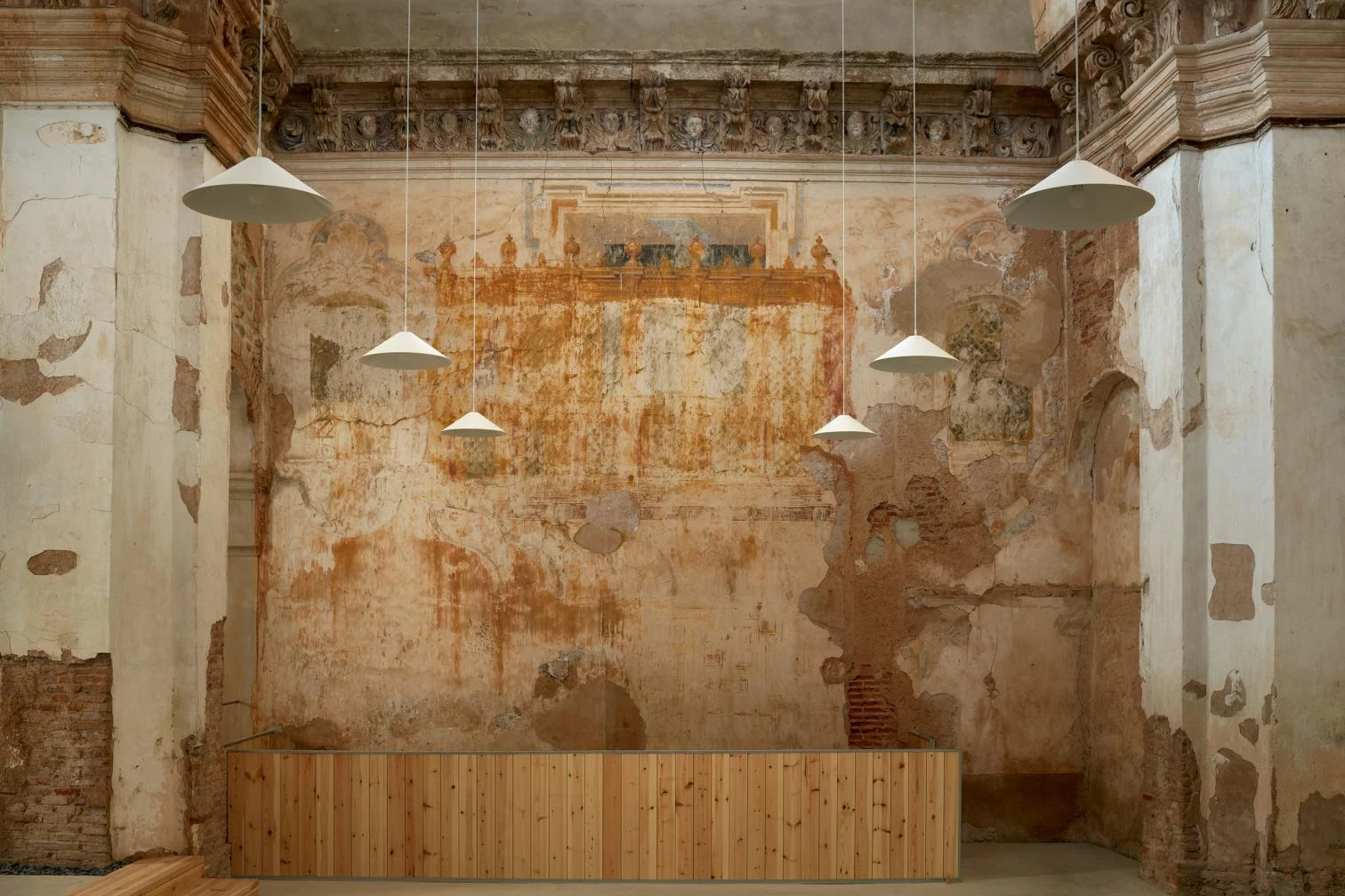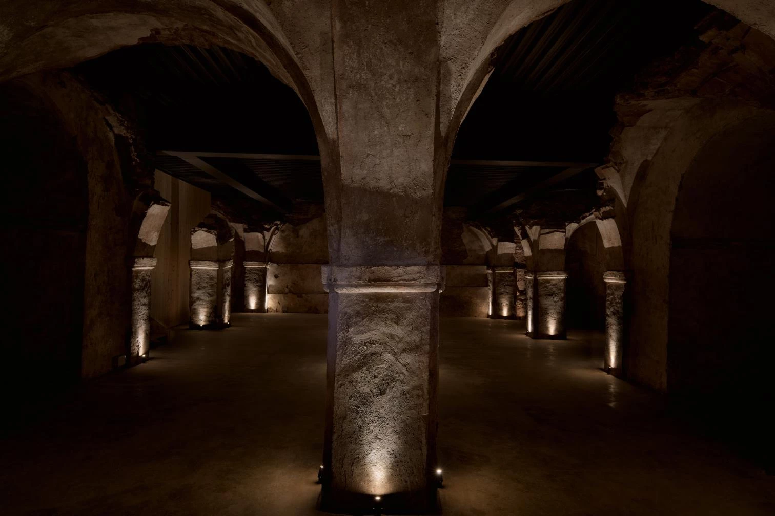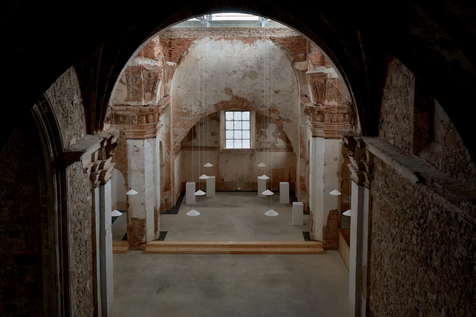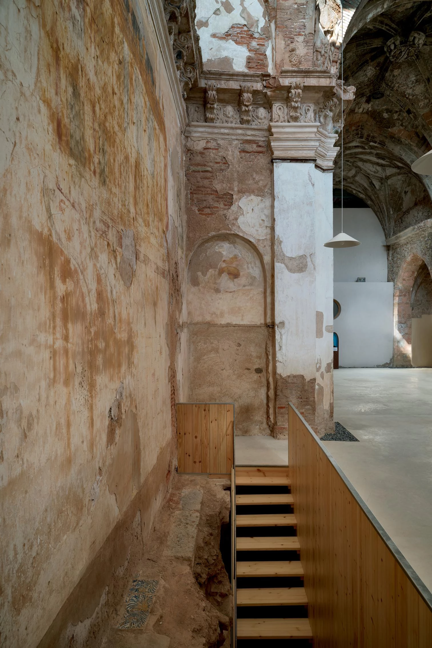 Para proteger la iglesia y frenar su deterioro, se coloca una cubierta de paneles sándwich y un forjado colaborante configurado mediante cuatro grandes vigas con sección en forma de H, que sirve de suelo a la iglesia y de techo pintado de gris oscuro a la cripta. En la actuación simplemente se rehabilitaron los desperfectos y se aseguró la sustentación, definiendo el espacio con la iluminación y un suelo de hormigón.