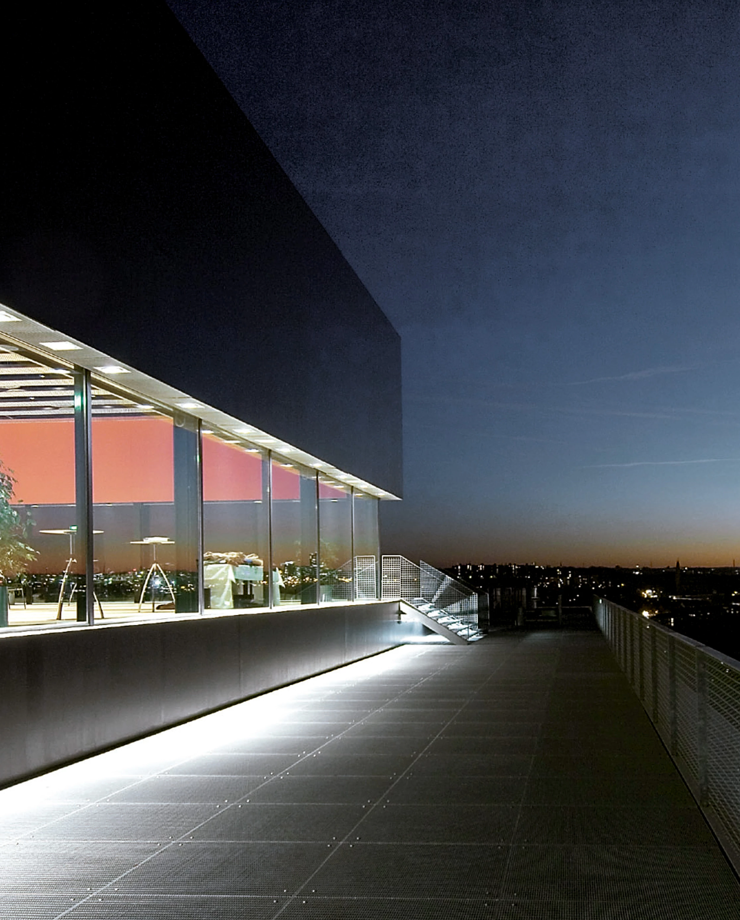 Los antiguos recorridos del edificio en cierto modo se han conservado y de la misma manera que el carbón se llevaba por cintas mecánicas hasta la última planta y era conducido hacia abajo en su proceso de limpieza, hoy los visitantes se elevan hasta 24 metros de altura por una gran escalera mecánica y desde ese punto descienden por las escaleras interiores. Revestida con chapas negras y paneles latera-les luminosos color naranja, esta enorme escalera exterior de 70 metros de longitud se convierte en el elemento distintivo de la revitalización de este histórico inmueble.
