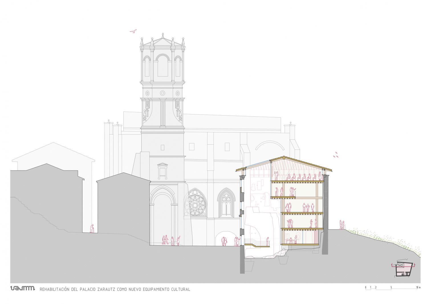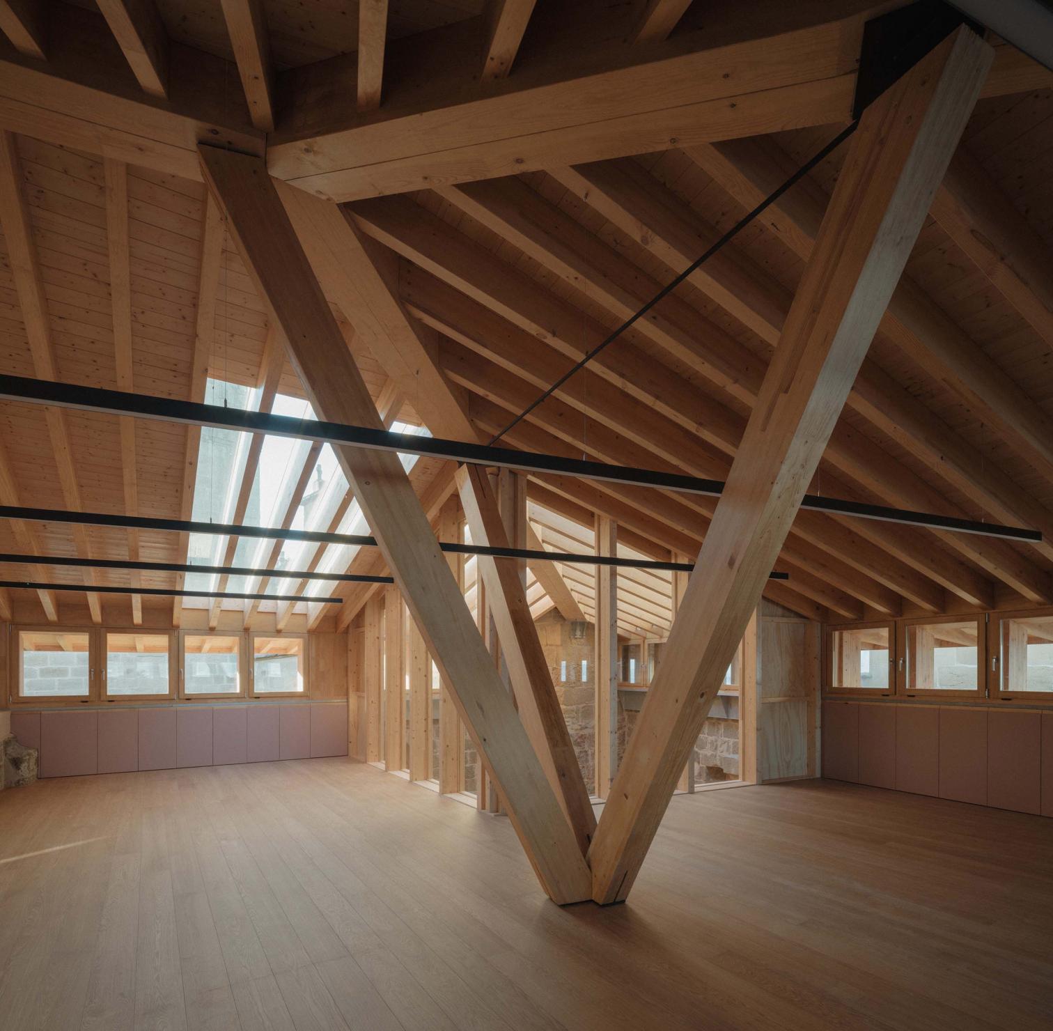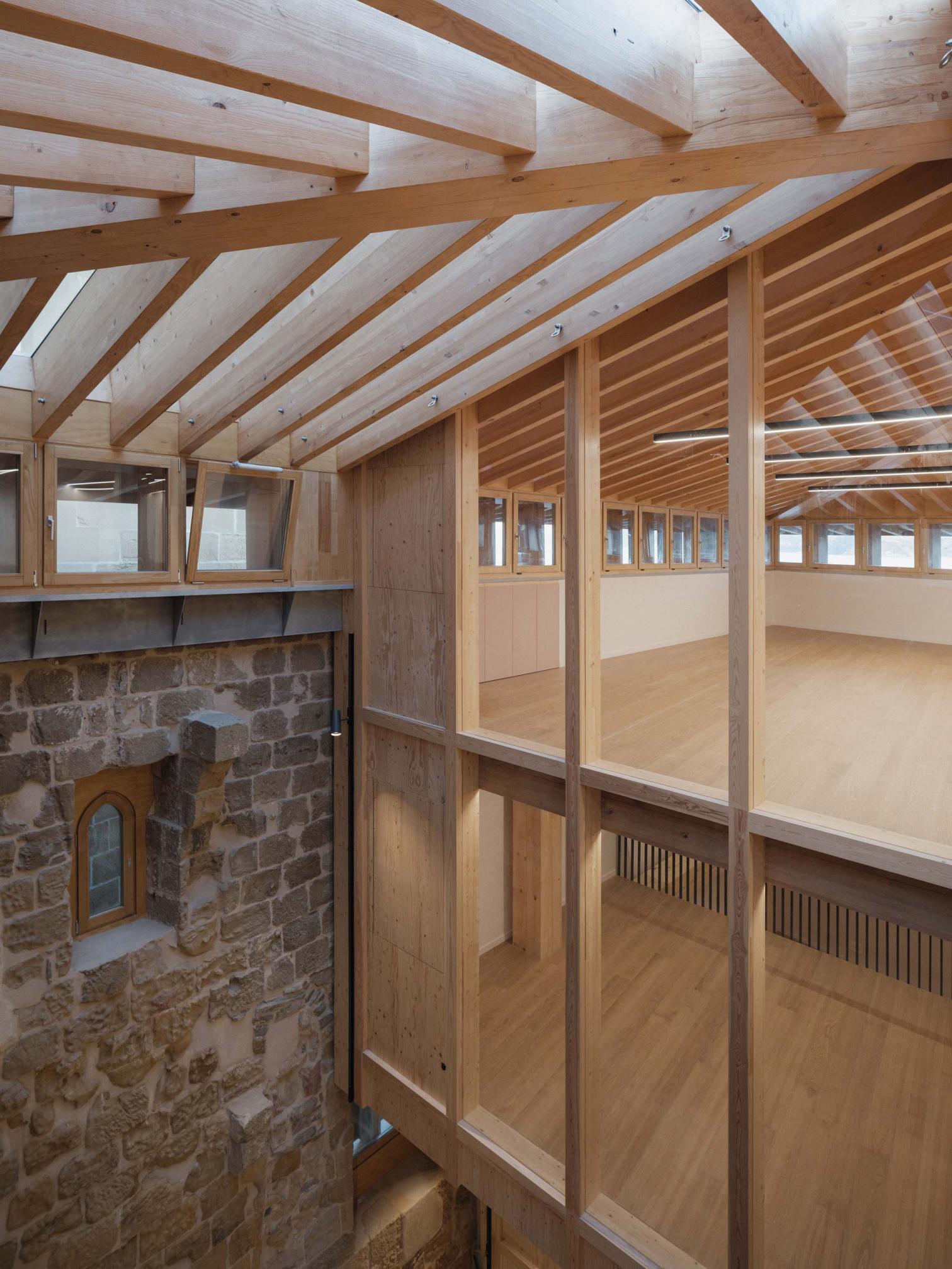 Un patio escultórico vertical, bañado por luz cenital, otorga el protagonismo al contrafuerte de la iglesia. En torno a este vacío se articulan los nuevos usos: una oficina de turismo en planta baja, un museo dedicado a Juan Sebastián Elcano en los niveles intermedios, y una sala polivalente en la cubierta. La nueva estructura interior, construida en madera y concebida como un volumen reversible y autónomo, respeta los muros originales y emplea materiales neutros que aportan calidez sin competir con la mampostería.
