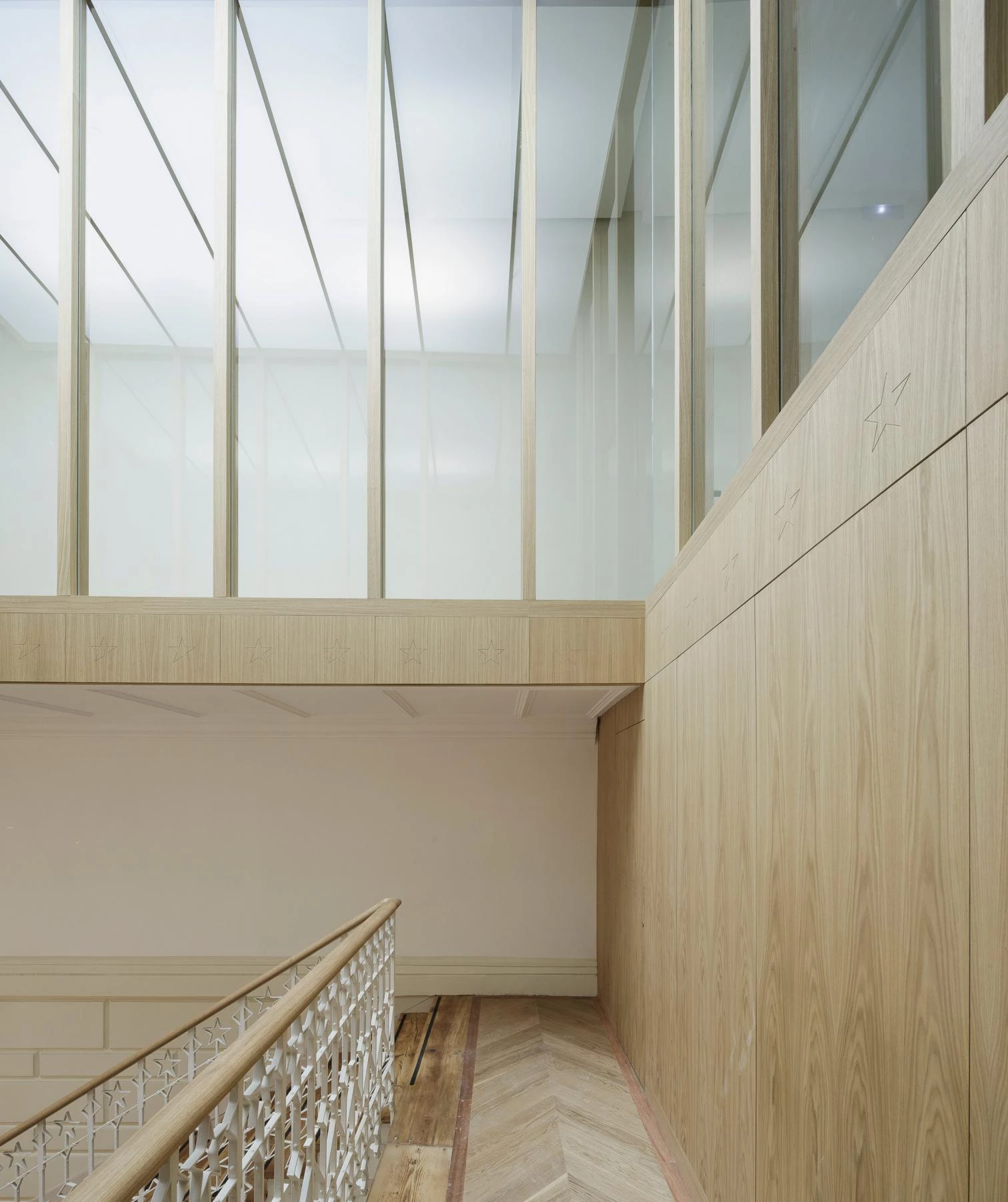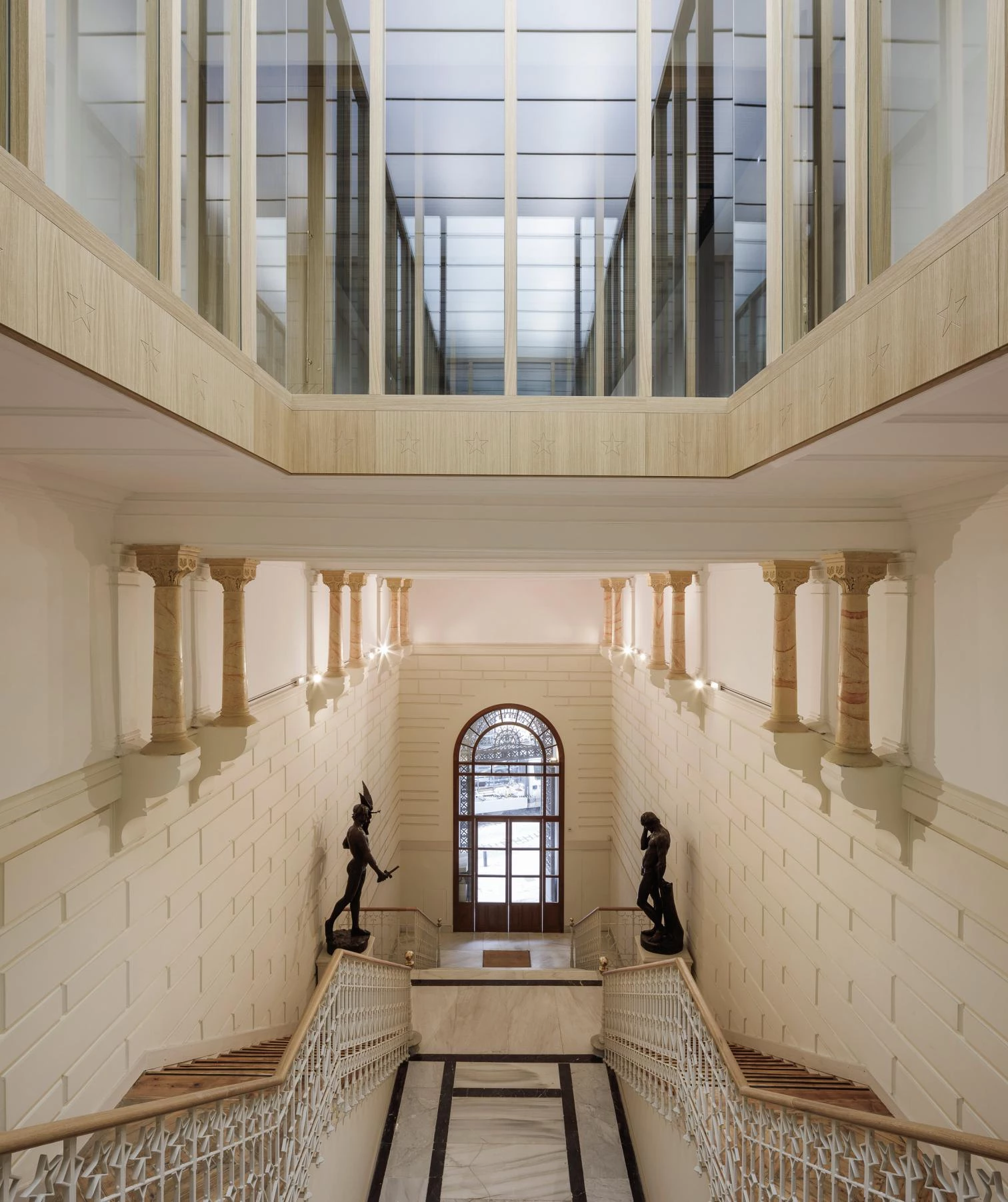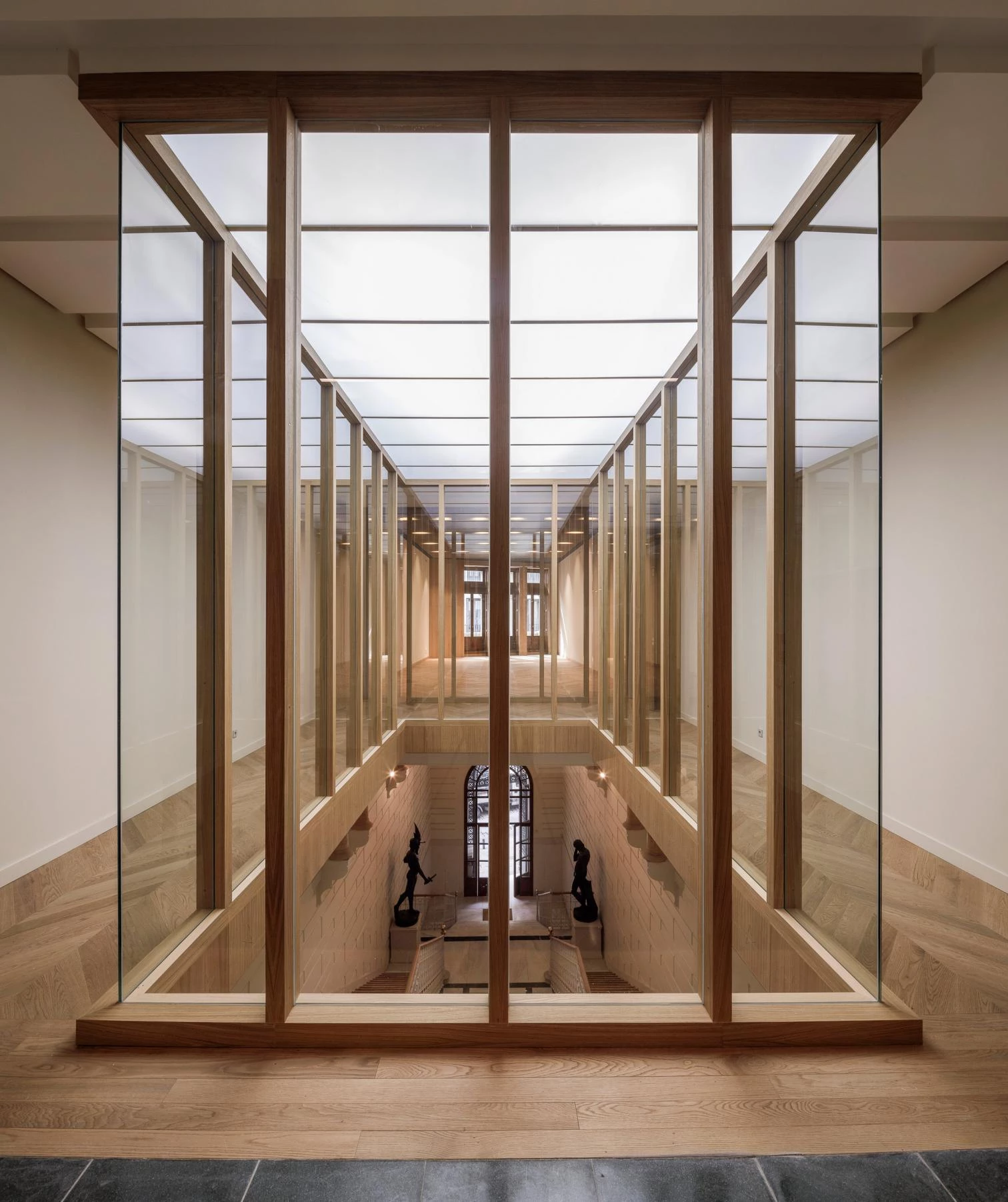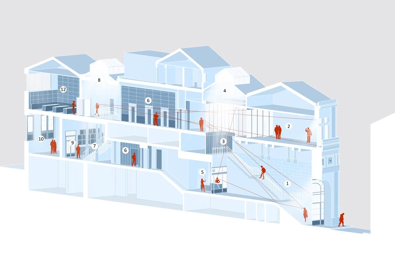 Se recupera la sección original del edificio de Prado 21, que organizaba los principales espacios desde la calle hasta el patio trasero de la fachada neomudéjar, articulando las dos escaleras con sendos lucernarios.