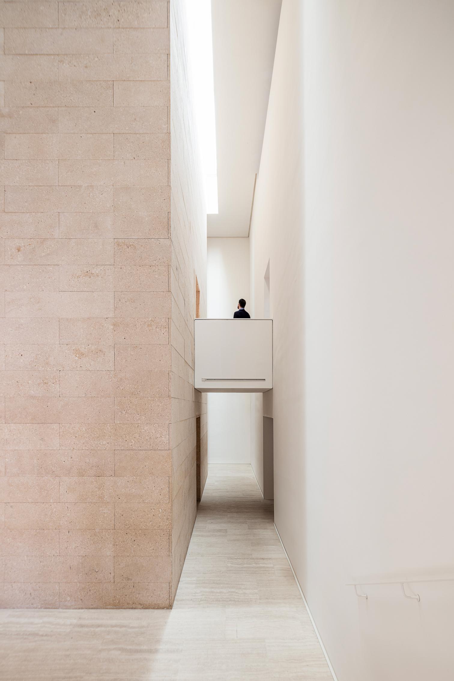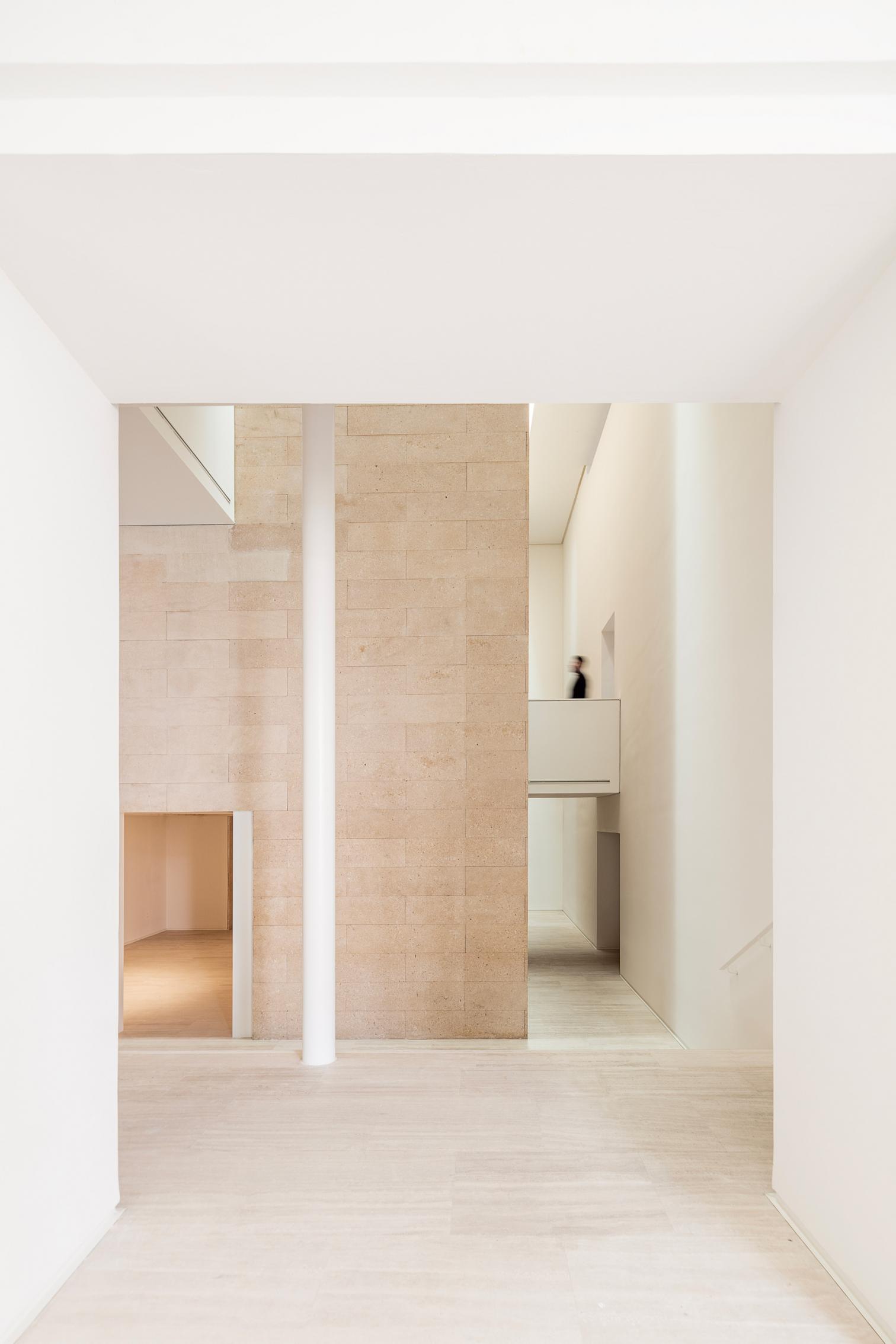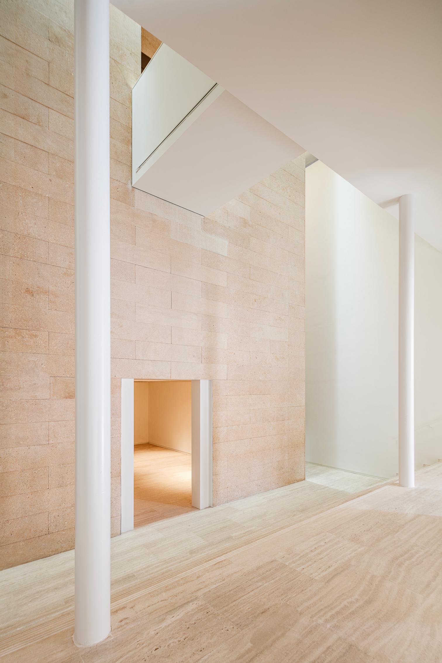 La intervención arquitectónica ha reinterpretado los espacios existentes desde una perspectiva contemporánea, redefiniendo el acceso y el sistema de circulaciones para hacerlos más diáfanos y accesibles. Se eliminaron los elementos que dificultaban la fluidez del recorrido, permitiendo que la luz natural —filtrada por las aperturas cenitales que envuelven el cubo central de piedra— recobrara su protagonismo. La supresión de las escaleras originales, ahora reubicadas en el nuevo núcleo de comunicaciones, ha transformado la percepción del espacio: una reorganización vertical que aligera visualmente el conjunto y refuerza la conexión entre niveles.