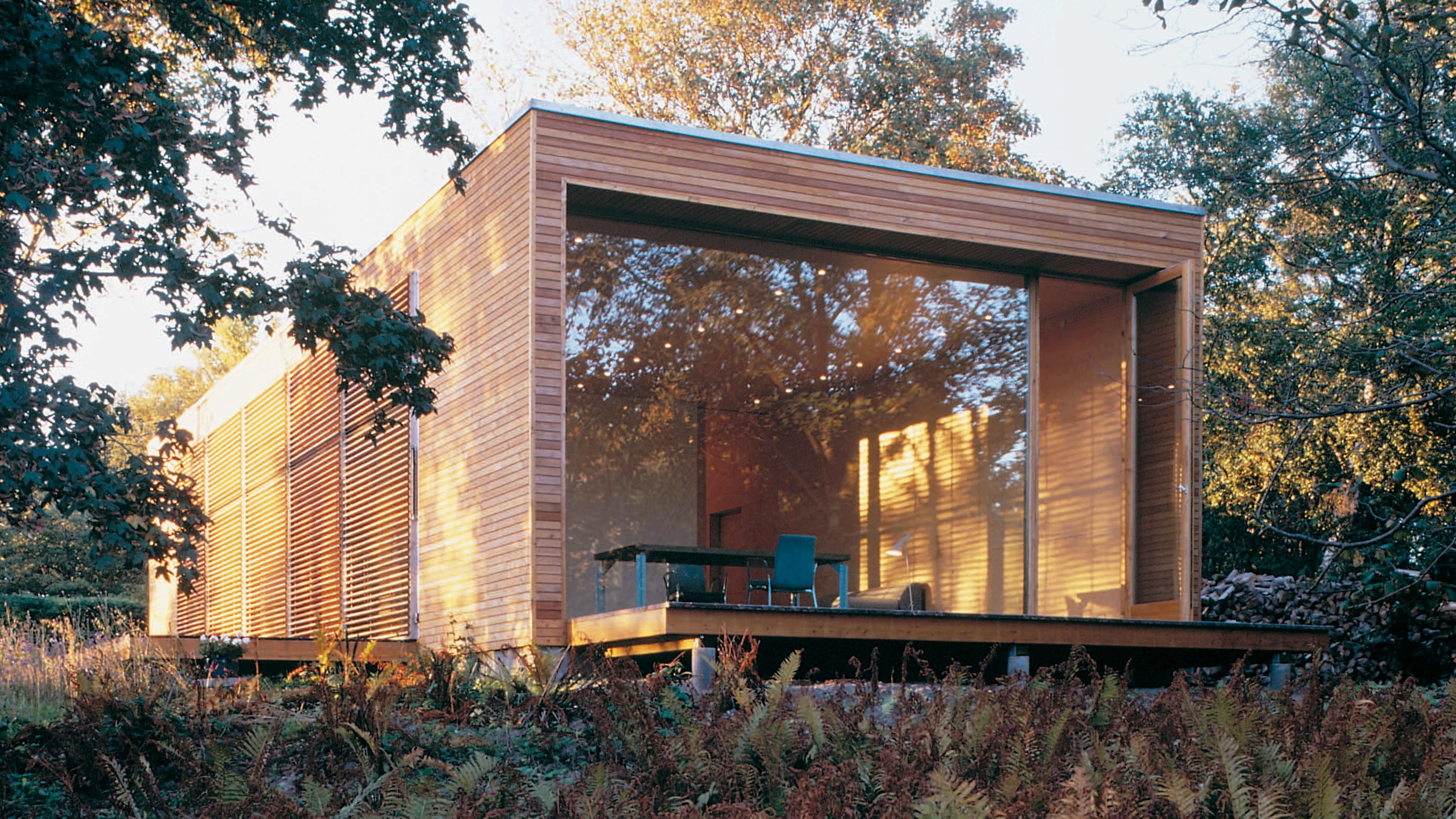 Construida bajo la condición de que su superficie útil no superara los cien metros cuadrados, la casa es un prisma elemental cerrado al viento del norte que se abre por entero a la luz del sur. En la fachada oeste, grandes ventanales captan los últimos rayos de la tarde a través de un filtro de listones de madera de alerce que insisten en la definición de la envolvente como una piel sensible a cada orientación. Los bastidores sobre los que se montan estas lamas orientables pueden ser elevados hasta adquirir una posición horizontal, definiendo de esta manera una suerte de porche sobre la terraza que flanquea la edificación. Otra terraza de carácter más privado se extiende desde la fachada sur, flotando sobre un macizo de helechos. Al interior, la casa es un espacio continuo con un núcleo central que alberga las instalaciones, el baño, la cocina, y dos chimeneas. Por deseo expreso del cliente, la vivienda y el estudio debían estar comunicados entre sí pero sin excluir la posibilidad de ser segregados uno de otro. Una serie de puertas correderas parten de las paredes del núcleo, permitiendo subdividir el espacio en cuatro ámbitos independientes: la entrada, la cocina, el estudio y la sala de estar.