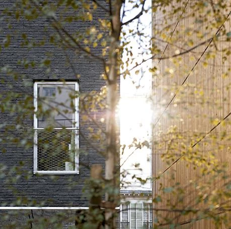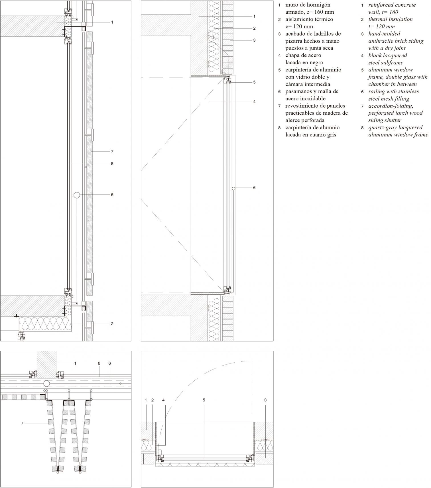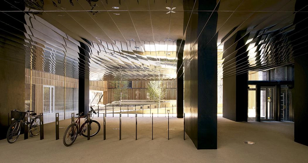 Los 143 apartamentos se dividen en una serie de volúmenes dispuestos en torno a un patio conectado visualmente con el exterior a través de dos grandes pasadizos. El primero de ellos permite el acceso desde la calle, el segundo alberga unas escaleras metálicas que conectan las distintas plantas de la residencia. Un cerramiento de malla de acero inoxidable protege la planta baja del edificio —donde se dispone un aparcamiento de bicicletas visible desde la calle— al tiempo que permite al peatón vislumbrar el patio interior. La fachada hacia la calle, revestida de ladrillos oscuros hechos a mano, contrasta con la cálida materialidad de los listones de madera de alerce que recubren las fachadas del patio interior, y este contraste permite imbuir en el proyecto un sentido de urbanidad y diversidad en consonancia con la heterogeneidad del barrio en el que se asienta.