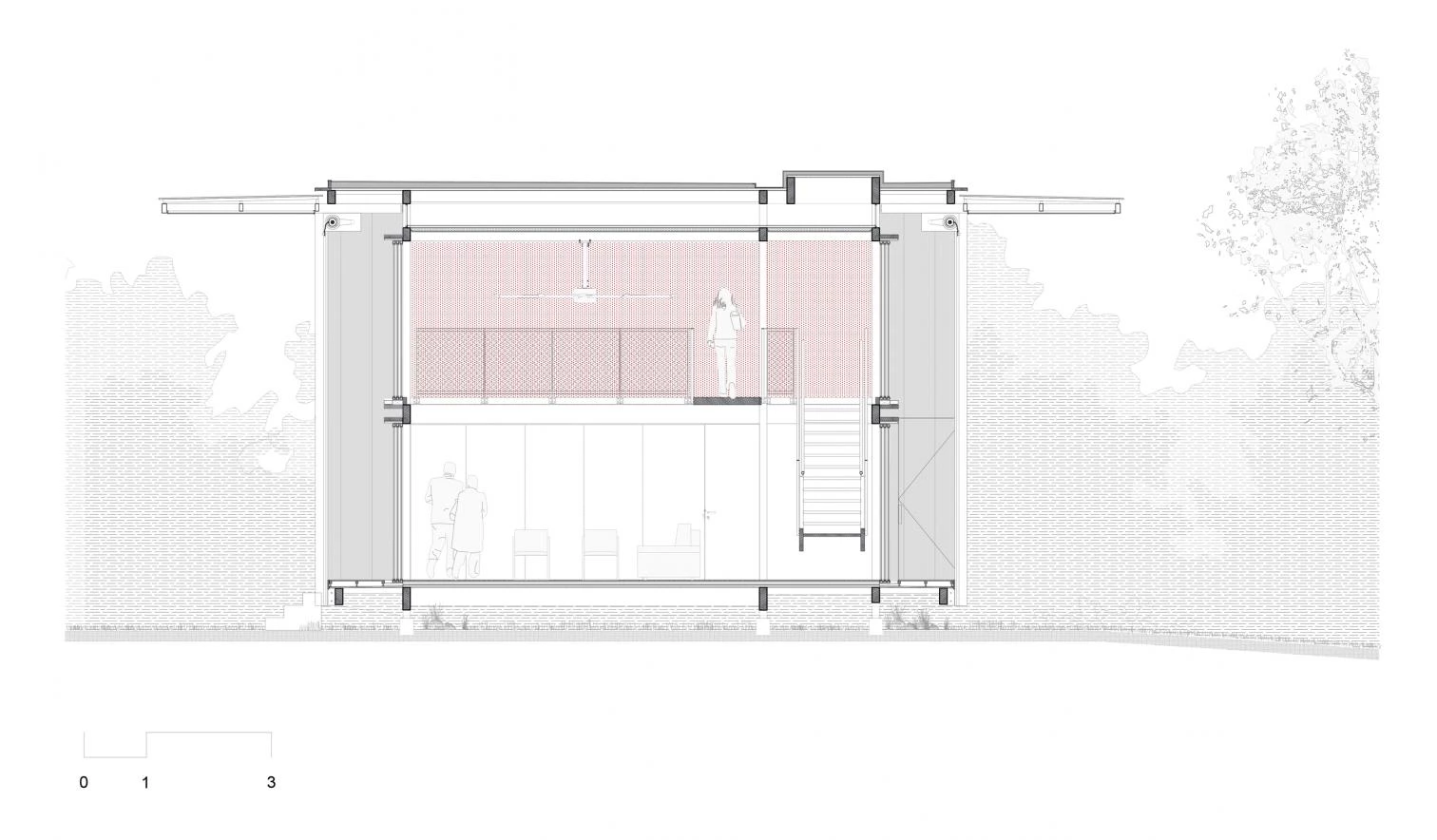 El sistema constructivo está basado en elementos prefabricados de madera, ensamblados en el sitio. La construcción se eleva 75 centímetros sobre el suelo, garantizando la ventilación natural de la base, que además de refrescar la casa, reduce significativamente el exceso de humedad.