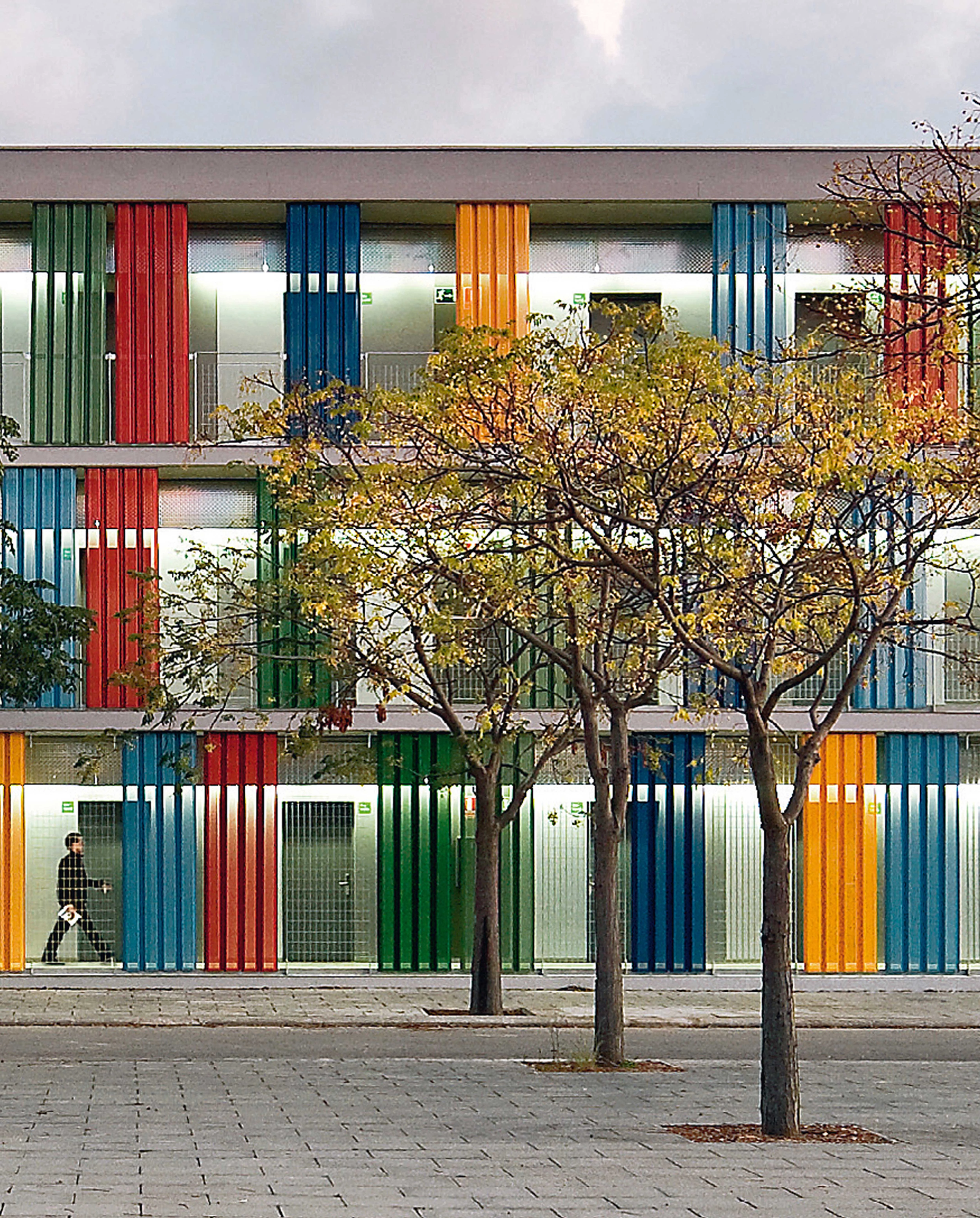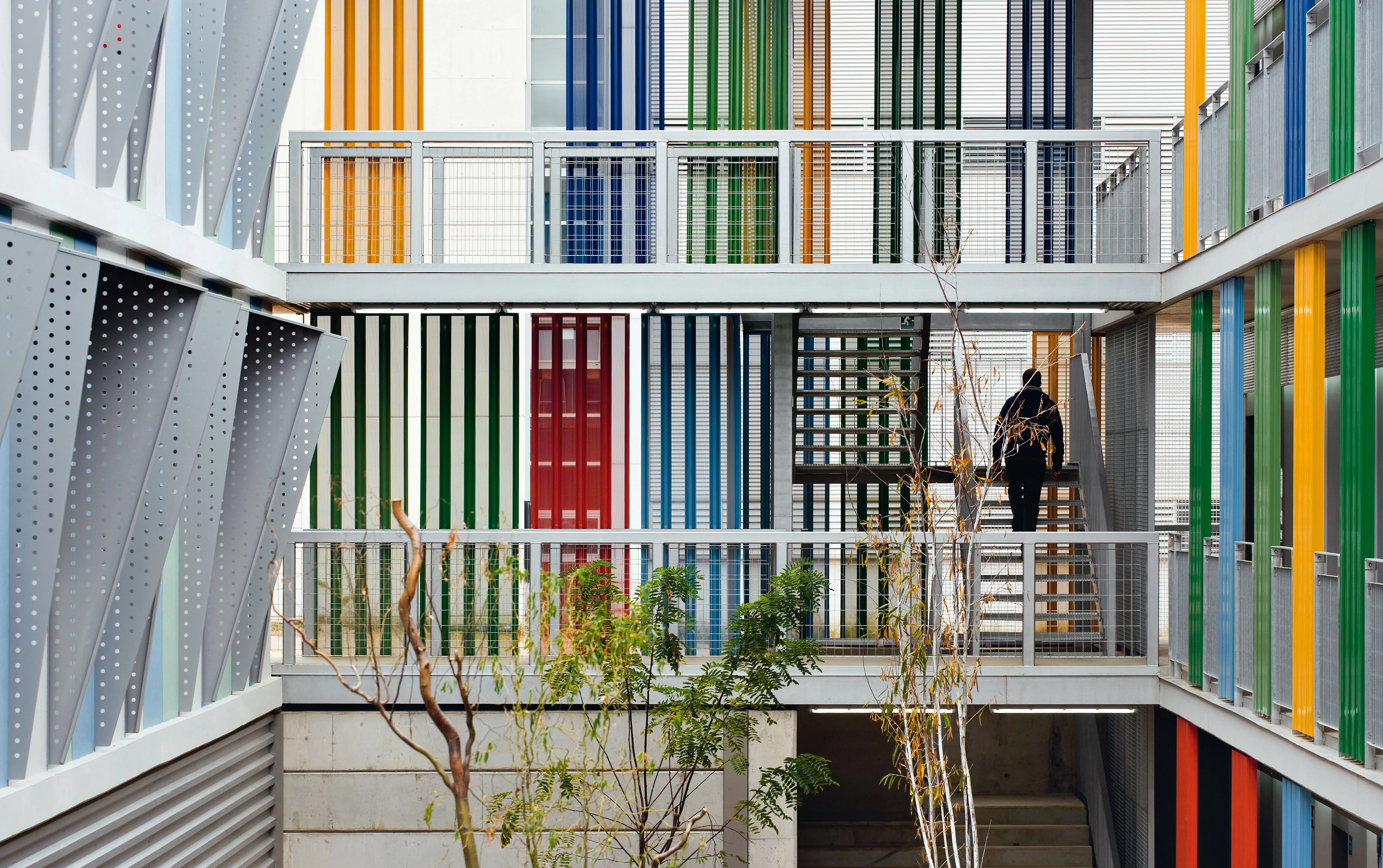 La comunicación entre los bloques se realiza por un volumen central que ejerce de punto de encuentro y configura los espacios comunes, y a través de pasarelas y núcleos de escaleras que cruzan y dinamizan el patio interior. Estos espacios de tránsito, así como los corredores de fachada, se cierran con coloridos bastidores de chapa metálica microperforada cuya permeabilidad varía según su posición, regulando la intimidad de estas áreas y ofreciendo un frente cromático para la plaza central del campus.