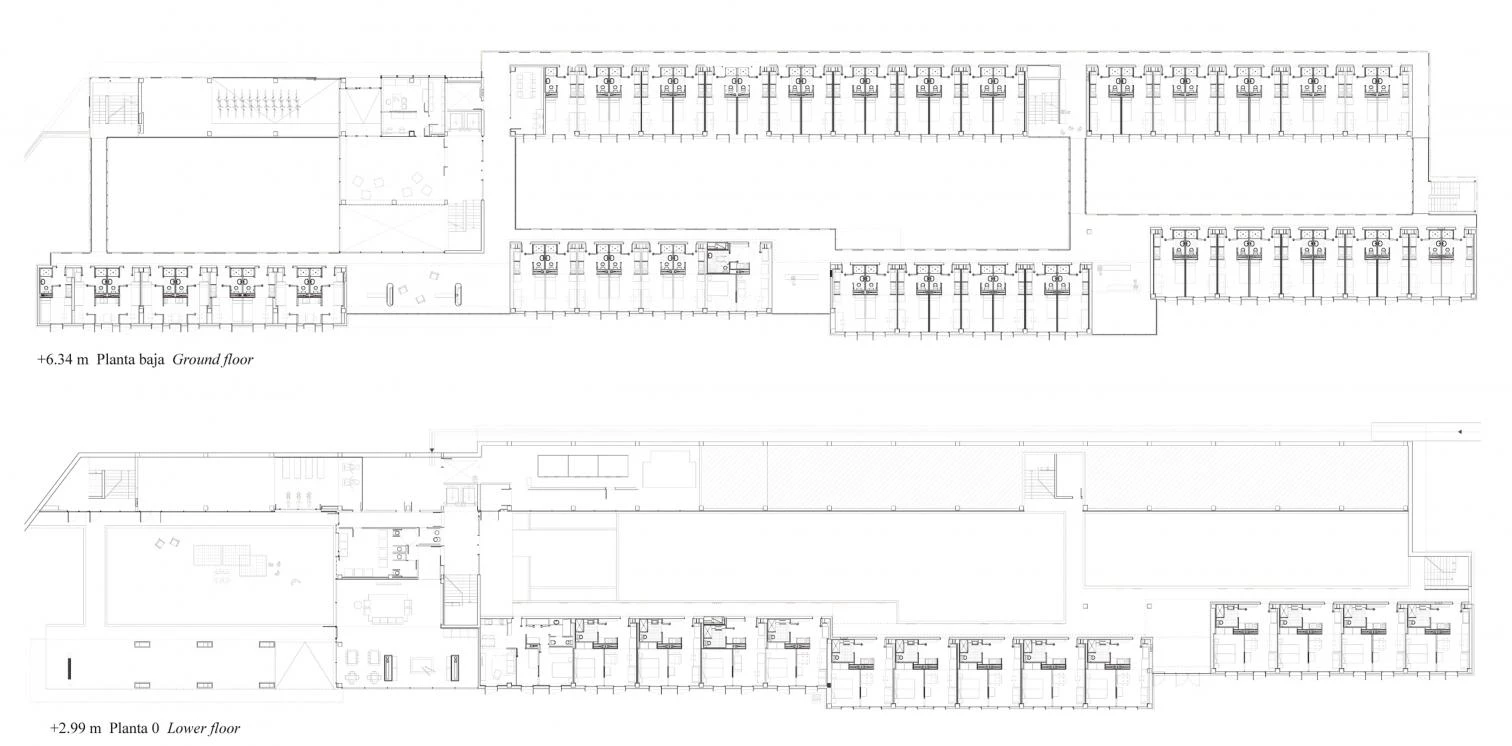 La cota cero se sitúa a la altura de la plaza central, accesible a través de áreas de recepción y administración. Frente a ellas, un cuerpo transversal une los bloques y se comunica directamente con la planta inferior, donde se localizan los espacios de uso común abiertos hacia el patio y los jardines.