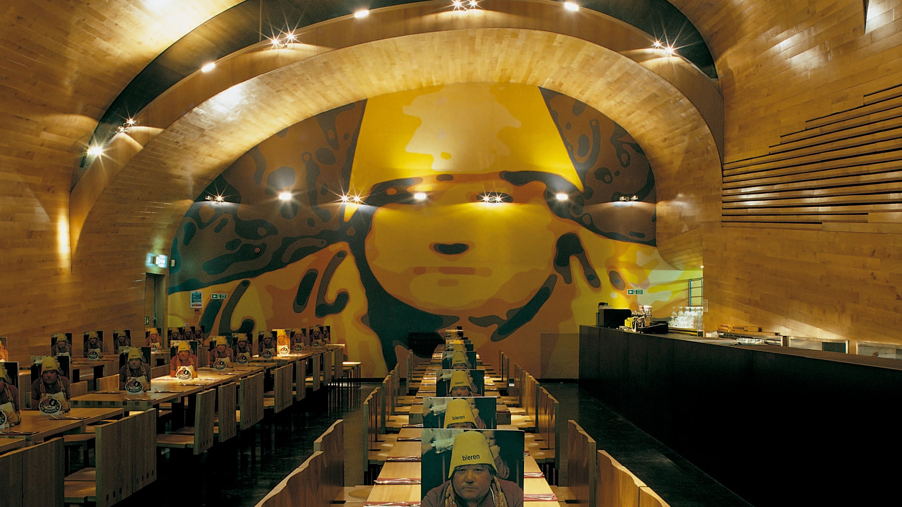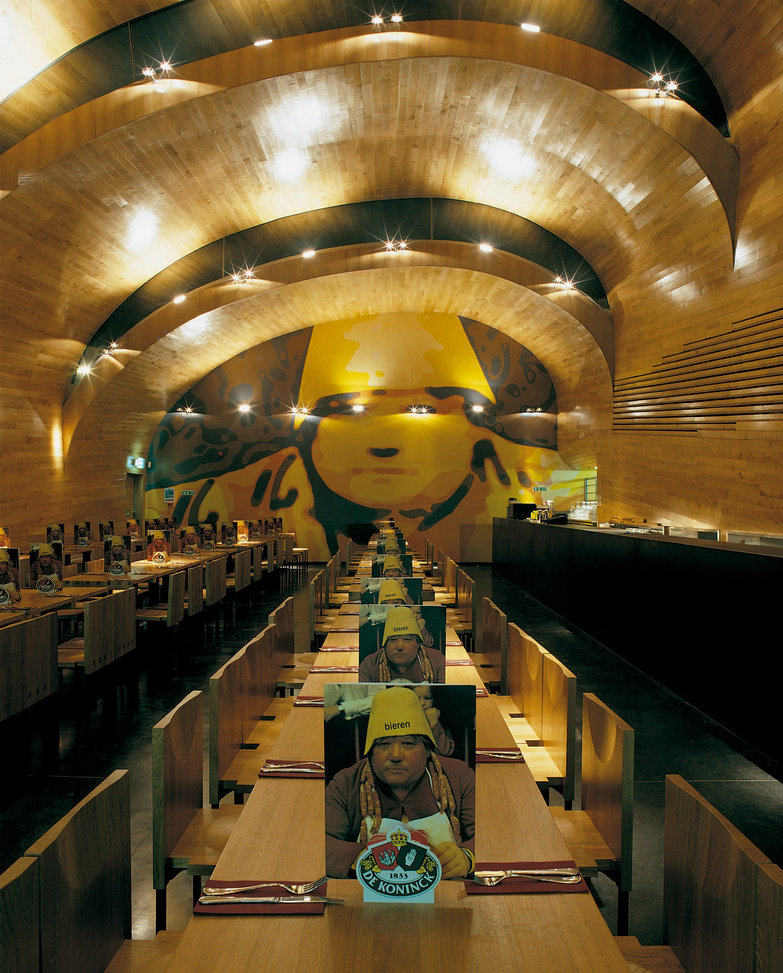 La cadena de restaurantes Belgo ofrece un menú corto y atrayente, con los ingredientes más populares de la gastronomía belga: mejillones, patatas fritas y cerveza. Su último local en Londres ocupa lo que fue un antiguo teatro de Notting Hill Gate, cuyo mal estado requirió demoler parte de lo existente. Una misma geometría ha permitido resolver la estructura y el cerramiento del comedor principal. Tras la estrecha fachada —con un rótulo de 12 metros de altura y 3 de ancho que exhibe alternativamente el menú de la casa o sus emblemas—, un corredor largo y angosto desemboca en un generoso espacio continuo y abovedado. En la cubierta, revestida exteriormente de acero inoxidable, se han practicado tres incisiones para dejar paso a la luz natural. Brueghel y El Bosco han sido la fuente de inspiración para recrear el ambiente de un refectorio medieval, con revestimientos interiores de roble y mobiliario común a todos los locales de la cadena.