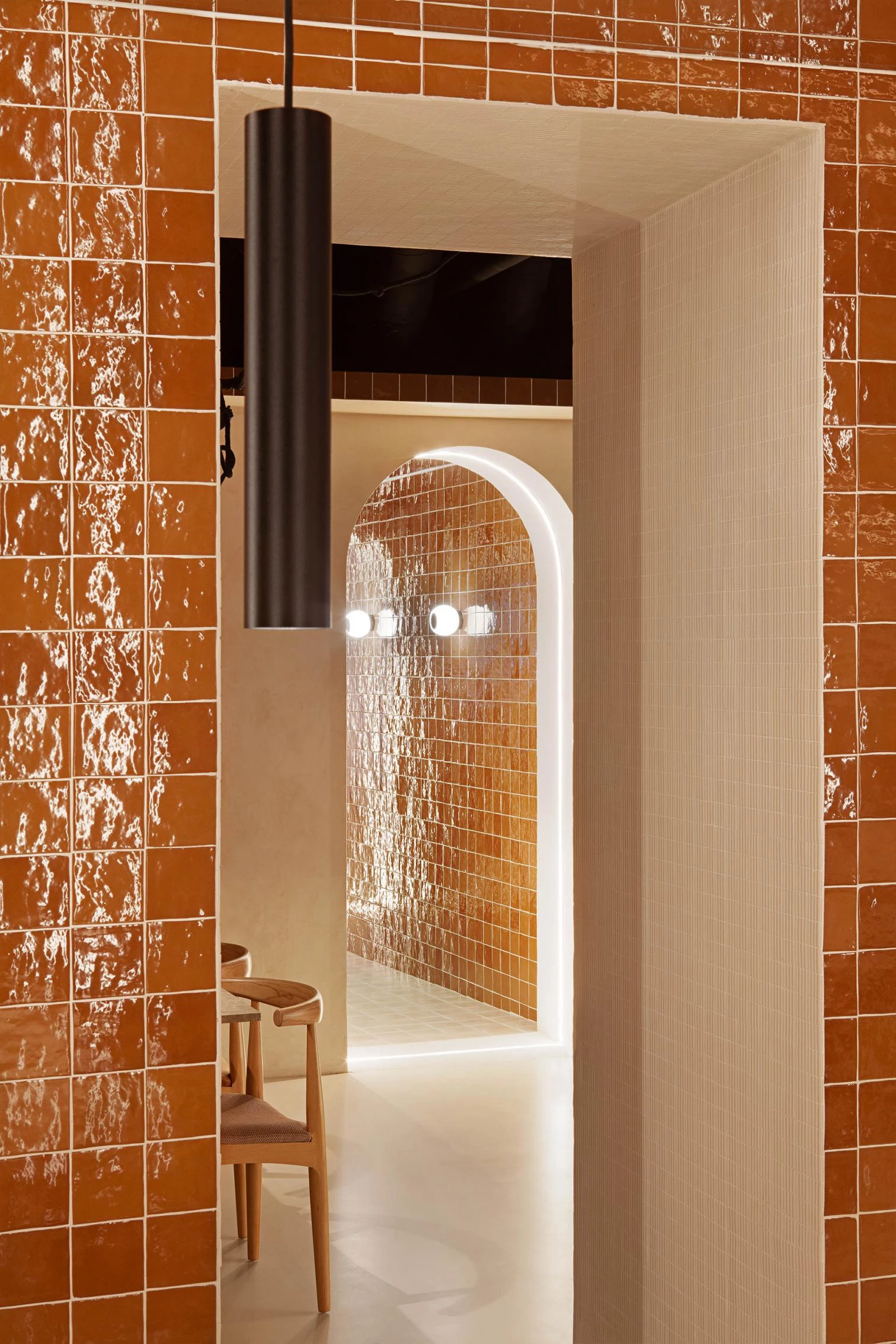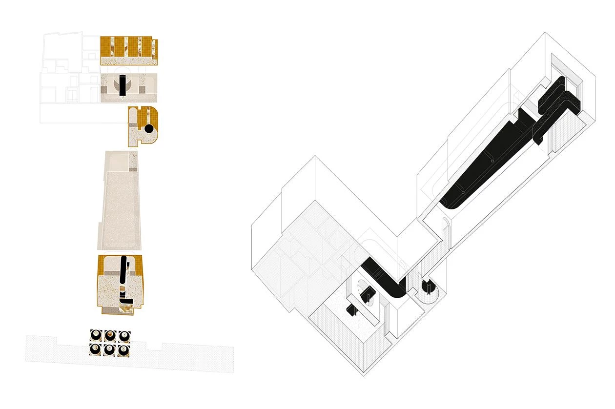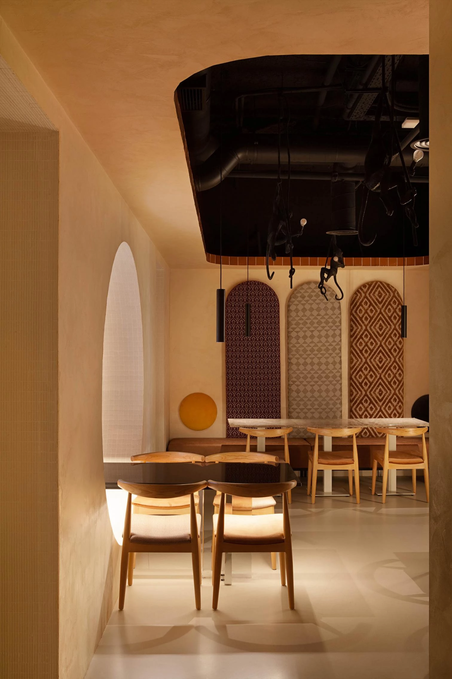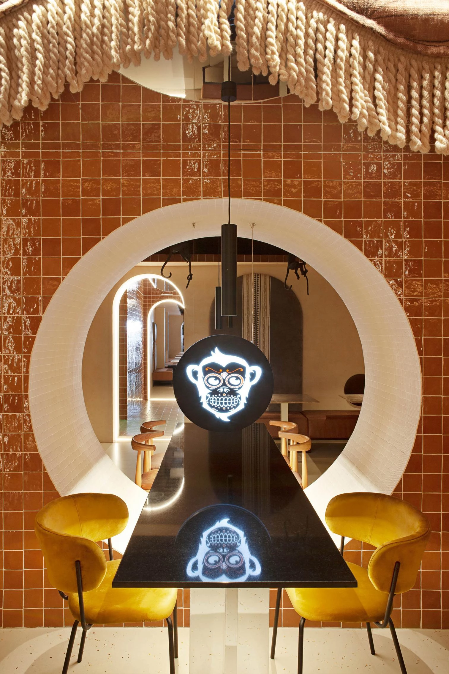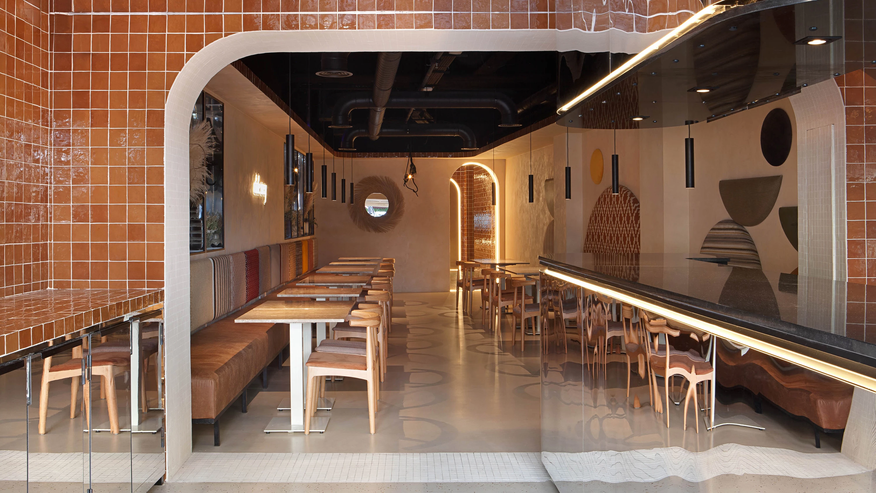 En el número 54 de la calle Santa Engracia, en el madrileño barrio de Chamberí, se sitúa este restaurante proyectado por la firma de Carlos Moles Romero y Adrián Sánchez Castellano, MOCA estudio. La intervención se desarrolla en un local de 300 metros cuadrados, 180 de los cuales están destinados al público, en la planta baja de un edificio protegido de 1925. Sobre el eje longitudinal de este nivel, dos tipos de secuencias espaciales marcan ambientes comprimidos reflectantes y estancias dilatadas mate. De esta manera, la primera presenta alicatados y juegos de espejos que diluyen los límites. La segunda contiene salones donde se contraponen las resinas cementosas de color beige y los recortes a un techo técnico heredado recubierto por vermiculita pintada de negro, así como la madera del mobiliario, las superficies marmoleas y los estampados de los tapizados. Las transiciones entre ellas están resueltas mediante relieves curvos y texturas rugosas.