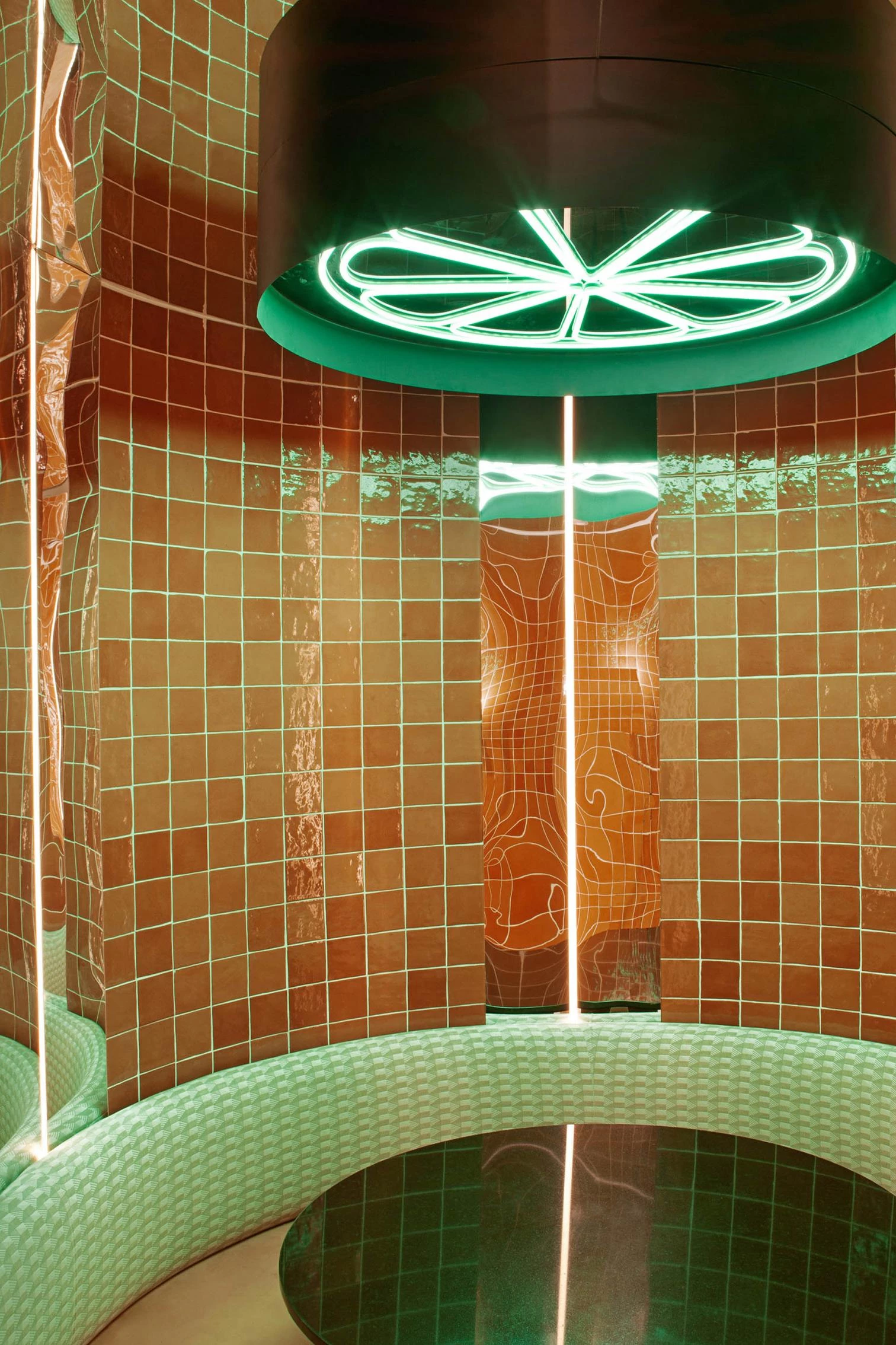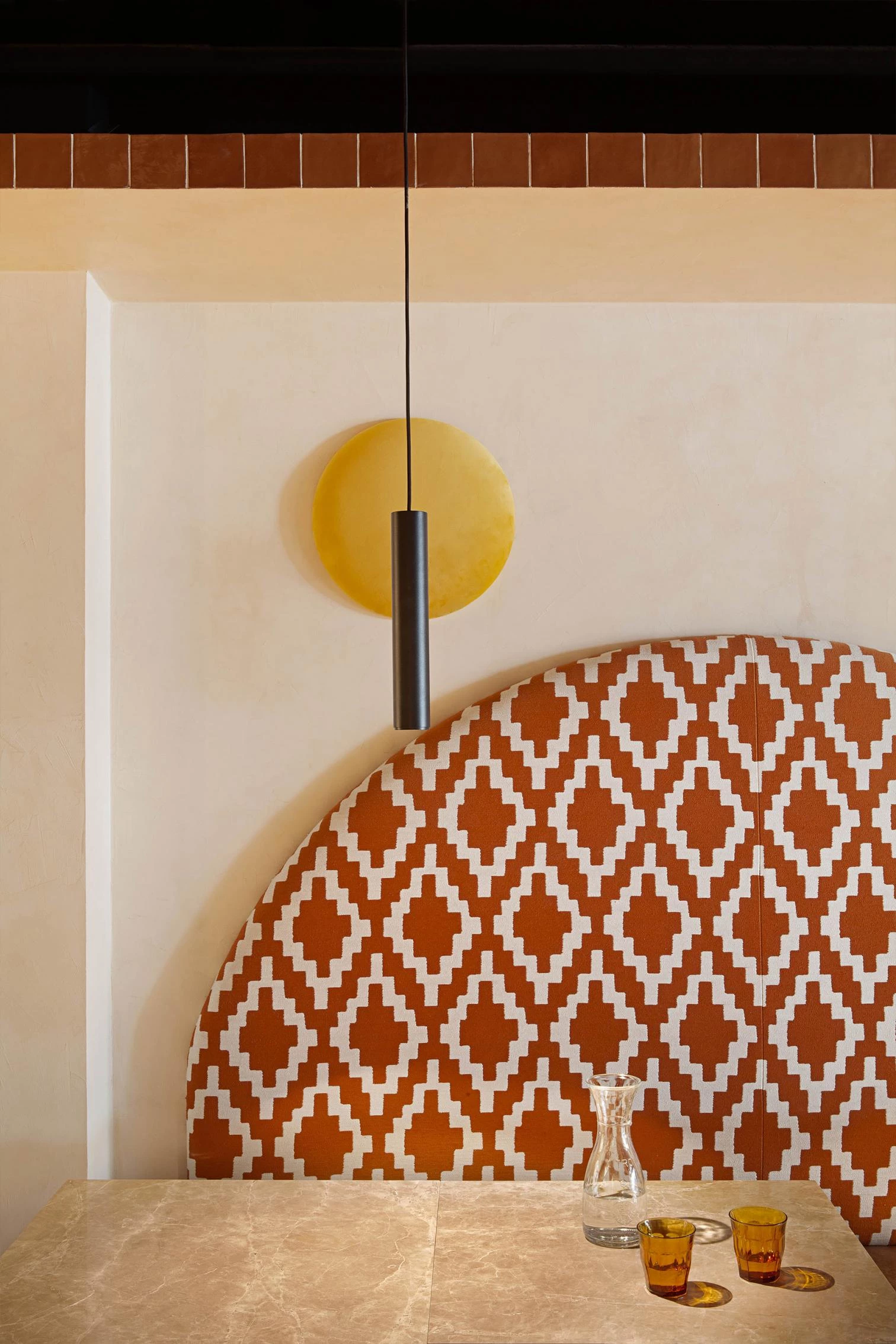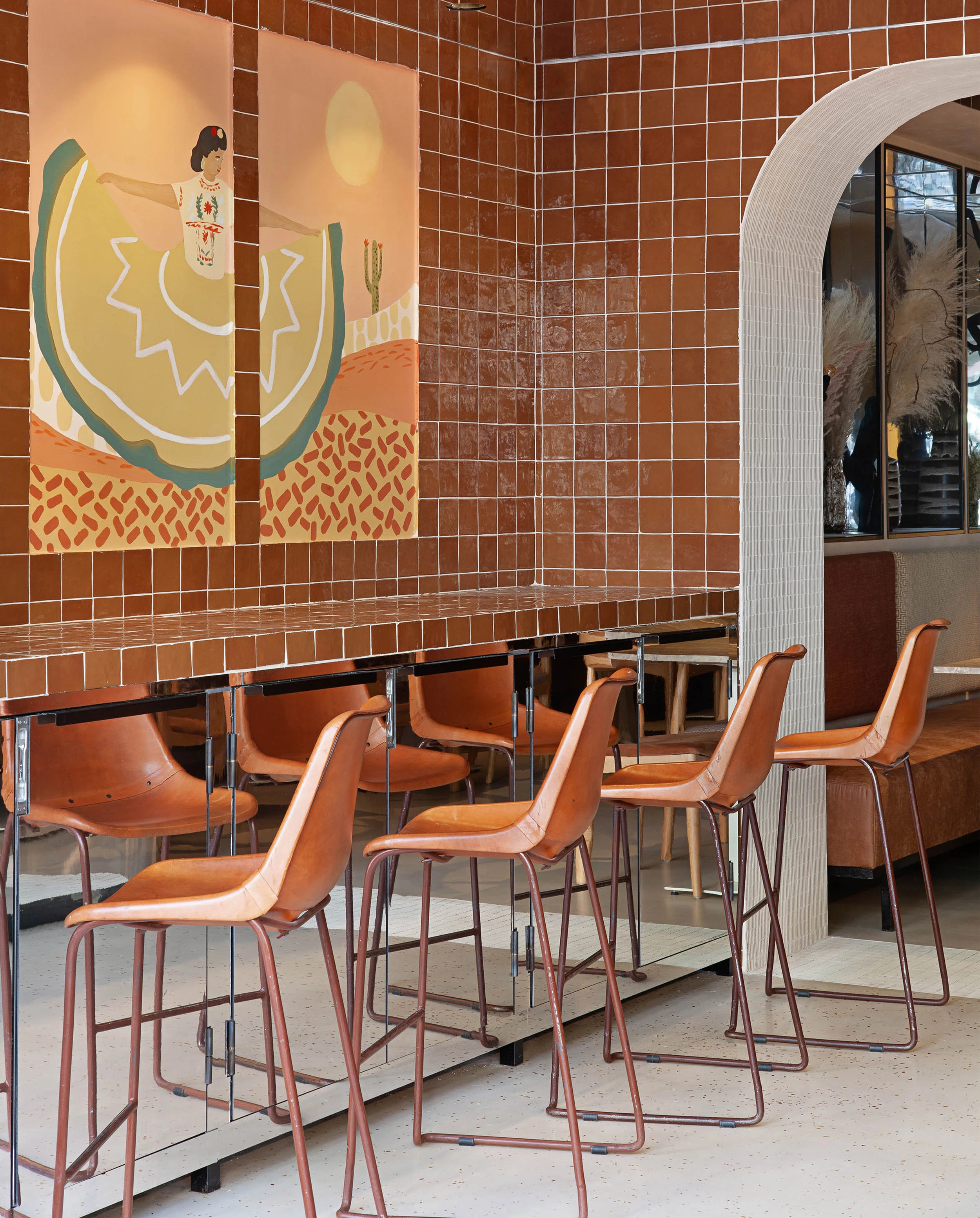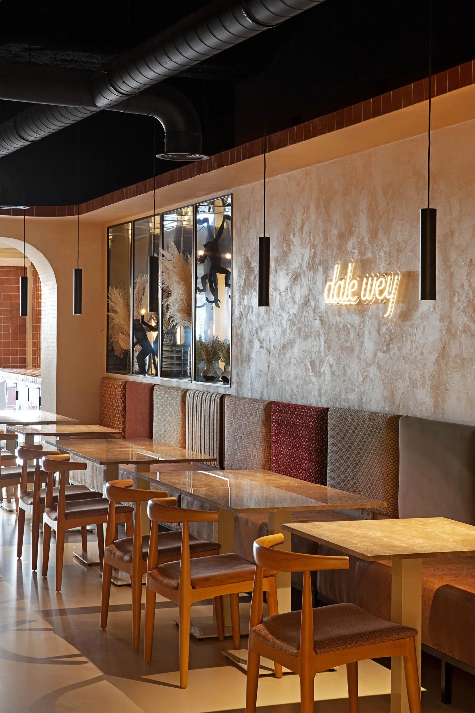 En el número 54 de la calle Santa Engracia, en el madrileño barrio de Chamberí, se sitúa este restaurante proyectado por la firma de Carlos Moles Romero y Adrián Sánchez Castellano, MOCA estudio. La intervención se desarrolla en un local de 300 metros cuadrados, 180 de los cuales están destinados al público, en la planta baja de un edificio protegido de 1925. Sobre el eje longitudinal de este nivel, dos tipos de secuencias espaciales marcan ambientes comprimidos reflectantes y estancias dilatadas mate. De esta manera, la primera presenta alicatados y juegos de espejos que diluyen los límites. La segunda contiene salones donde se contraponen las resinas cementosas de color beige y los recortes a un techo técnico heredado recubierto por vermiculita pintada de negro, así como la madera del mobiliario, las superficies marmoleas y los estampados de los tapizados. Las transiciones entre ellas están resueltas mediante relieves curvos y texturas rugosas.