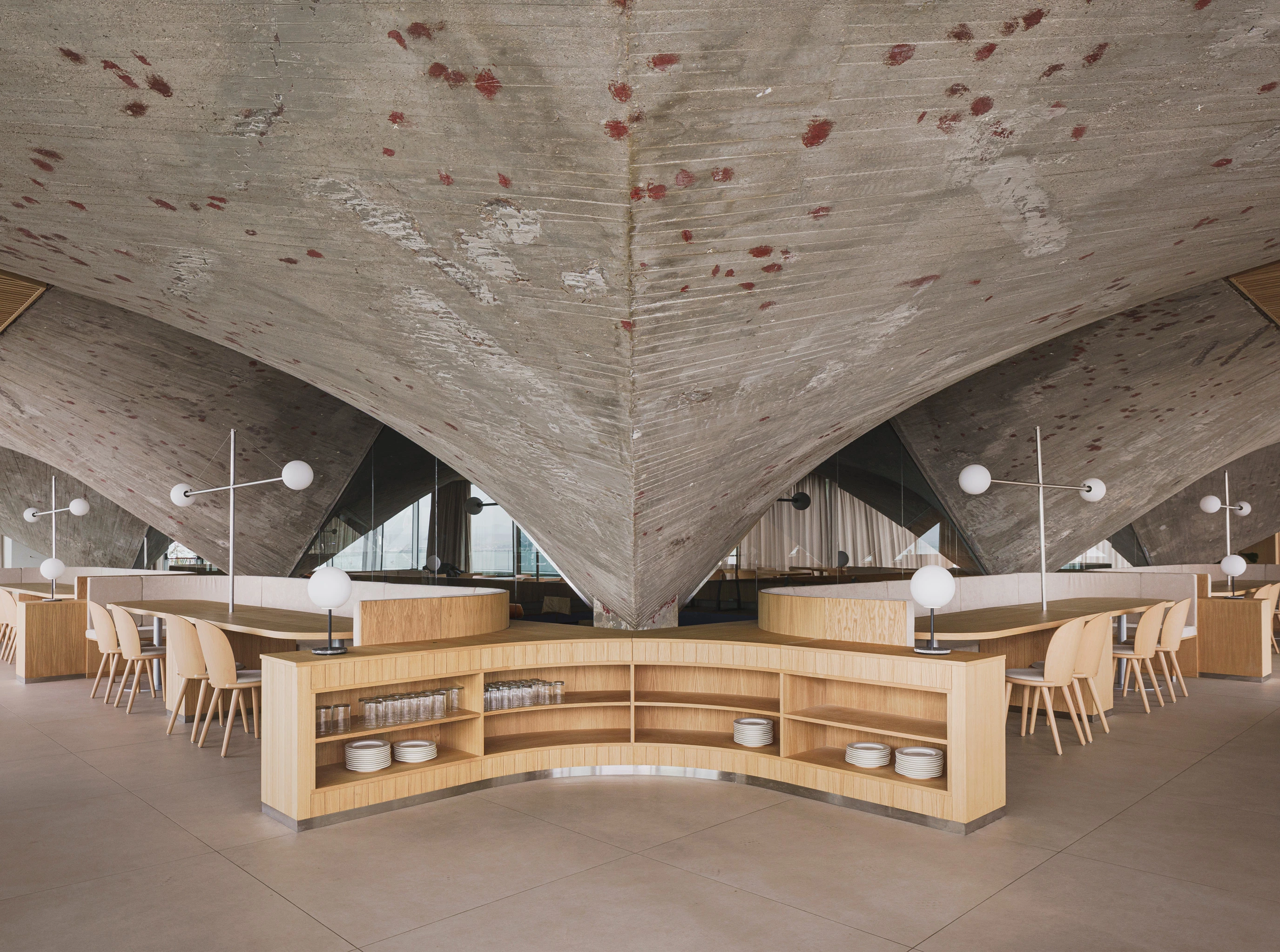 La intervención de Zooco Estudio incorpora un espacio para en la planta segunda del museo, que alberga el restaurante y terraza de este. El nuevo volumen soluciona patologías presentes en la cubierta y fachada del edificio. La morfología cuadrada de este cuerpo de hormigón resulta de la adición de cuatro triángulos que regularizan y completan en planta a los paraboloides de la construcción original. La crudeza de esta geometría se convierte en el elemento protagonista, enmarcada con falsos techos triangulares de madera.