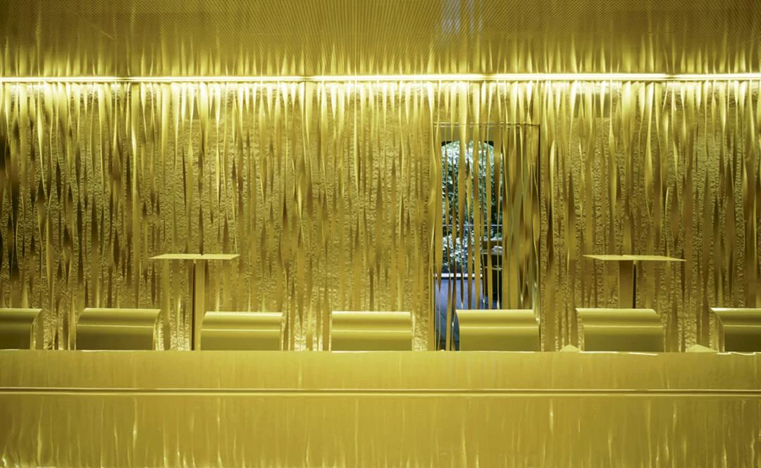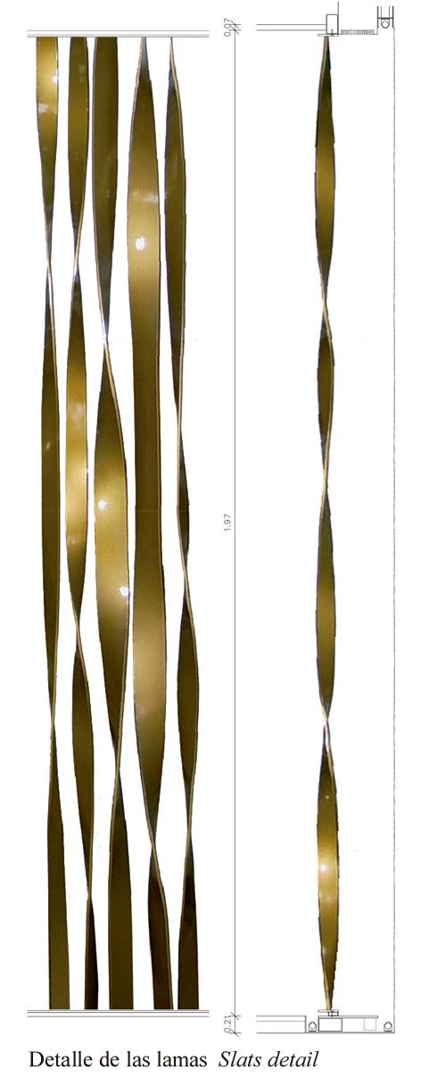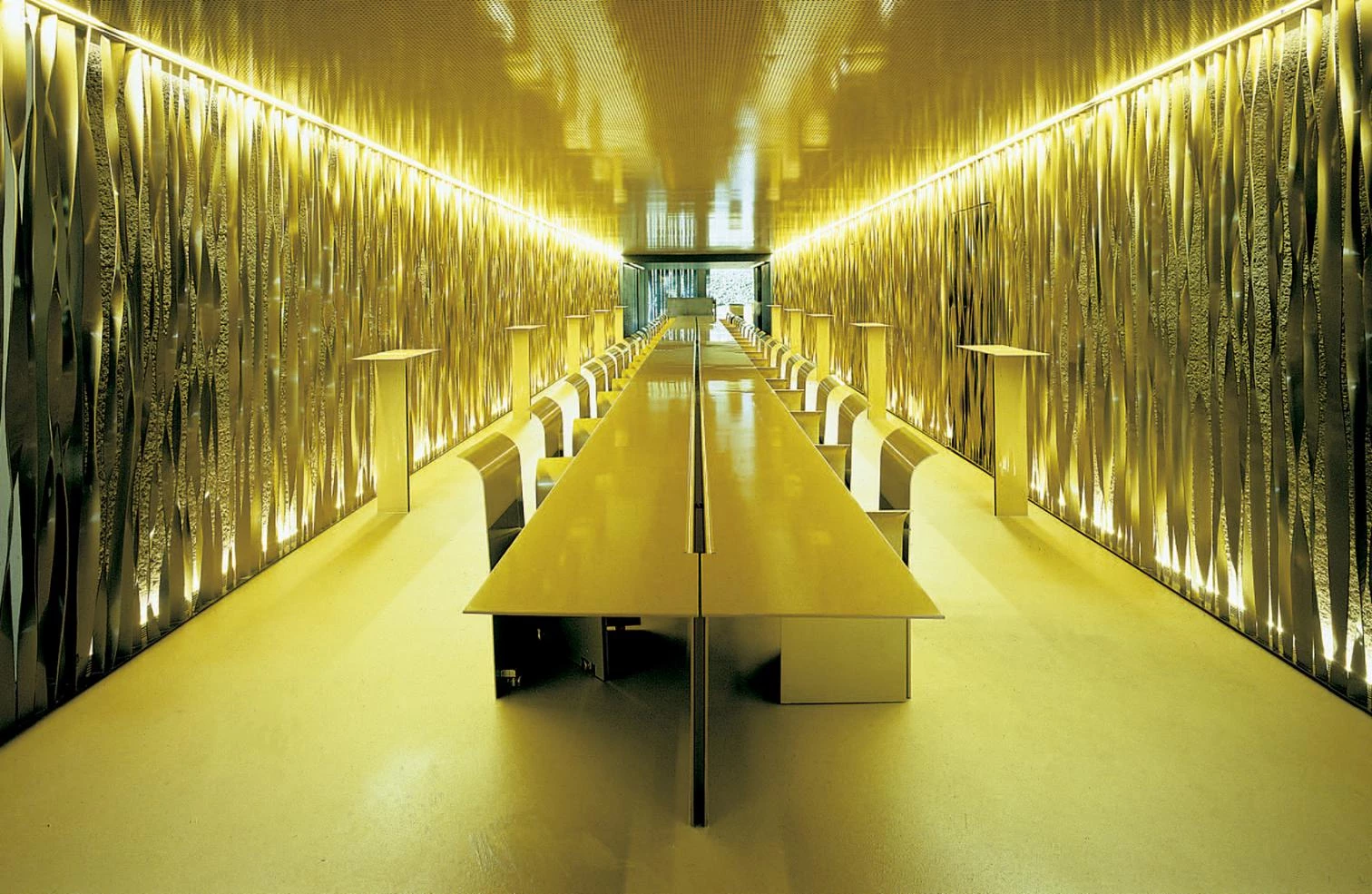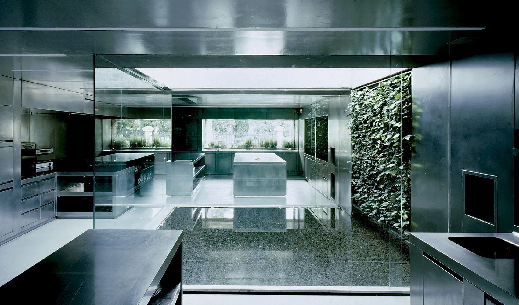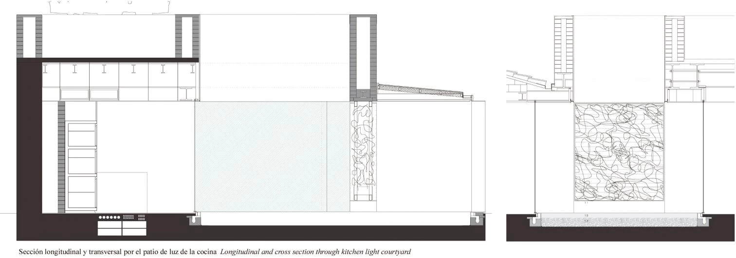 Así, la fachada norte avanza sobre el jardín para conformar un porche de acero y vidrio en el que unas lamas verticales retorcidas —que también recubren partes del interior— actúan como filtro visual. Mientras uno de los laterales se reconfigura para acoger las instalaciones y la cocina —concebida como un laboratorio de acero inoxidable y presidida por un patio acristalado—, la crujía central del conjunto se libera de particiones para situar el comedor principal, en torno a cuya gran mesa pueden acomodarse más de cuarenta comensales. Las otras dos naves y la fachada sureste se adaptan para situar comedores reservados, zonas de estar abiertas al jardín, despachos y aseos.