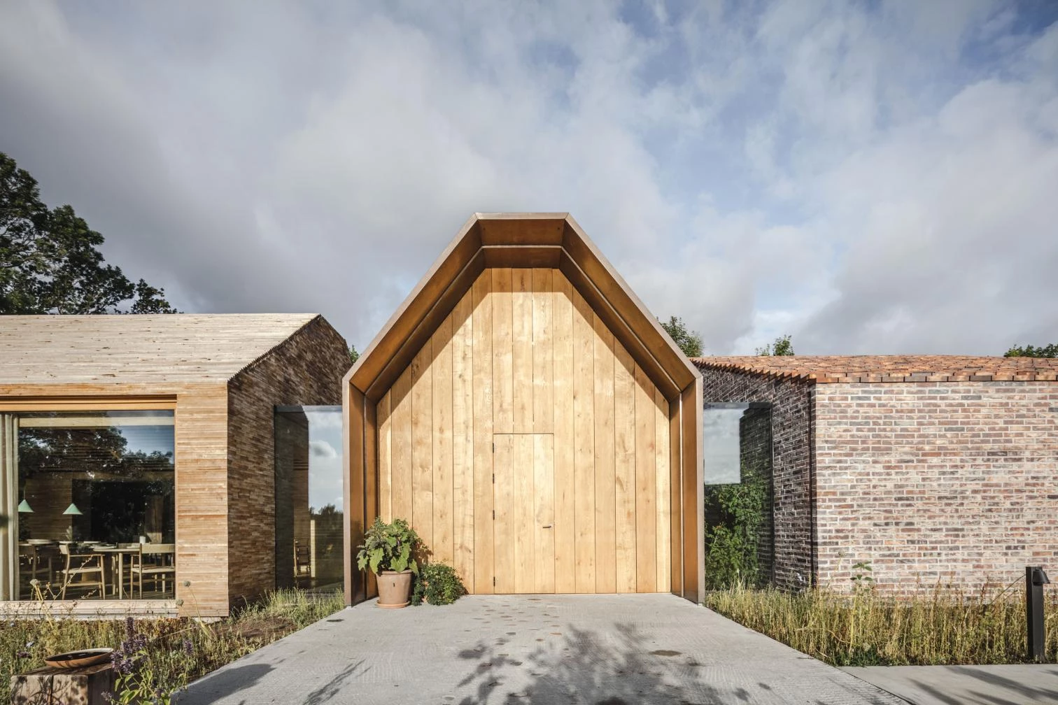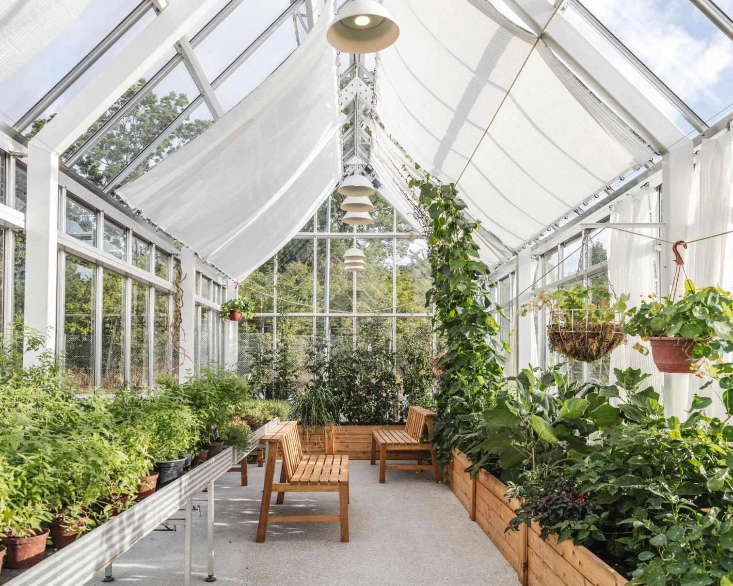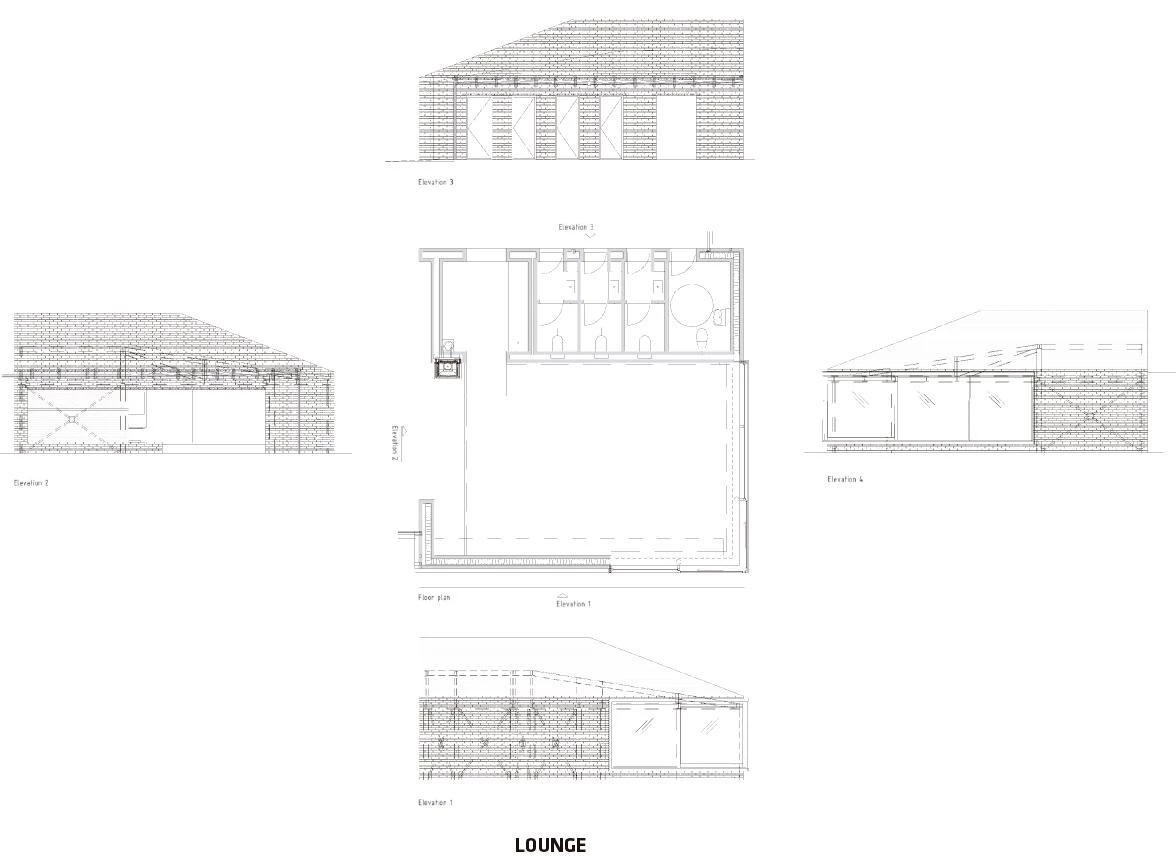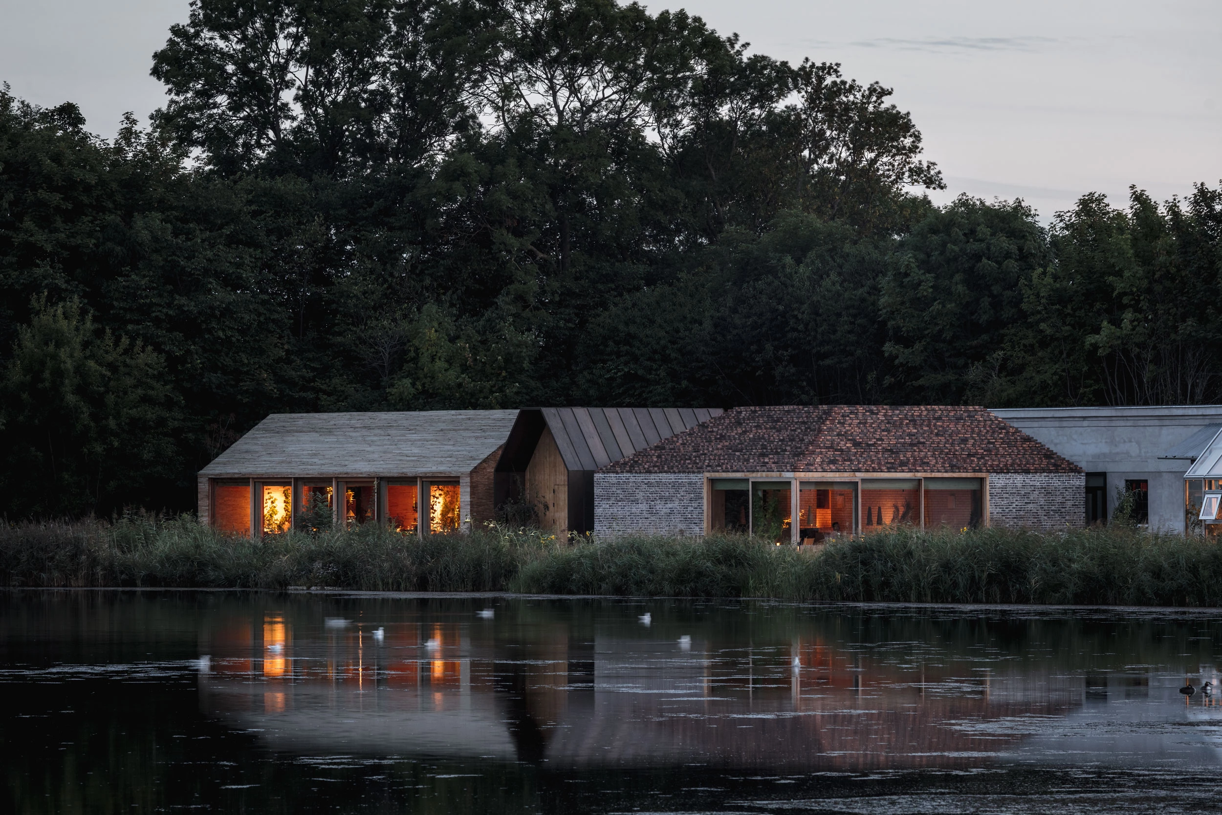 El heterogéneo conjunto, en el que se emplean diferentes materiales y técnicas constructivas, evoca la forma arquetípica de una villa ártica. También los interiores aluden a elementos vernáculos del imaginario nórdico: los comedores se envuelven con tableros de madera apilados que sugieren pilas de leña junto a la lumbre; la barbacoa se asemeja a un refugio en el bosque; y el lounge, acabado enteramente en ladrillo, puede leerse como una gran chimenea. Los umbrales entre los ‘edificios dentro del edificio’ se cubren con vidrio para introducir luz natural, lo que permite a los usuarios contemplar las variaciones atmosféricas a lo largo del día. El complejo se encuadra dentro de un cuidado jardín, diseñado en sintonía con los principios ecológicos de la permacultura, donde se encuentran tres invernaderos que contienen respectivamente un invernáculo, un horno, y una cocina-laboratorio dedicada al desarrollo de nuevos platos.