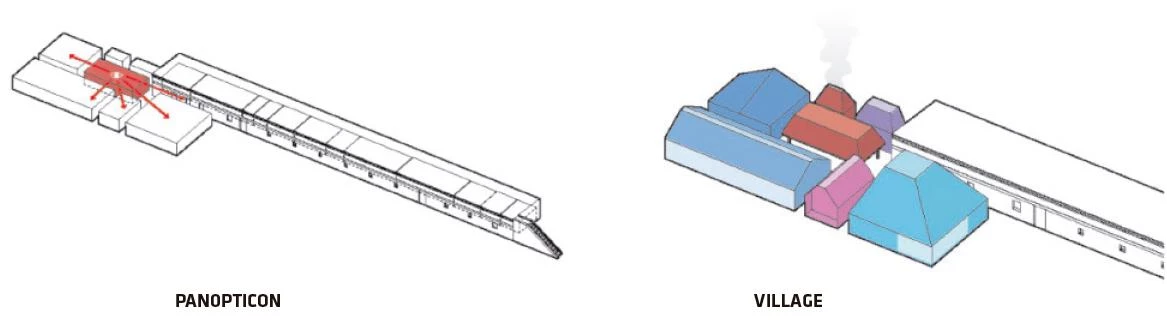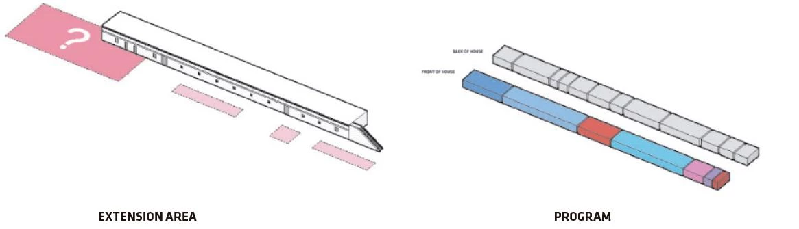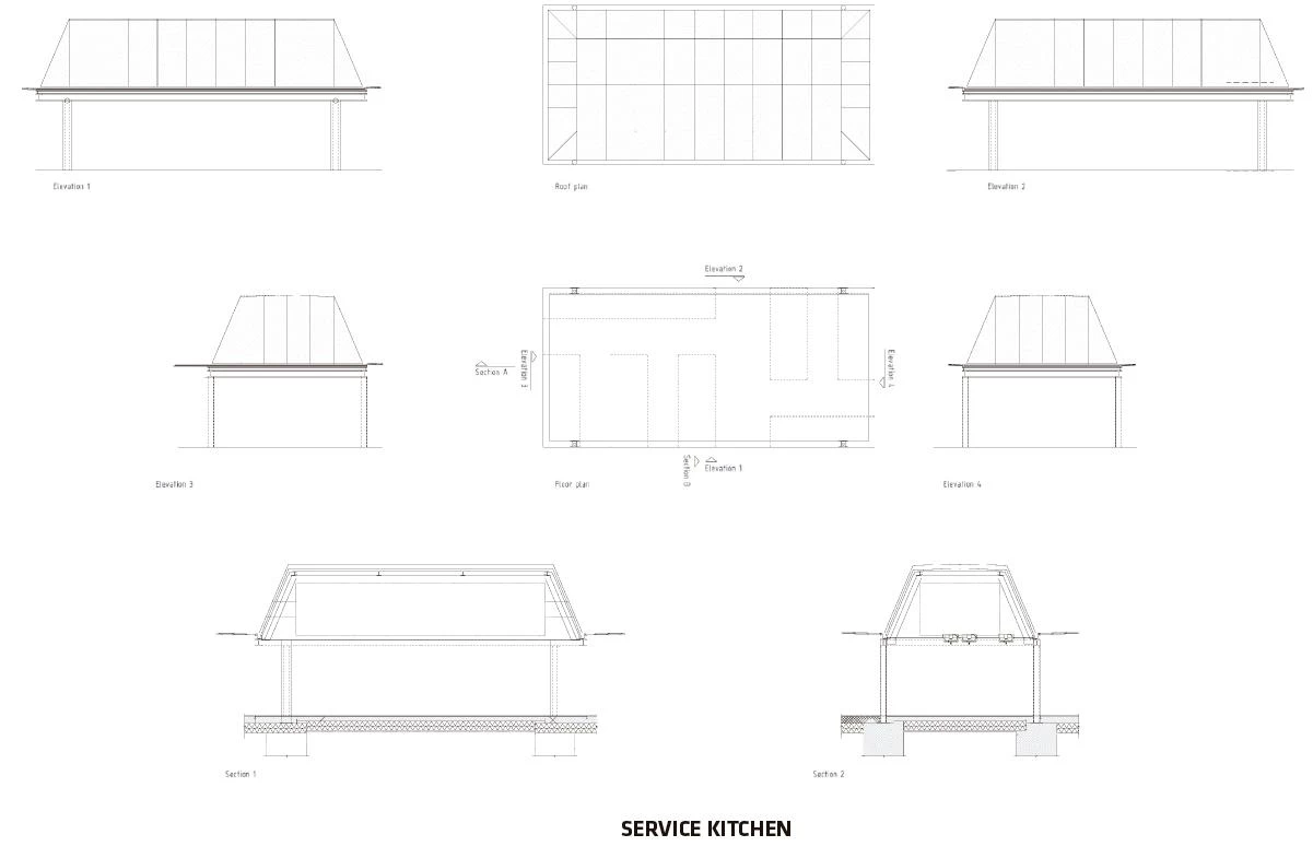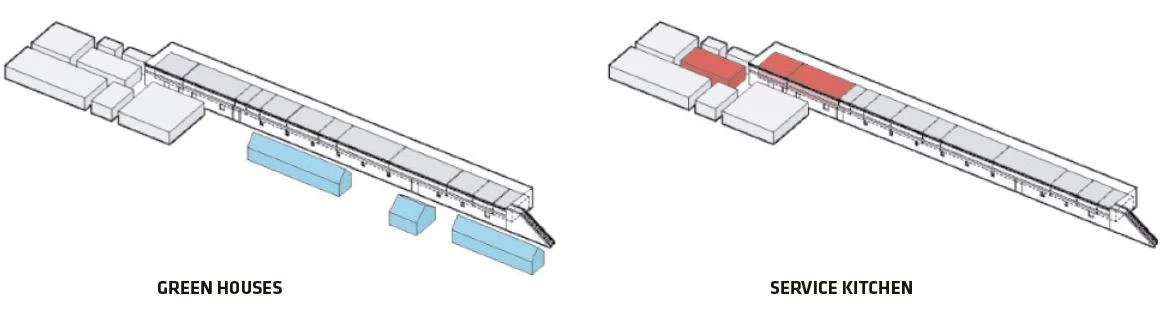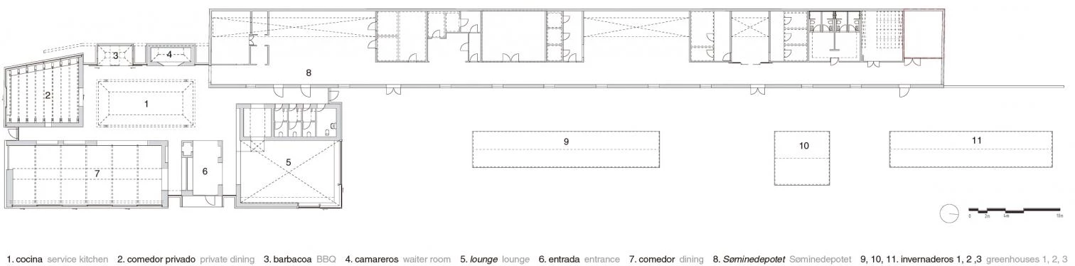 La propuesta debía conservar la nave existente, en la que la Real Armada de Dinamarca mantuvo un depósito de minas marinas. Además del edificio protegido, que debía restaurarse cuidadosamente, el proyecto podía ocupar el lugar de unas instalaciones anexas que habían sido construidas con posterioridad. Los procesos correspondientes al funcionamiento interno del restaurante se colocaron en una secuencia lineal dentro del Søminedepotet, mientras que los espacios relacionados con la experiencia directa del comensal se dispusieron en una serie de pabellones independientes en la superficie auxiliar disponible en el extremo sur del recinto. Esta idea remite a la organización tradicional de las granjas nórdicas —la sæter—, en las que las distintas labores se separan en edificaciones diseminadas por el paisaje. Así, partes como el vestíbulo de llegada, la zona de los vinos o la barbacoa se sitúan en siete volúmenes autónomos adaptados a las necesidades específicas de cada función. En la pieza central se coloca la cocina de los chefs, lo que facilita el control del desarrollo del servicio; del mismo modo, también los comensales pueden seguir las distintas fases del proceso.