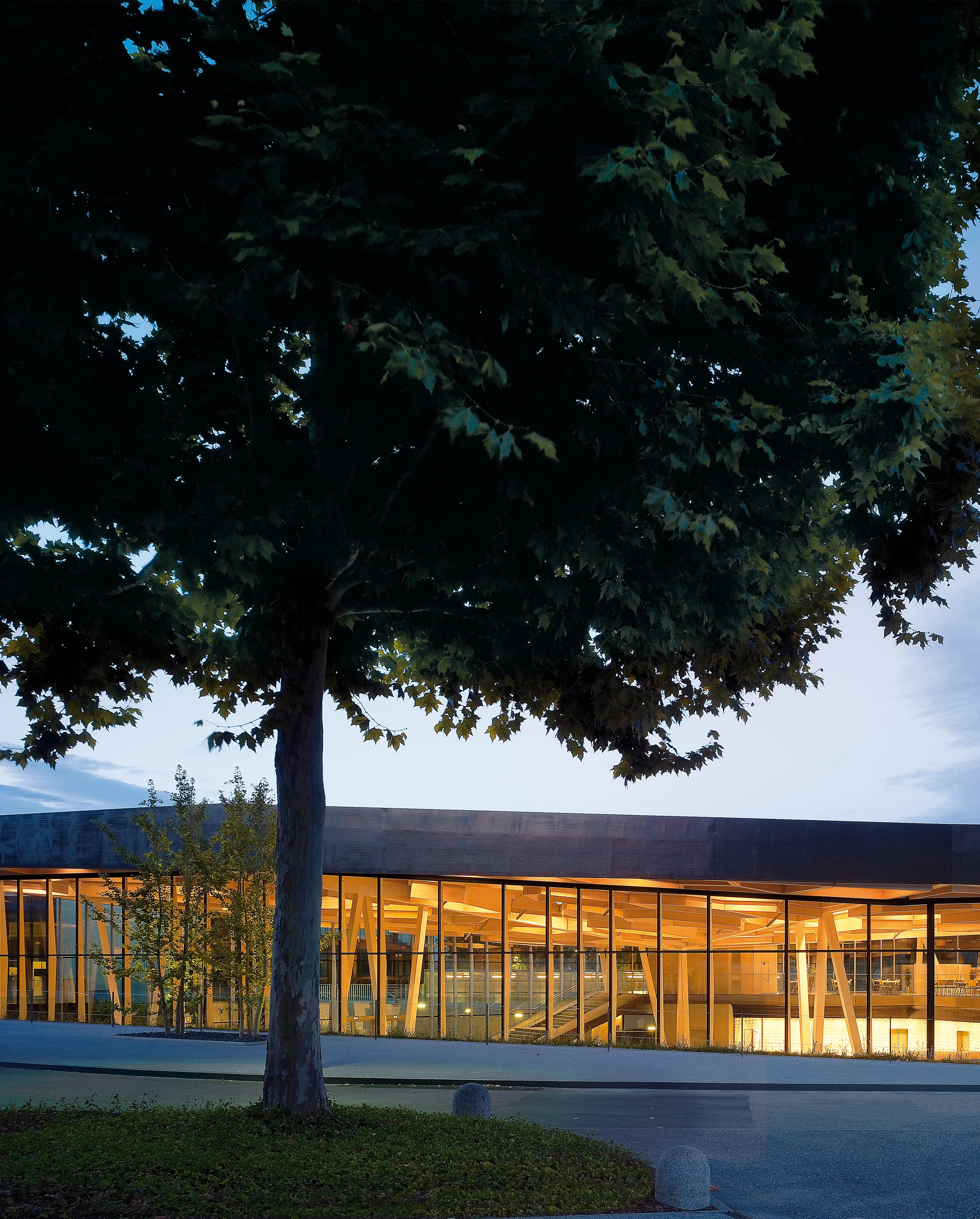Este pabellón proporciona una nueva cafetería y espacio multiusos para el campus industrial de la empresa Trumpf en Stuttgart. Localizado al este del complejo, es el nuevo centro social de la compañía, tanto para los trabajadores ‘de cuello azul’ como para los administrativos y directivos. El pabellón se sitúa entre la nueva garita de entrada y la autovía A81, formando parte de la secuencia de entrada al recinto. Como extensión geométrica de las salas de exposiciones y auditorio —todos ellos de planta poligonal— emplazados en la planta de acceso del centro de atención al cliente y situado en paralelo a la autovía, el pabellón Blautopf contribuye a crear un patio de acceso para los clientes y visitantes. El edificio está planteado como un pabellón exento —a diferencia de las vecinas naves industriales, en continua ampliación—, favoreciendo su visibilidad dentro del conjunto, como corresponde a su función representativa. El interior ofrece 700 plazas, permitiendo a los 2.000 empleados de la fábrica almorzar en tres turnos. La planta consiste en un gran espacio central más una galería elevada donde se sitúan las mesas reservadas. En caso de eventos, el espacio funciona como un auditorio de 800 plazas. La cubierta alberga una superficie de 5.400 metros cuadrados, de los cuales 1.000 se encuentran en la entreplanta abierta a una terraza.