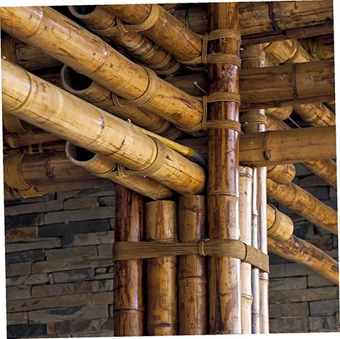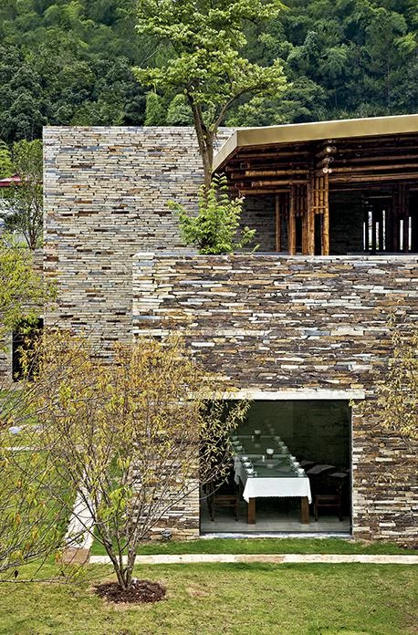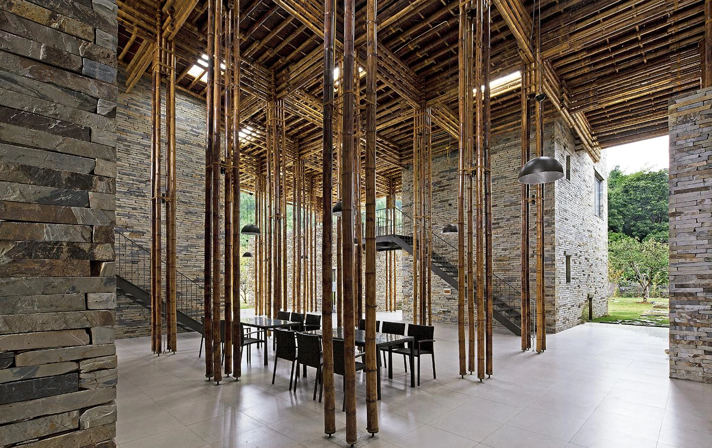 Debido a que la compleja orografía del terreno dificulta el acceso por carretera, en la propuesta se emplean materiales, técnicas y trabajadores locales. Además, las condiciones climáticas determinan la configuración espacial del proyecto. Durante la época del monzón, húmeda y calurosa, ocho volúmenes de diferentes alturas y construidos con muros de piedra local dotan al conjunto de espacios climatizados. En los meses de la estación seca, un gran espacio exterior alberga el comedor principal, protegido por una ligera pérgola de bambú que se apoyada sobre diez vigas y 96 columnas formadas cada una de ellas por cuatro cañas de luong, una especie autóctona que crece hasta los ocho metros de altura.