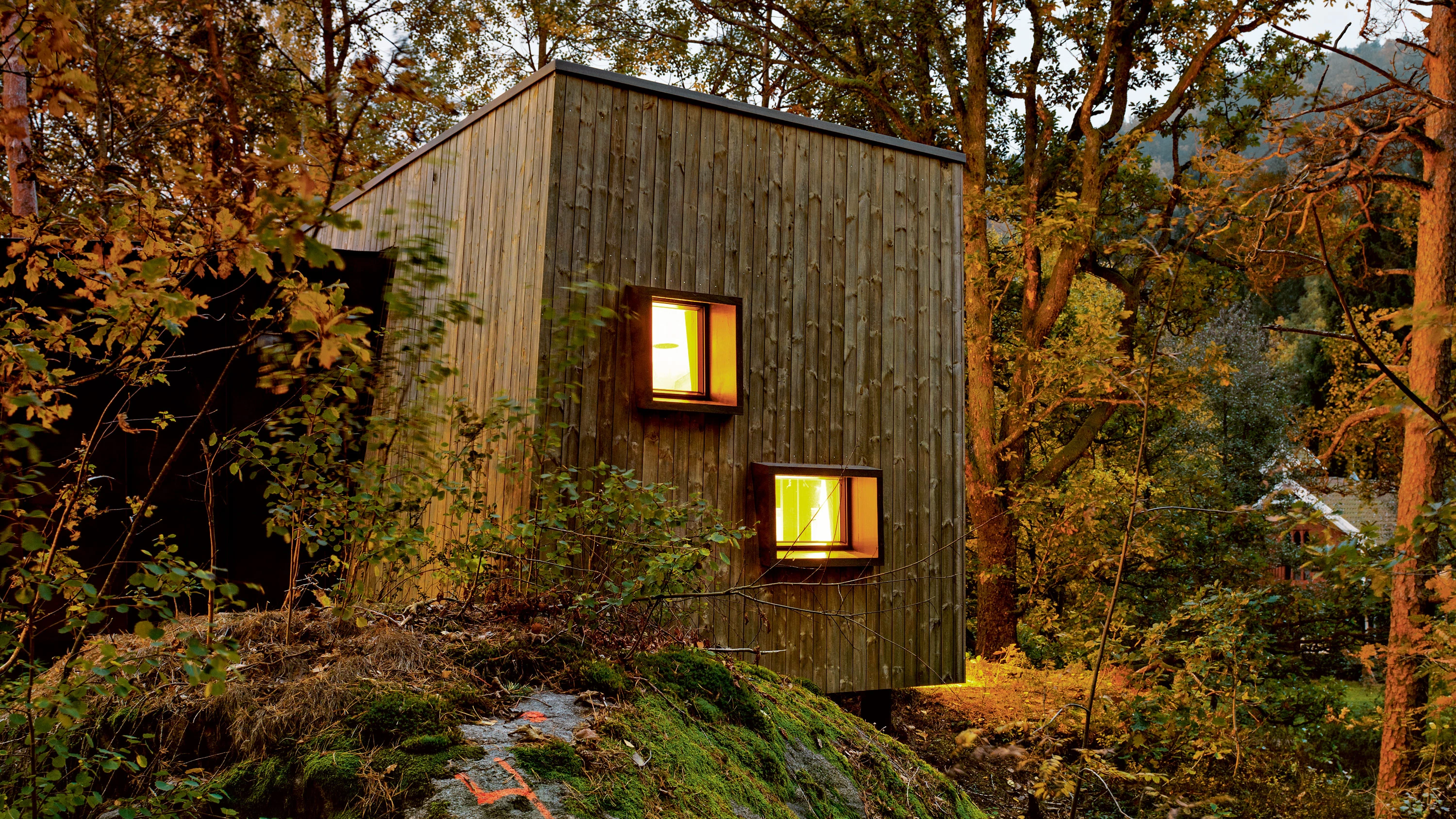 En un tranquilo bosque, a poca distancia a pie de dos de los hospitales más grandes de Noruega, se han levantado dos pequeñas construcciones de madera que aspiran a facilitar la hospitalización de los pacientes y sus familias. Diseñados por encargo de la Fundación Friluftssykehuset (en colaboración con el Departamento de Psicosomática y Psiquiatría Infantil del Hospital Universitario de Oslo) estos refugios ofrecen a los visitantes un respiro físico y psicológico de los estrictos regímenes de tratamiento y el aislamiento que a menudo siguen a una hospitalización de largo plazo. Los espacios de apenas 35 metros cuadrados contrastan con los monumentales edificios hospitalarios a los que están afiliados. Cada cabina consta de una habitación principal, otra más pequeña para terapias, y un baño. El interior se reviste completamente de roble, evocando de la materialidad de los bosques que lo rodean. Dentro, un conjunto de almohadones coloridos permite a los niños construir cabañas o acostarse para mirar a través del lucernario circular de la sala principal. Las grandes ventanas de vidrio de la cabina se pueden abrir por completo, invitando a la naturaleza al espacio. De esta manera, los visitantes pueden asomarse al bosque, olerlo y escuchar el rumor del agua del arroyo cercano...[+]