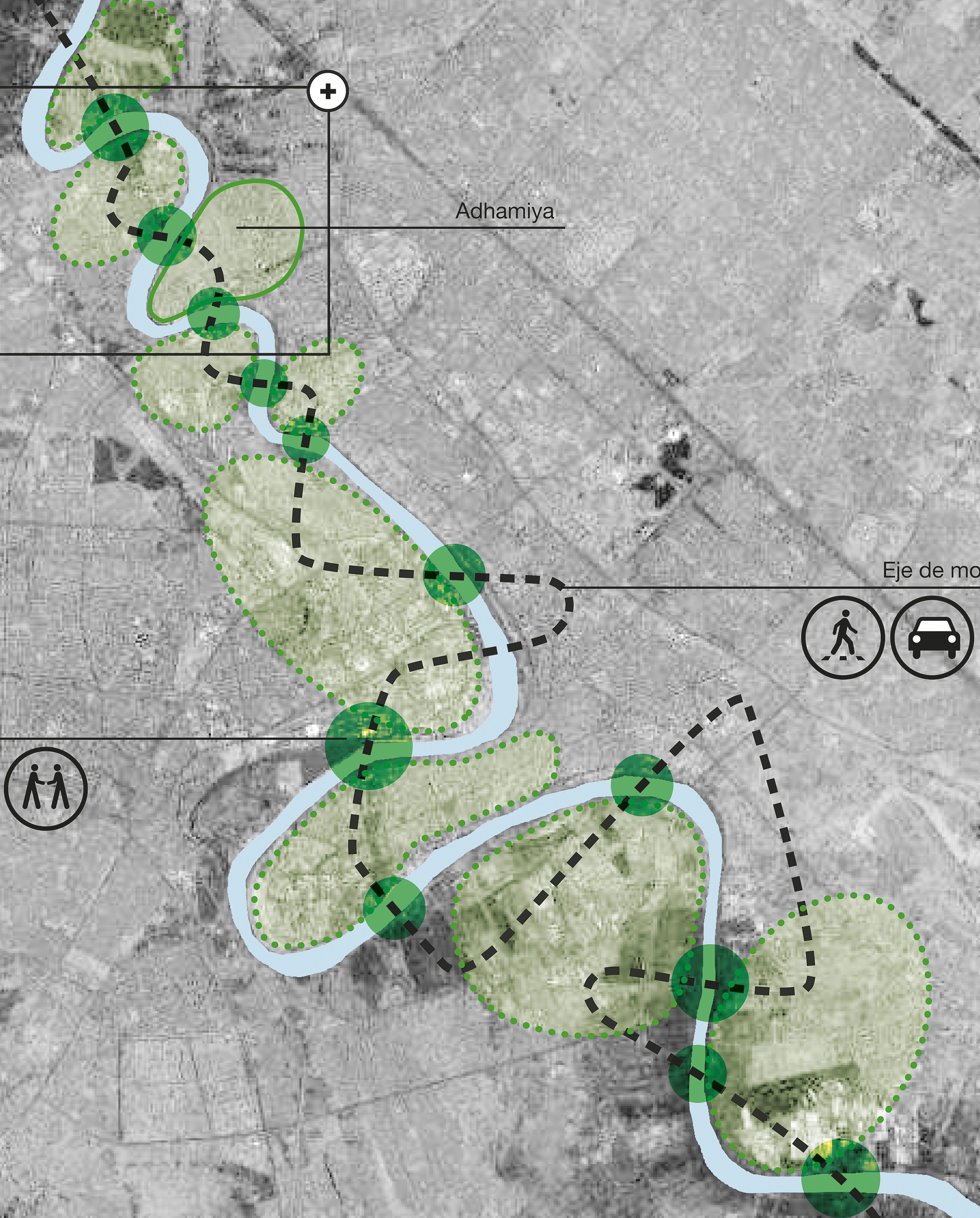 Tras la destrucción que azotó la ciudad hasta el otoño de 2007, los esfuerzos actuales de la administración se centran en restablecer la vida de este barrio situado a orillas del río Tigris en el centro de Bagdad. El proyecto de rehabilitación integral presentado por los barceloneses AV62 para las 490 hectáreas del distrito propone un modelo de intervención en dos escalas: territorialmente las acciones atienden a la mejora de la red de transporte y equipamientos metropolitanos; en Adhamiya la actuación se concentra en la mejora de las condiciones urbanas interiores y la reconstrucción de los puentes que comunican con otros vecindarios. Estas conexiones aspiran a convertirse en espacios de reencuentro para grupos sociales anteriormente enfrentados...[+]