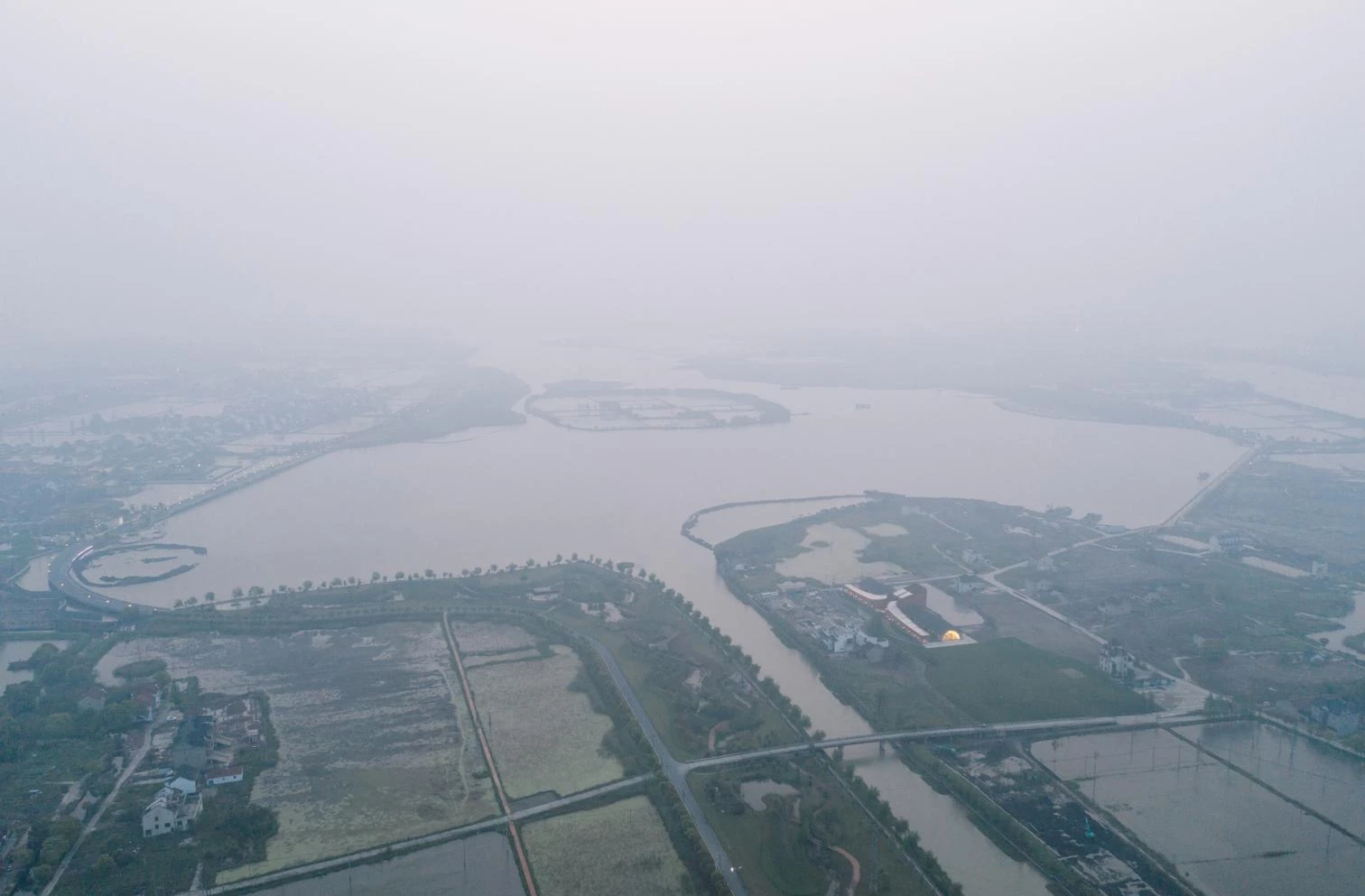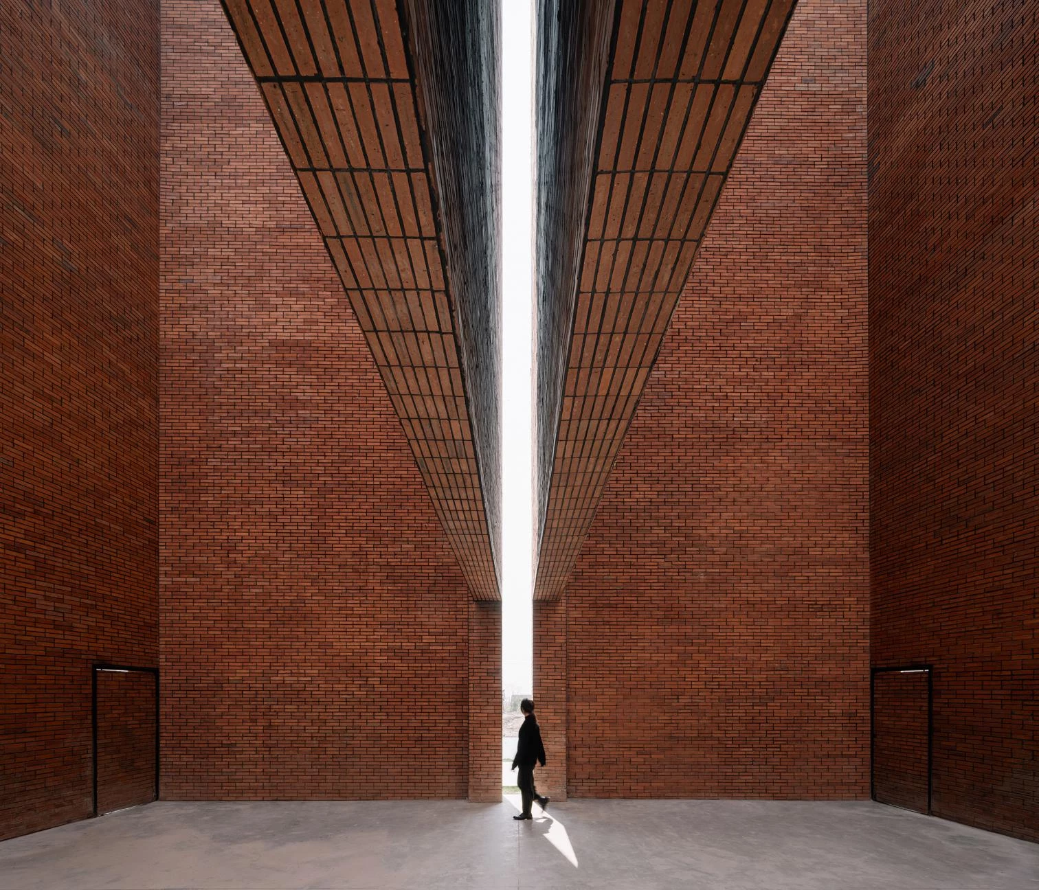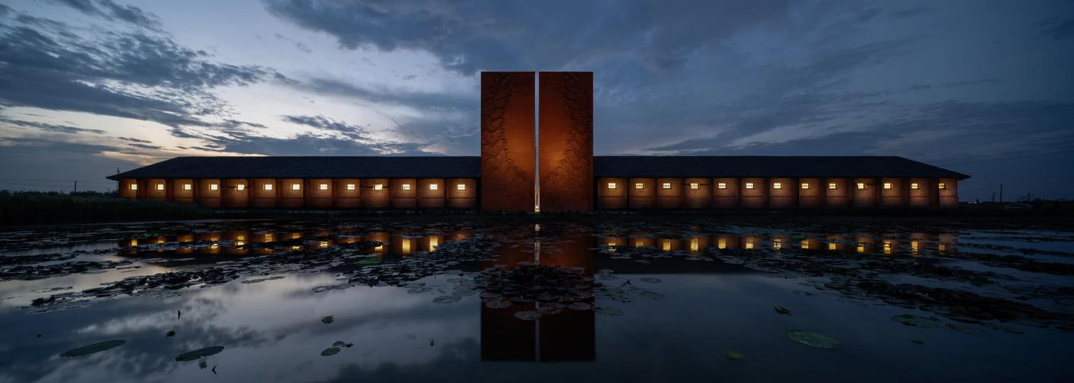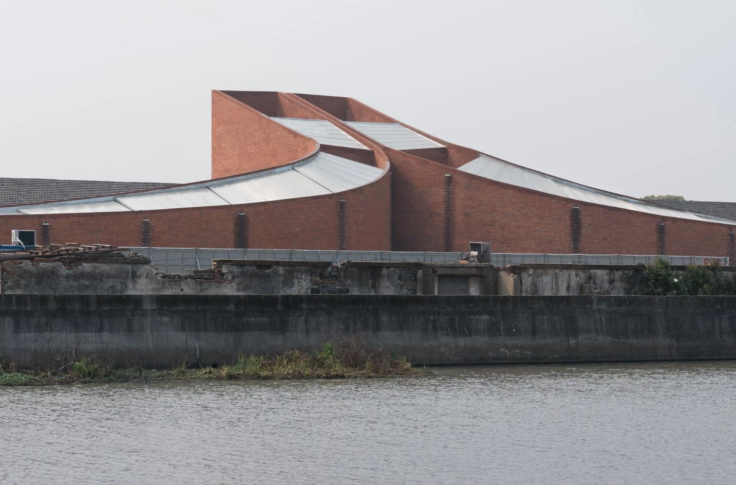 En un paraje pantanoso a las afueras de Shanghái, un nuevo espacio expositivo ocupa dos graneros en desuso que se prolongan en sendas alas dispuestas con radical simetría.