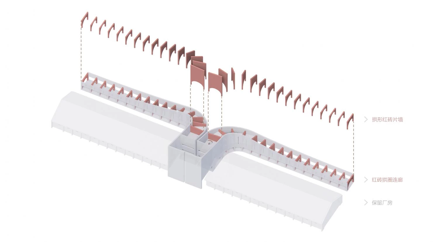 Al igual que en las naves originales, en las fachadas se emplea un tradicional aparejo de ladrillo, mientras que en el interior el ritmo de las cuadernas estructurales se continúa con arcos de hormigón que crean un espacio fluido y versátil.