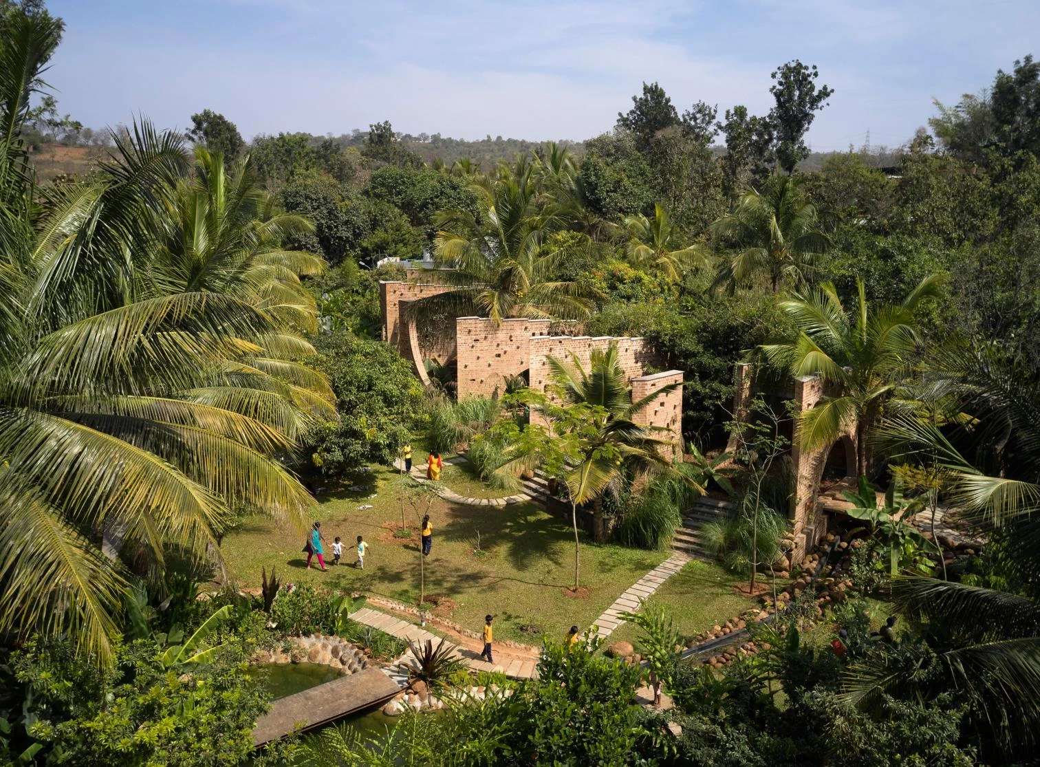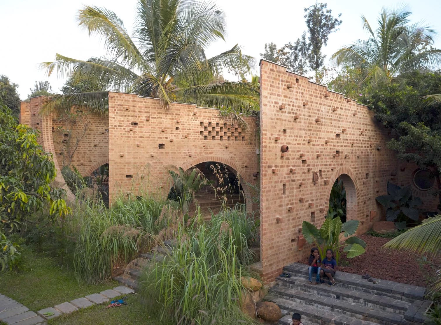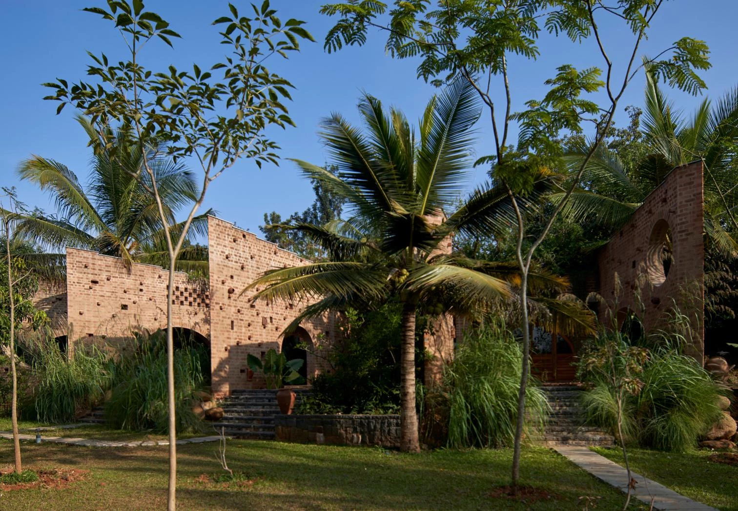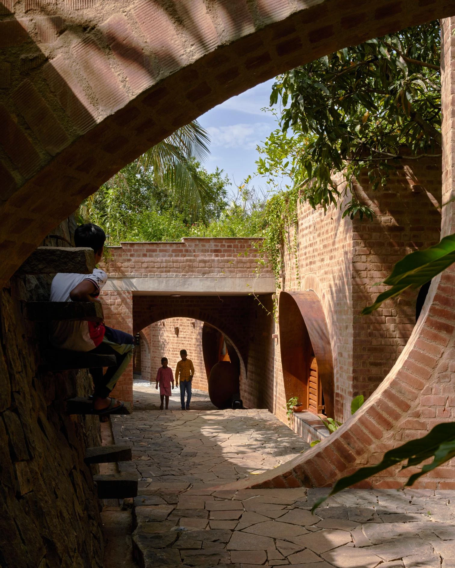 En un terreno donde se cultivan frutales, arcos de diferentes tamaños y muros de ladrillo asoman entre la densa vegetación, semejando restos de una construcción abandonada en estado de ruina. A las afueras de Kaggalipura, un pequeño pueblo situado a 40 kilómetros de la ciudad de Bangalore, la capital del estado de Karnataka, se encuentra esta nueva construcción que, aprovechando el desnivel topográfico, se integra en el paisaje. La firma india A Threshold —dirigida por Avinash Ankalge y Harshith Nayak— configura y alterna equilibradamente espacios construidos y no construidos que se complementan. Este centro público flexible está destinado a albergar diferentes actividades y eventos de la comunidad local: aulas escolares, talleres para artesanos o alojamientos. Los materiales utilizados —ladrillos, piedras y hormigón solo para los forjados— y los trabajadores —albañiles y artesanos— son de origen local.