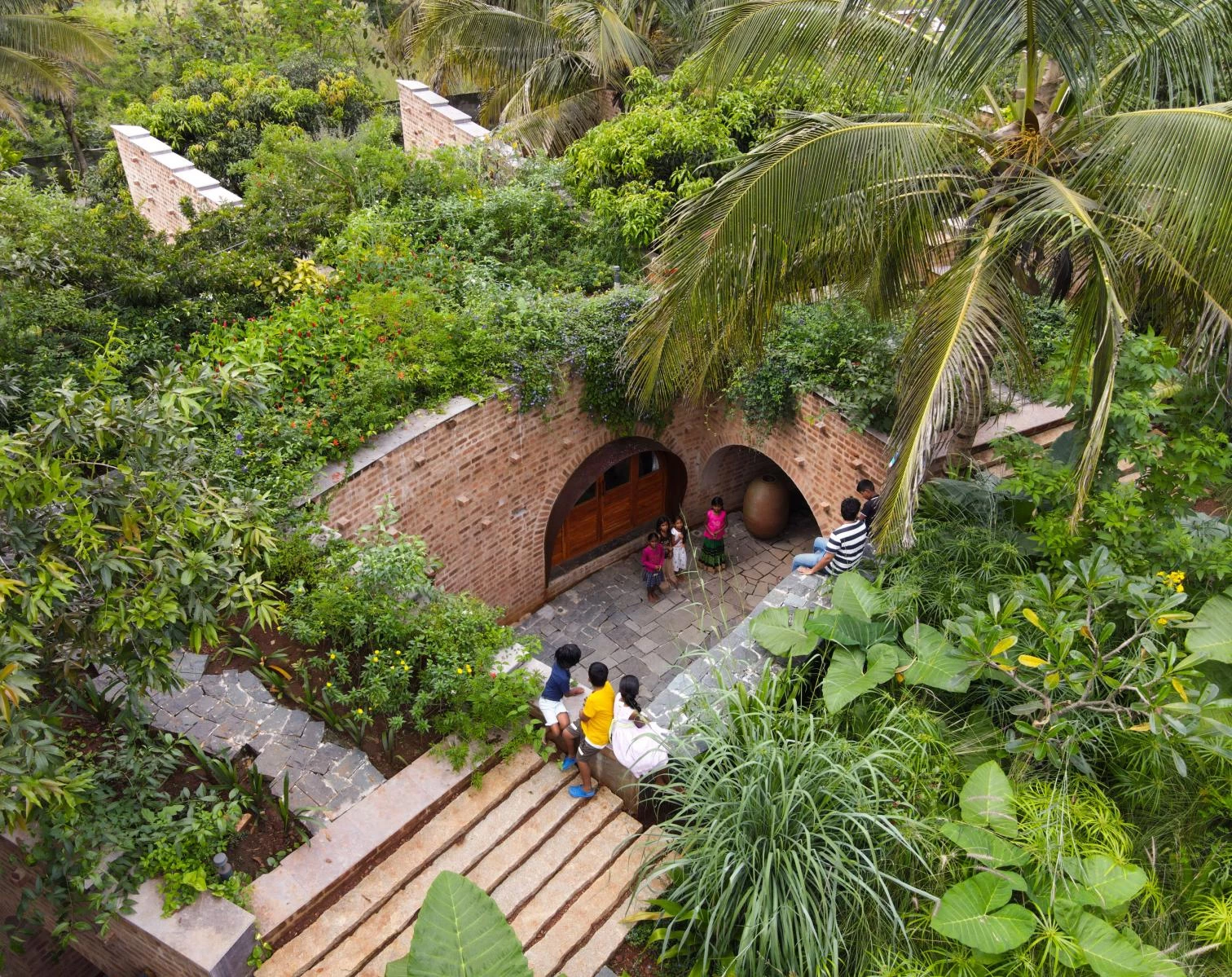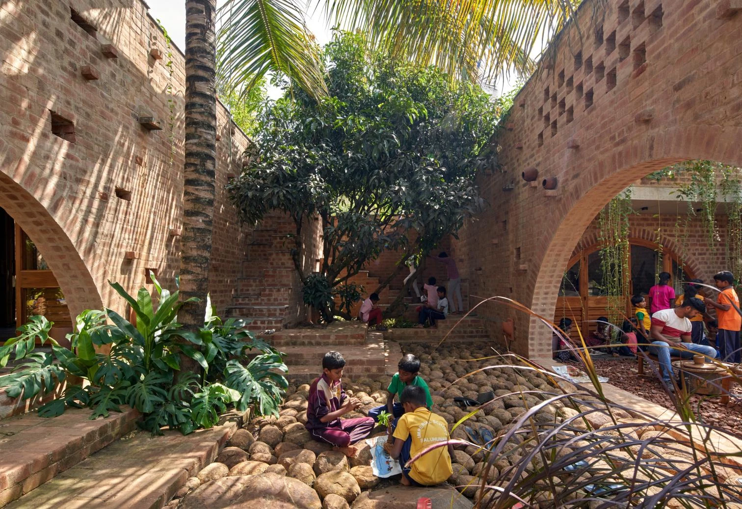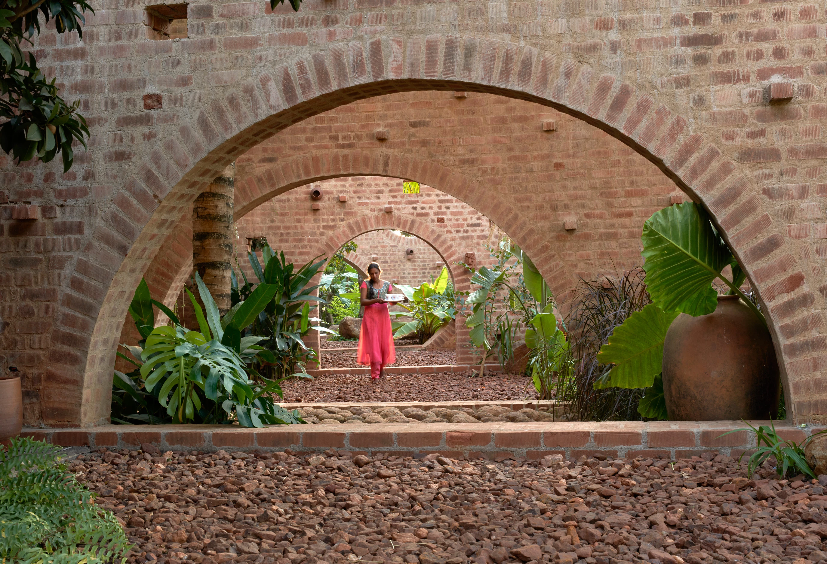 En un terreno donde se cultivan frutales, arcos de diferentes tamaños y muros de ladrillo asoman entre la densa vegetación, semejando restos de una construcción abandonada en estado de ruina. A las afueras de Kaggalipura, un pequeño pueblo situado a 40 kilómetros de la ciudad de Bangalore, la capital del estado de Karnataka, se encuentra esta nueva construcción que, aprovechando el desnivel topográfico, se integra en el paisaje. La firma india A Threshold —dirigida por Avinash Ankalge y Harshith Nayak— configura y alterna equilibradamente espacios construidos y no construidos que se complementan. Este centro público flexible está destinado a albergar diferentes actividades y eventos de la comunidad local: aulas escolares, talleres para artesanos o alojamientos. Los materiales utilizados —ladrillos, piedras y hormigón solo para los forjados— y los trabajadores —albañiles y artesanos— son de origen local.