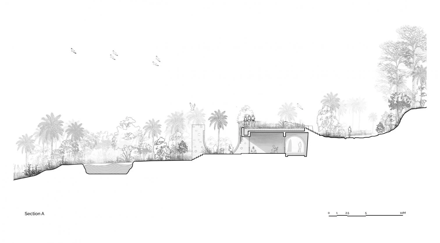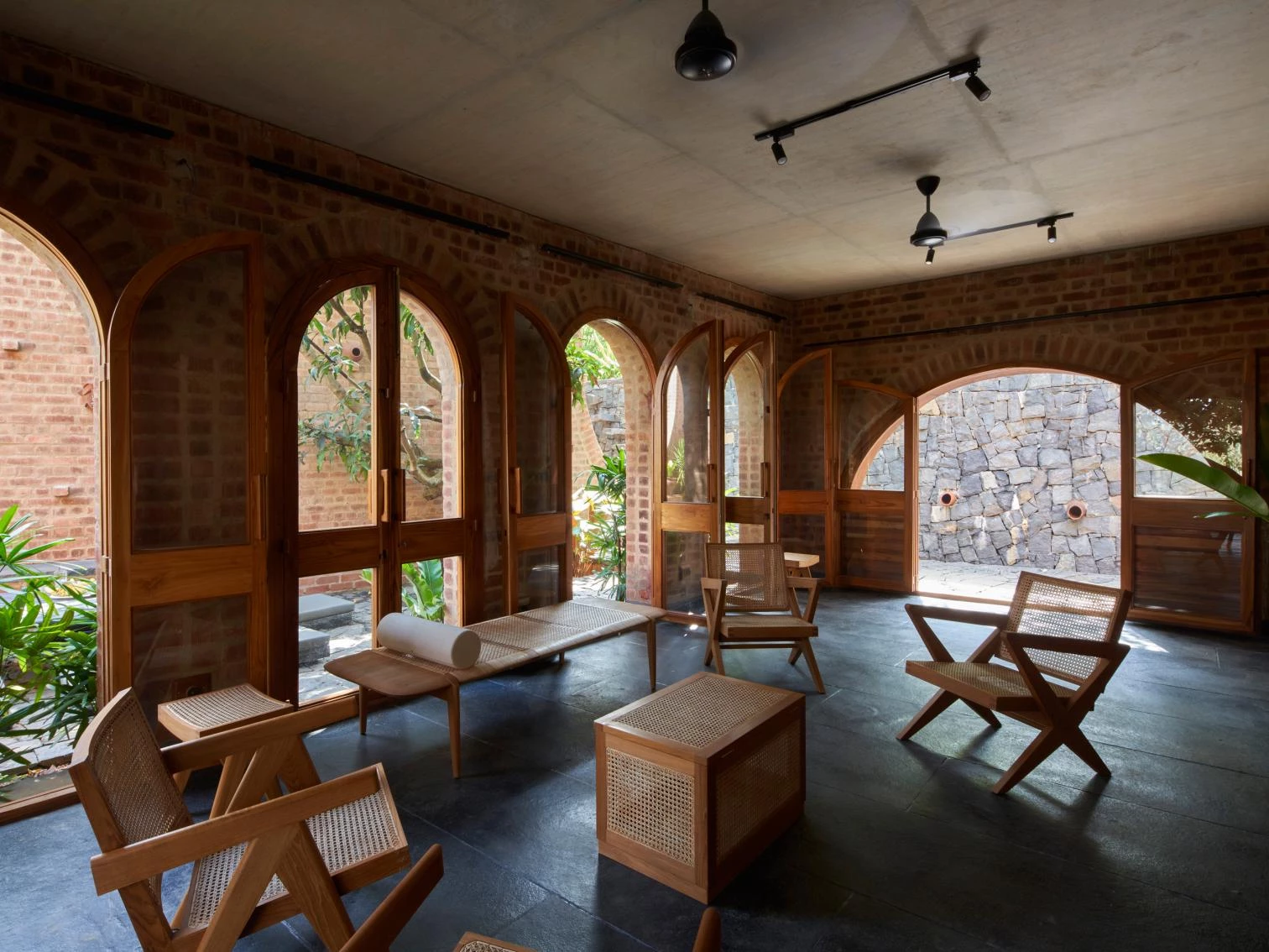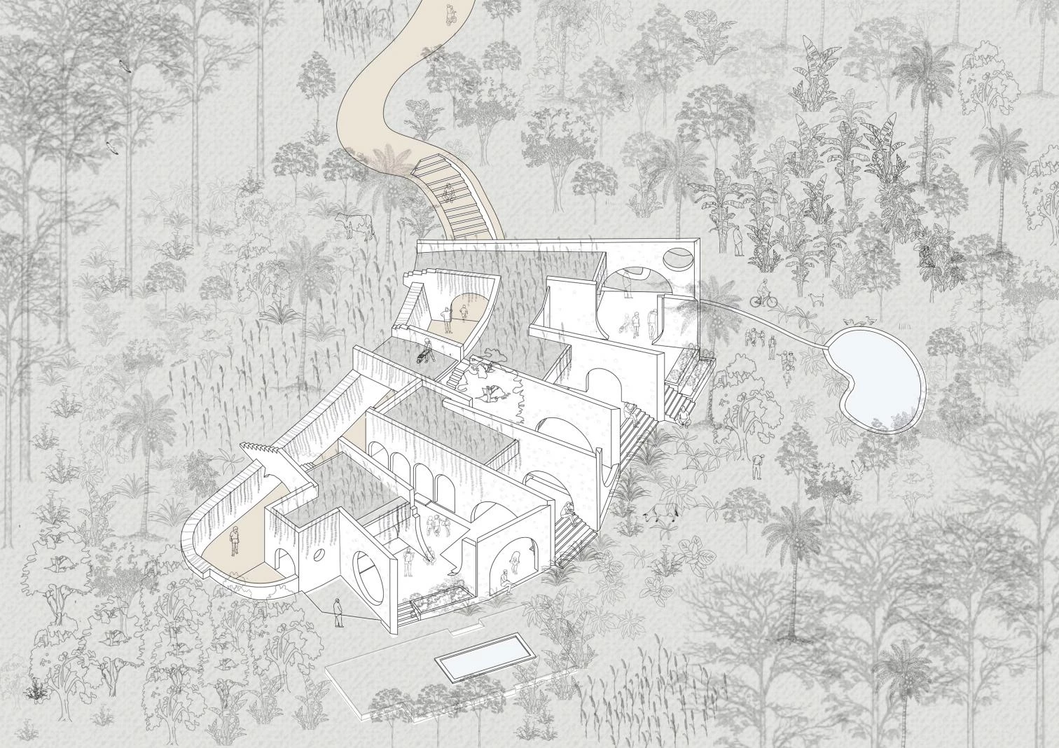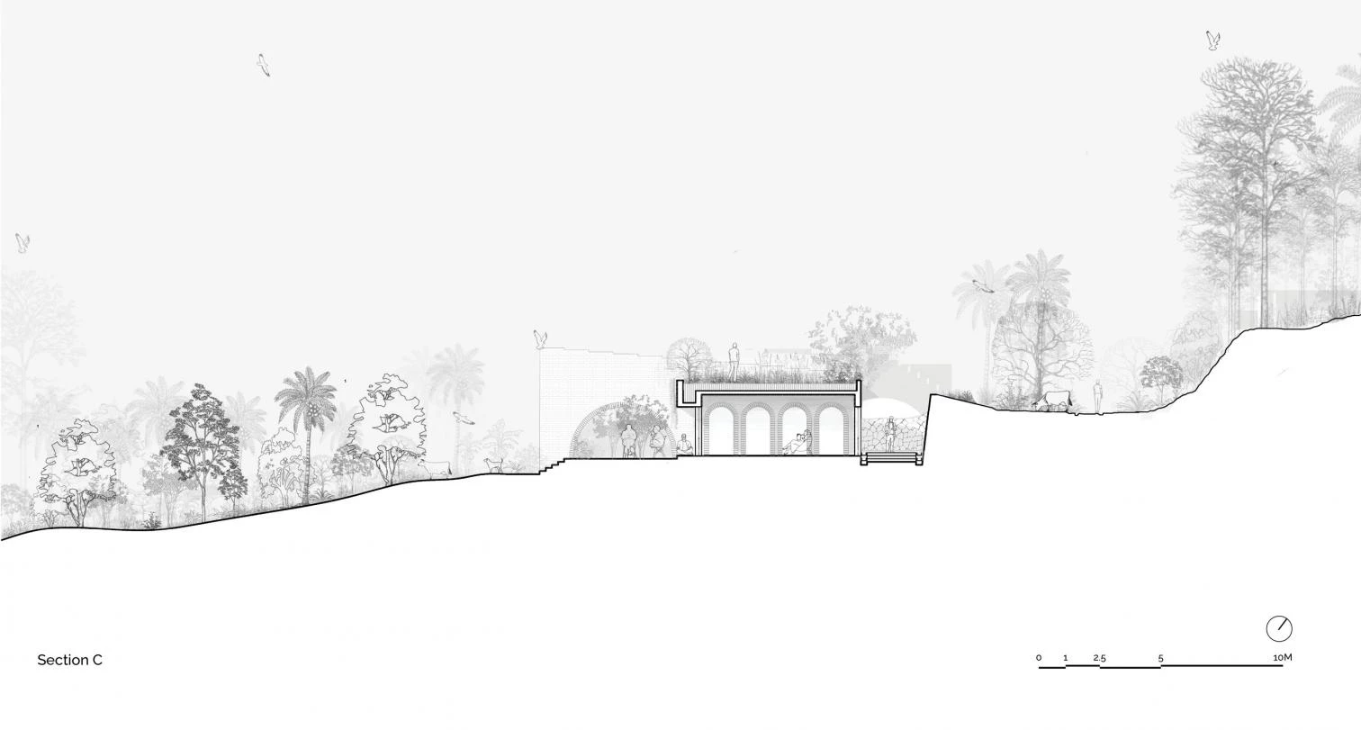 En un terreno donde se cultivan frutales, arcos de diferentes tamaños y muros de ladrillo asoman entre la densa vegetación, semejando restos de una construcción abandonada en estado de ruina. A las afueras de Kaggalipura, un pequeño pueblo situado a 40 kilómetros de la ciudad de Bangalore, la capital del estado de Karnataka, se encuentra esta nueva construcción que, aprovechando el desnivel topográfico, se integra en el paisaje. La firma india A Threshold —dirigida por Avinash Ankalge y Harshith Nayak— configura y alterna equilibradamente espacios construidos y no construidos que se complementan. Este centro público flexible está destinado a albergar diferentes actividades y eventos de la comunidad local: aulas escolares, talleres para artesanos o alojamientos. Los materiales utilizados —ladrillos, piedras y hormigón solo para los forjados— y los trabajadores —albañiles y artesanos— son de origen local.