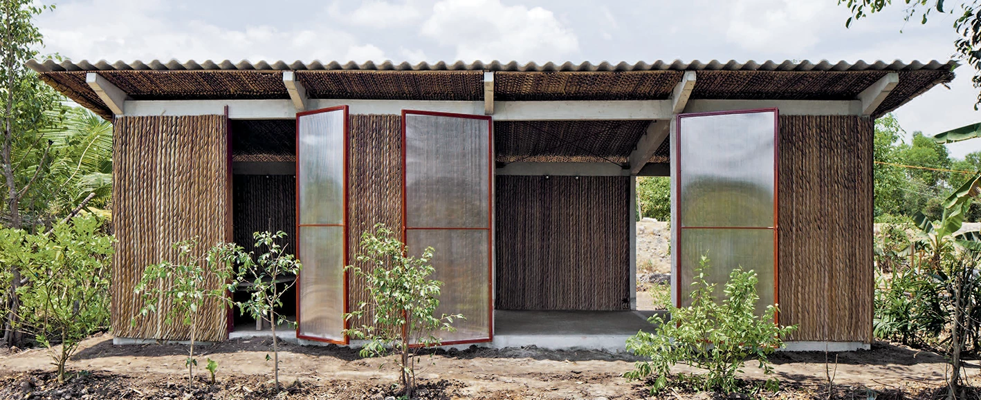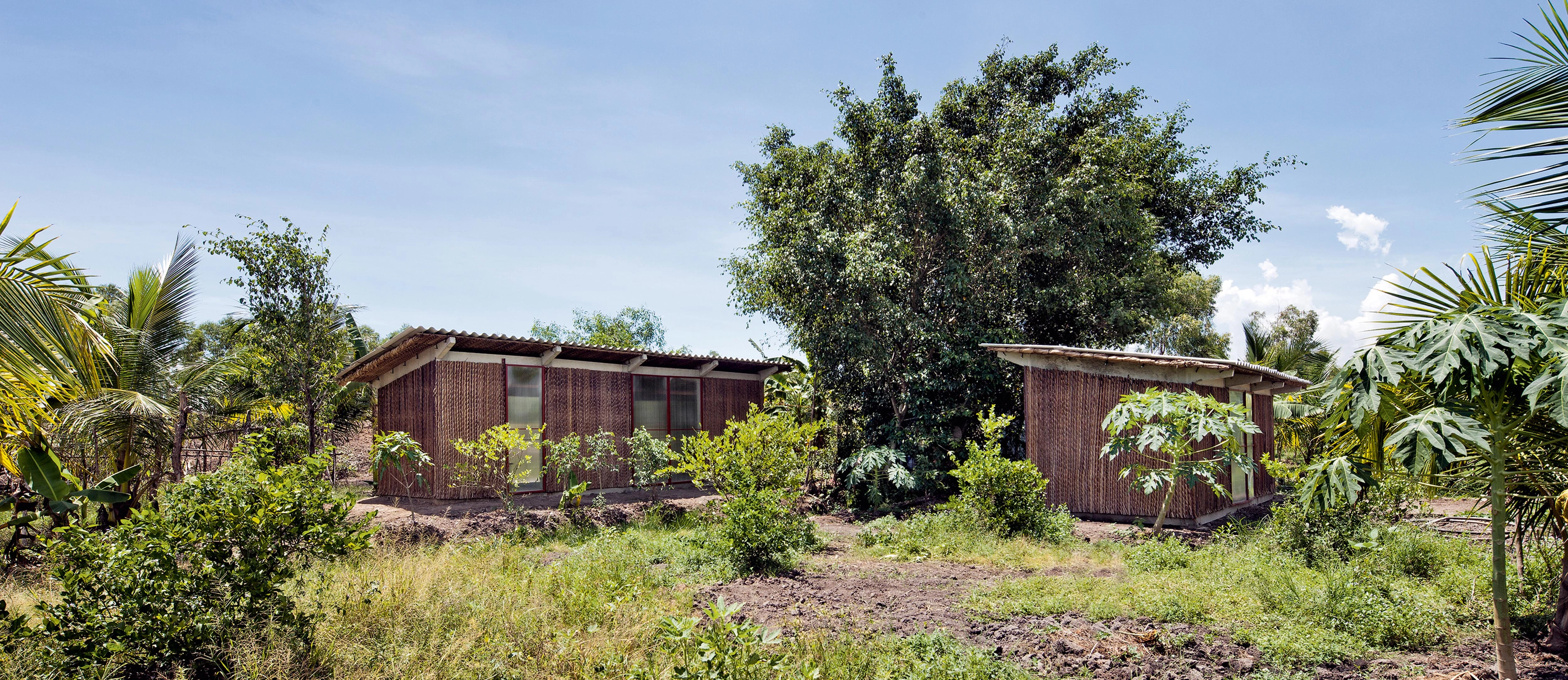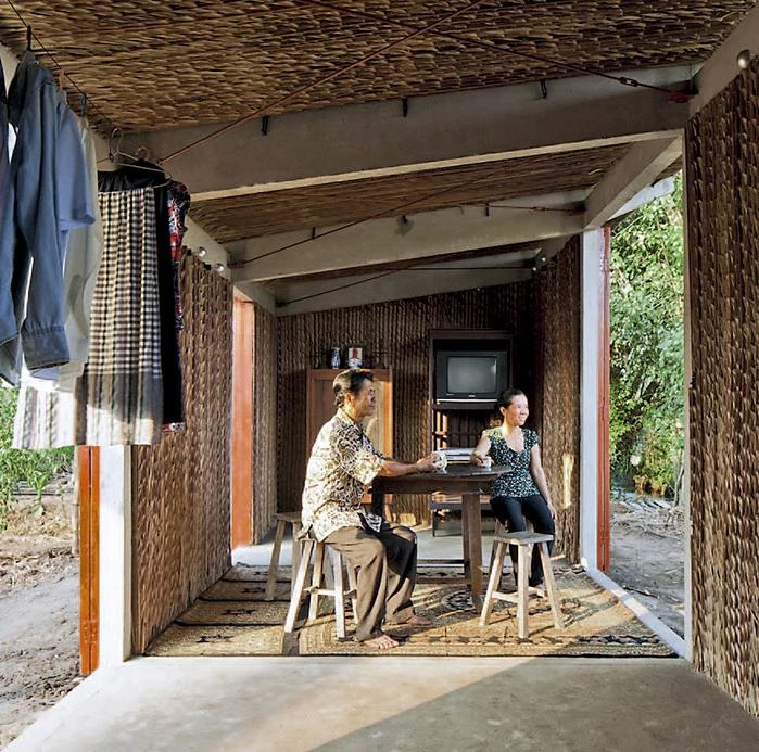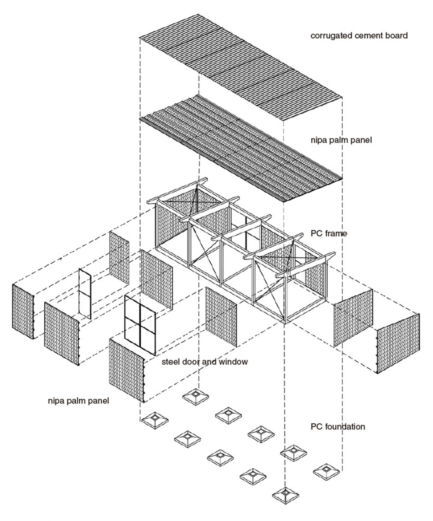La ligereza del esqueleto, de elementos modulares prefabricados de hormigón, al que el usuario atornilla paneles de palma de nipa y policarbonato, hace posible prescindir de grandes cimentaciones, y permite su transporte en pequeños barcos.