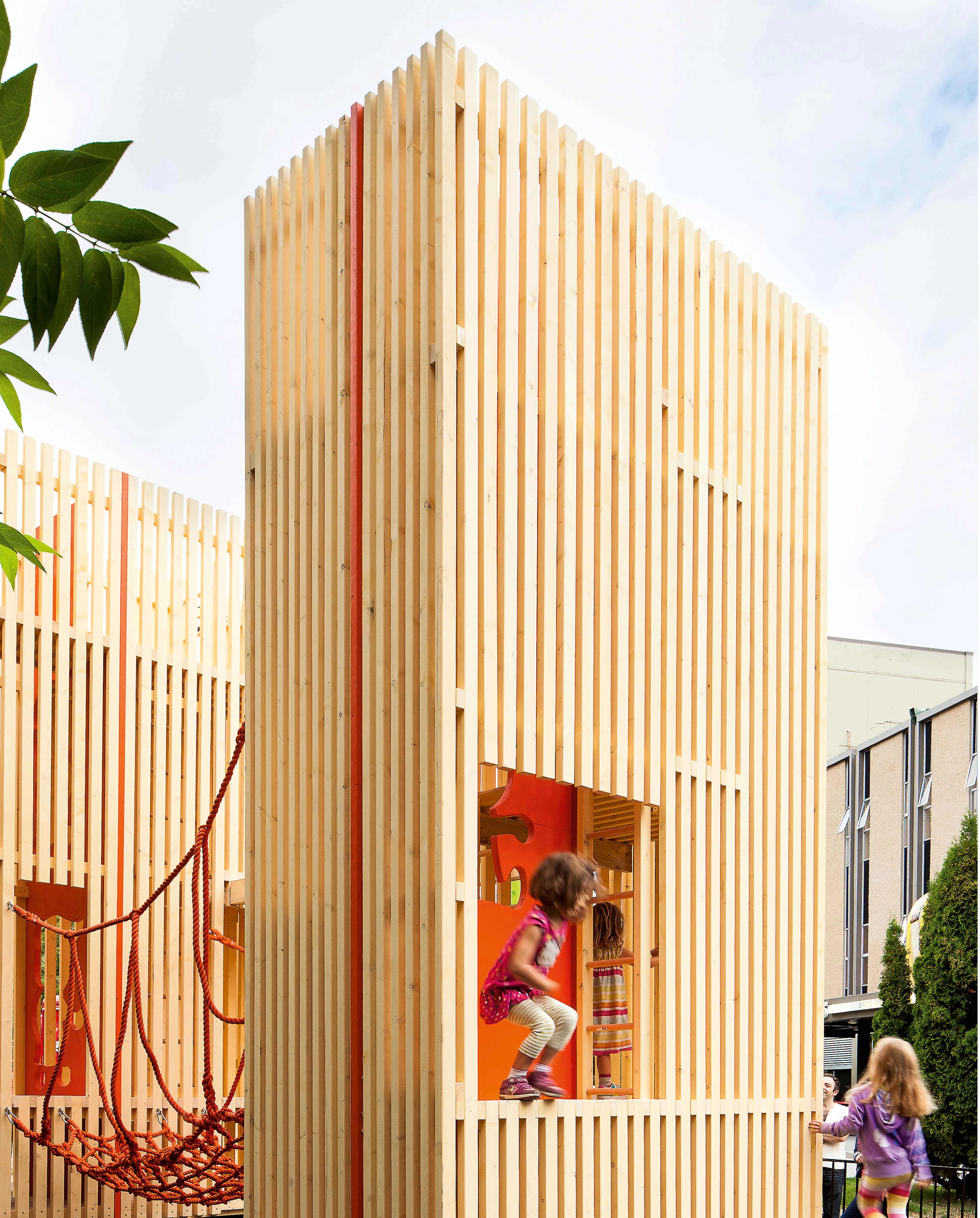 Un puente de cuerda y una escalera horizontal conectan entre sí las dos estructuras verticales que forman el conjunto; construido con piezas de madera de abeto de 5 x 7,5 cm, la dimensión total de 2,4 x 2,4 m permite su transporte en camión.