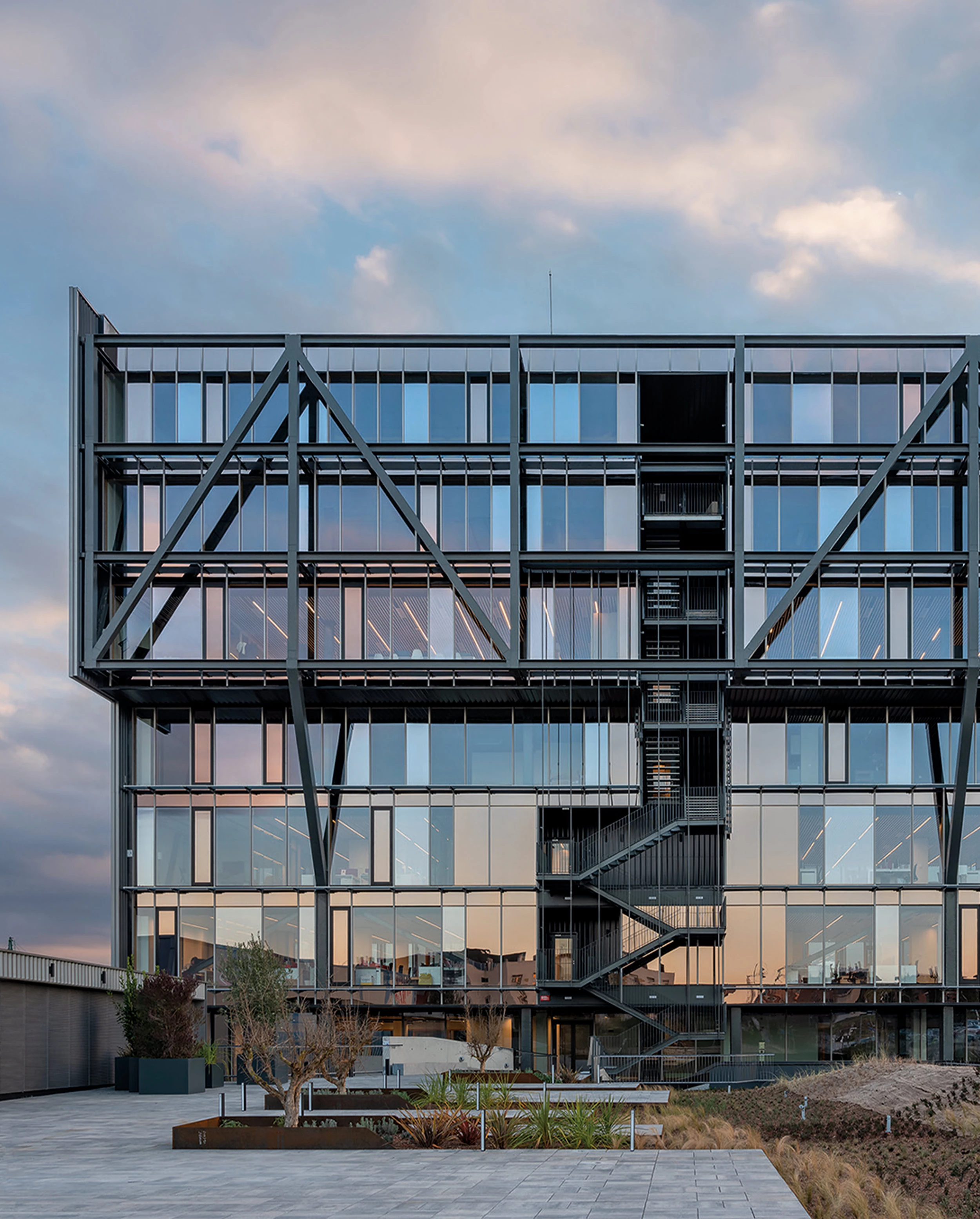 Este edificio de oficinas ha sido diseñado por la firma de Manuel Bailo y Rosa Rull, con el asesoramiento de la gestora de proyectos H.A.U.S. Healthy Buildings. Con 15.411 metros cuadrados y ocupando la longitud total de la parcela, el volumen estrecho y escalonado alcanza nueve alturas, y responde a la orientación solar con soluciones específicas en cada fachada para regular térmicamente los interiores y optimizar las vistas. La planta primera está rematada por una terraza ajardinada. El edificio cuenta con la certificación DGNB, que determina el grado de sostenibilidad del edificio y algunos elementos del capítulo de salud, y ha obtenido la consideración de edificio nZEB (nearly Zero-Energy Building).