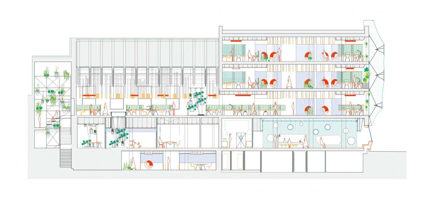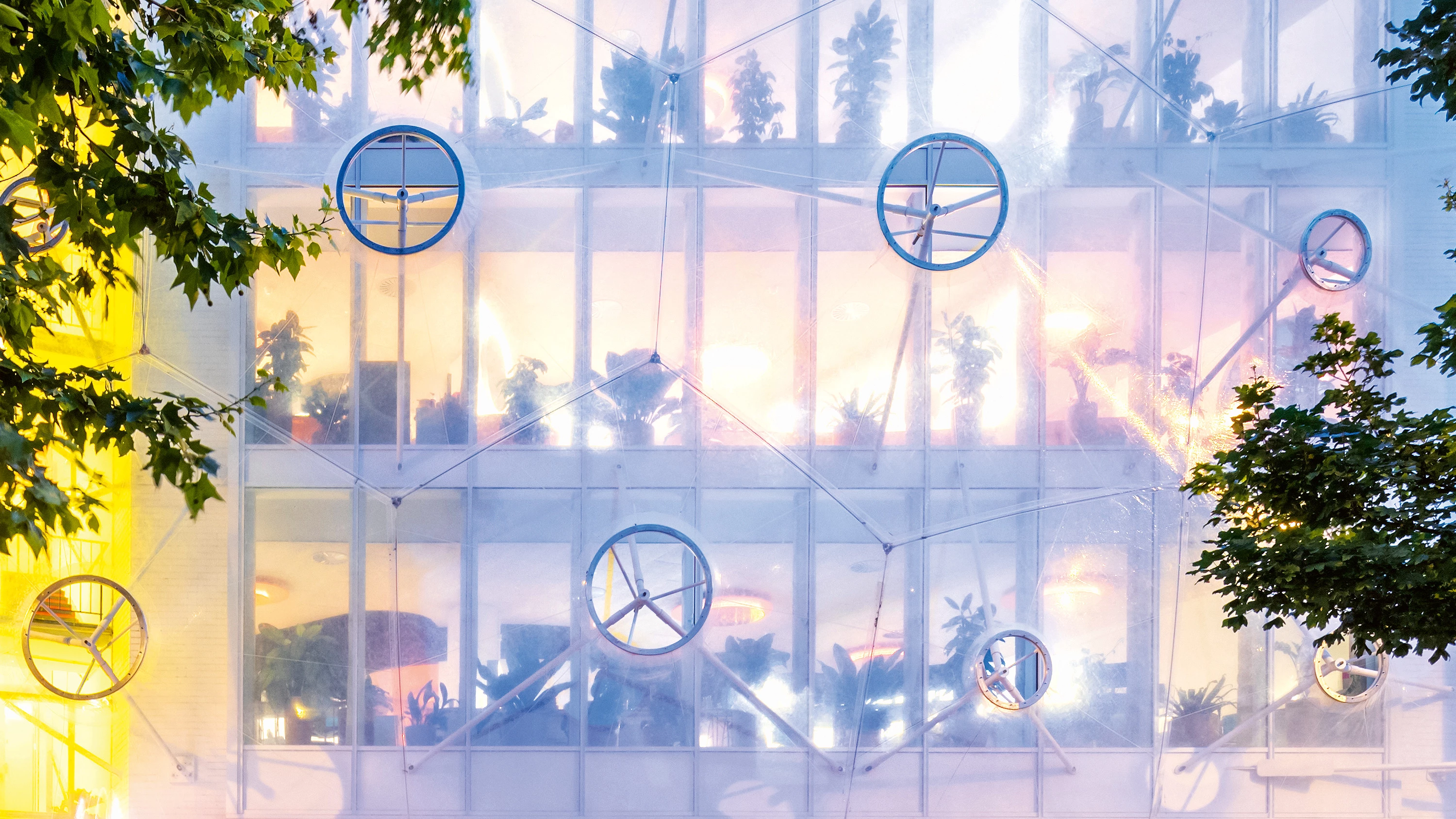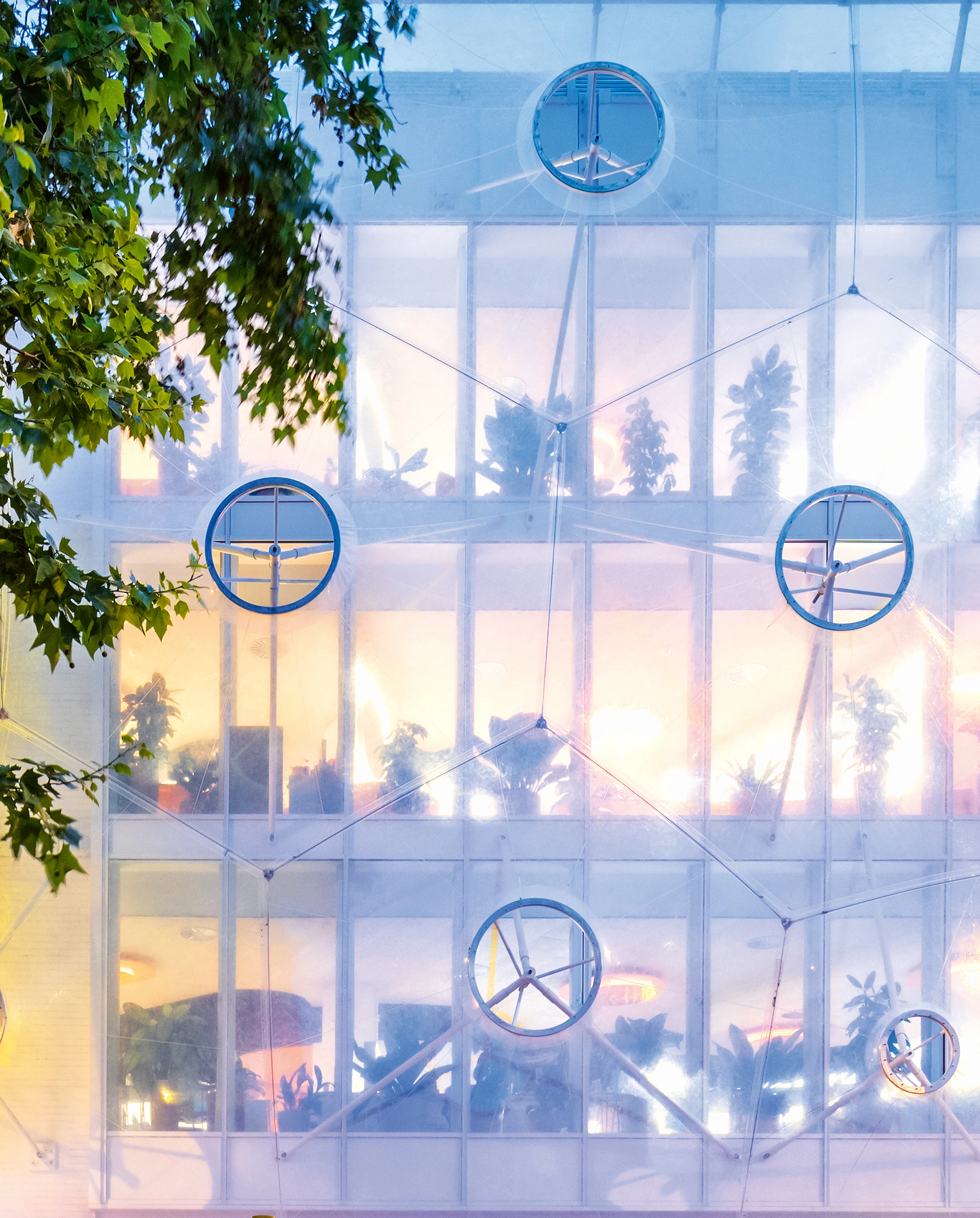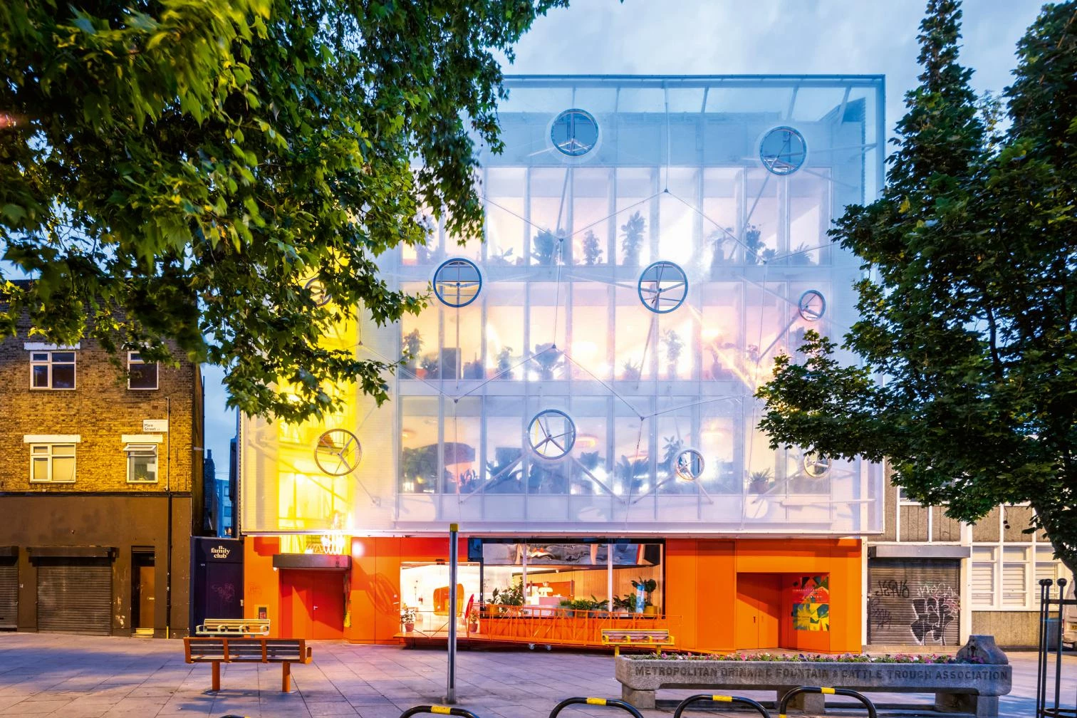 Situado en Hackney —uno de los barrios londinenses de moda—, este edificio destinado al coworking y la innovación atiende a su contexto y su programa de dos maneras: a través de la fachada y a través del ambiente de trabajo, respectivamente. Ins-pirada en el Aviario de Cedric Price, la fachada está revestida con un velo colgado de ETFE, muy tecnológico y ligero, que consigue generar una singular imagen a un tiempo decorosa y desenfadada. Por su parte, el ambiente hace las veces de un espacio de ilusión capaz de trascender, por su singularidad cambiante, el aburrimiento de la vida cotidiana. Este espacio de ilusión depende de la relación sutil entre el interior y el exterior, y es fruto, en último término, de la creación de los matices luminosos y cromáticos que hace posible la membrana de ETFE, así como del diseño de un entorno de trabajo ligero, orgánico e informal que fomenta los encuentros insospechados y, por tanto, la creatividad.