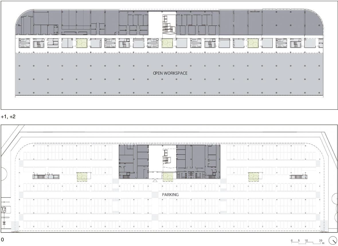 El edificio, de tres plantas y 220x60 metros, está situado en un polígono industrial a las afueras de Tordera, por lo que el aparcamiento es la pieza clave en la organización del programa. Frente a las dos soluciones más comunes de aparcamiento —al aire libre en un solar colindante o subterráneo bajo el propio edificio—, el proyecto propone una nueva tipología: un edificio palafítico que libera la mayor parte de su planta baja para destinarla al aparcamiento. Esta solución genera una óptima accesibilidad, protege los vehículos de la intemperie y logra una imagen que dignifica el aparcamiento en vez de tratarlo como un espacio residual. El resto de la planta baja configura los accesos, usos complementarios e instalaciones, y las dos plantas superiores se destinan íntegramente a espacios de trabajo, bañados en luz natural gracias a una fachada norte totalmente acristalada.