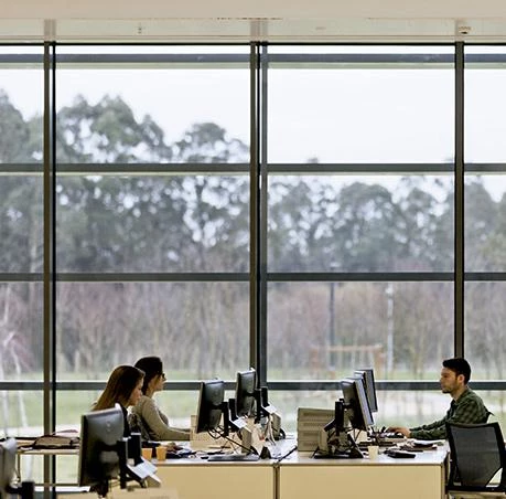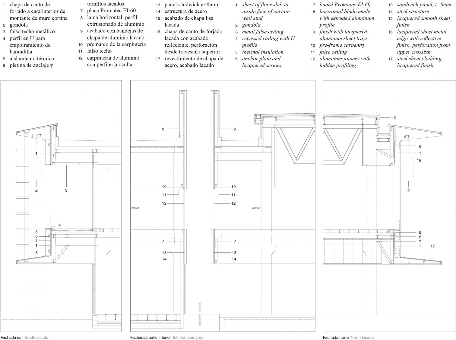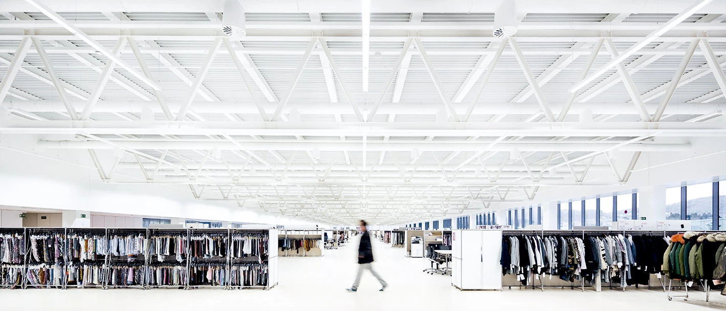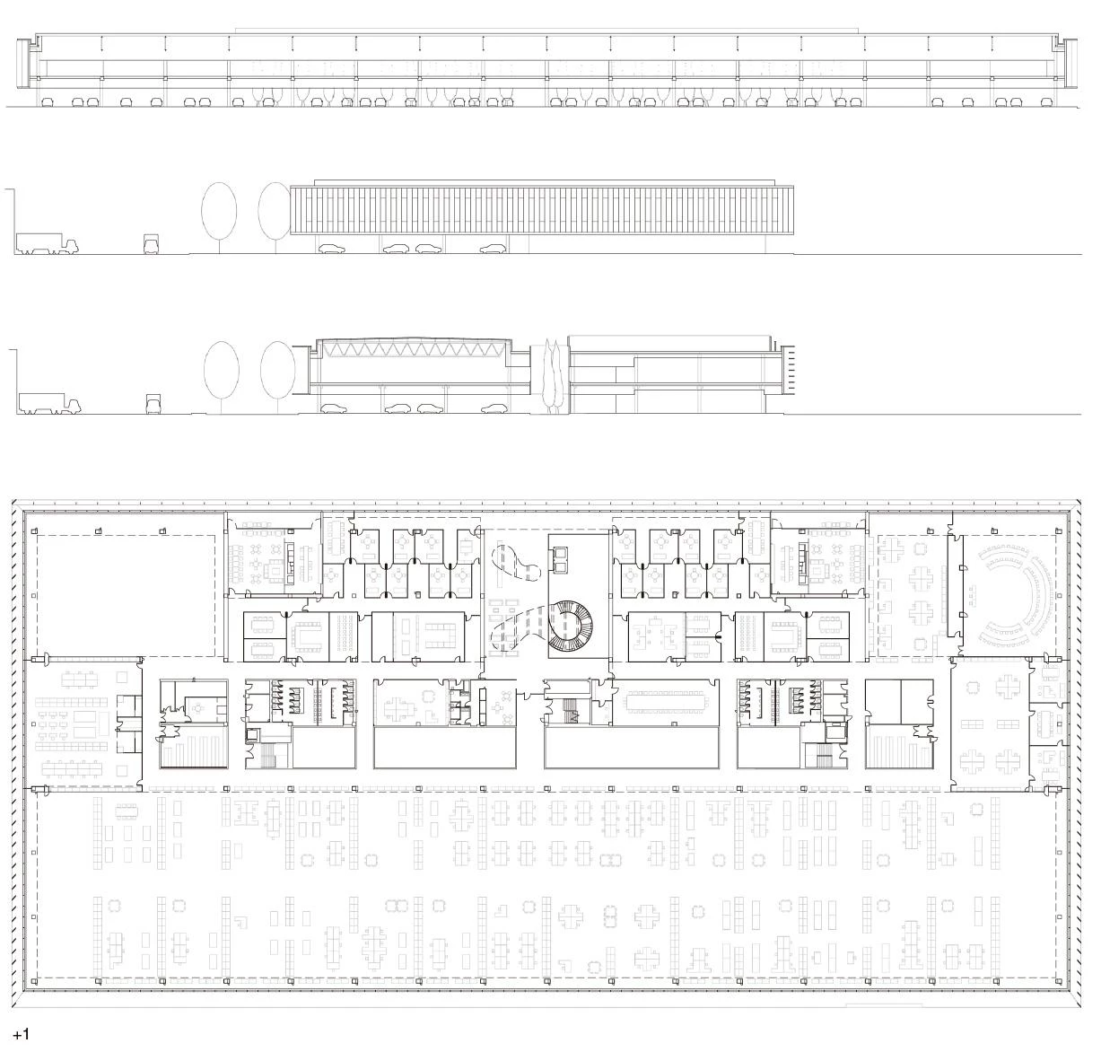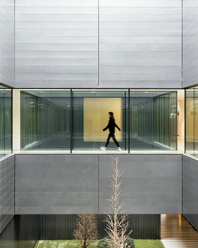 La planta se organiza en tres franjas longitudinales: la central alberga cuatro núcleos de accesos y servicios, con cuatro patios para iluminación y ventilación. Las otras dos contienen las áreas de trabajo. La orientada a norte se destina al diseño y desarrollo de producto. Con 37 metros, es la de mayor anchura, y totalmente diáfana. Se ilumina de forma natural a través de la fachada acristalada. La orientada a sur acoge los usos que requieren compartimentación —salas de visita, showroom, patronaje, office, e-commerce—, y el vestíbulo a doble altura, una escalera abierta y los ascensores acristalados. Dada la baja incidencia solar en la zona, las fachadas están completamente acristaladas. Aún así, la este y la oeste se protegen con lamas verticales, y la sur con lamas horizontales.