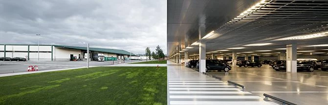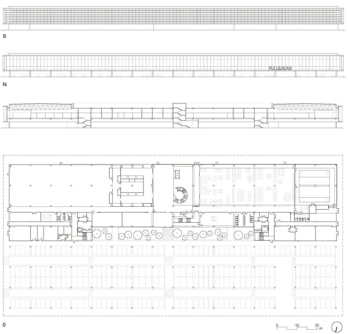 Como en la experiencia previa de Massimo Dutti, el proyecto plantea una estructura palafítica abierta que permite ubicar en planta baja, además del acceso al edificio, el aparcamiento de vehículos.