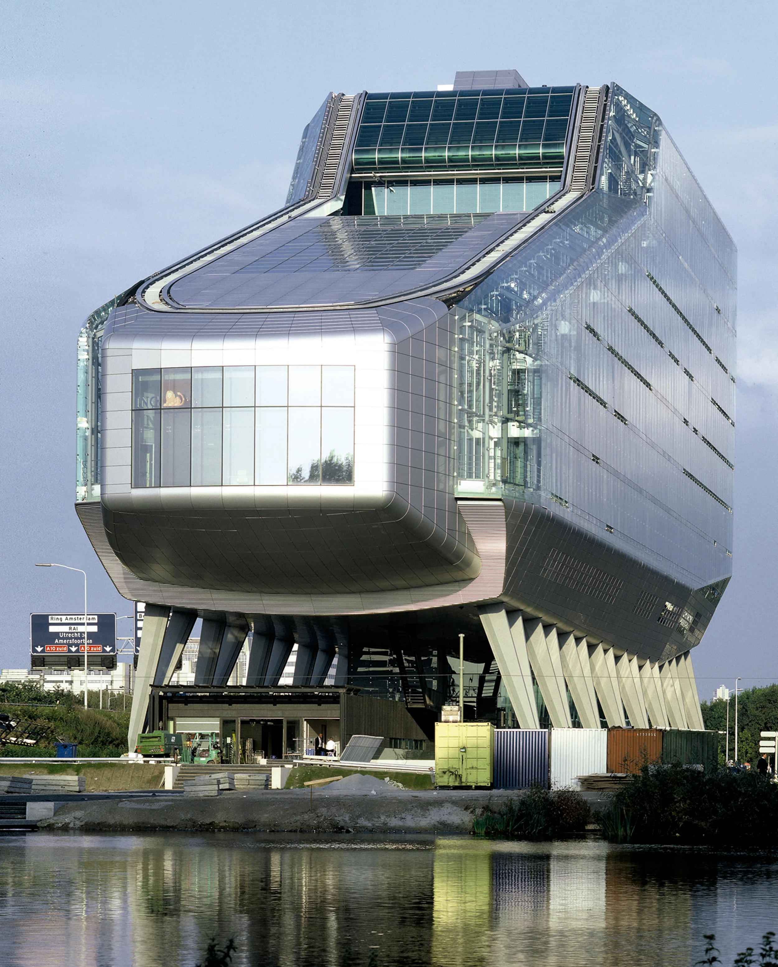 Para no interrumpir las vistas de la zona verde desde la autopista, el edificio se separa del suelo mediante postes oblicuos de entre 9 y 12,5 metros de altura, permitiendo asimismo que desde todos los puestos de trabajo se perciba el paisaje por encima del talud de la carretera. Sobre este ligero entramado de pilares inclinados —apoyados a su vez sobre el aparcamiento subterráneo—, cinco plantas de oficinas y otras tres de despachos de directivos y salas de reunión se apilan para conformar un cuerpo cuya altura crece hacia los bloques en altura del barrio de Zuidas. Como si se tratara de un puente de mando, el restaurante preside esta suerte de superestructura de perfil quebrado. Subrayando su condición de objeto publicitario, un auditorio en voladizo sobresale por el extremo oeste para reducir el volumen del edificio en la proximidad de la zona verde. Blindado a los ruidos provenientes del tráfico de la autopista mediante una doble fachada, el edificio ofrece en su interior toda una serie de espacios verdes destinados a desahogar el espacio de trabajo, como son la ‘jungla’ del cuarto piso, el invernadero de palmeras en el sexto o el bosque de pinos del octavo.