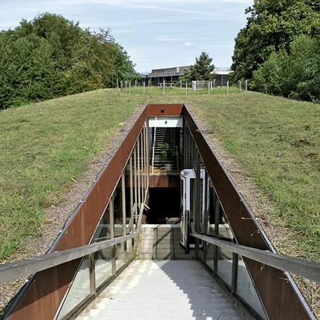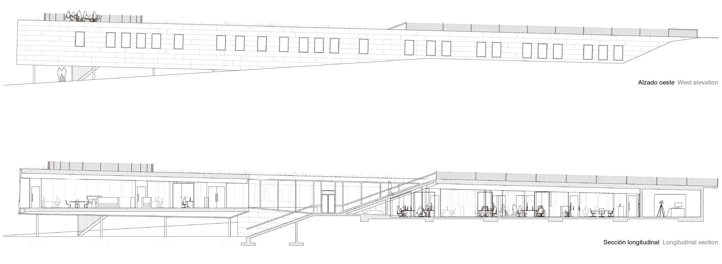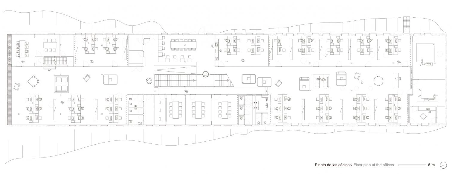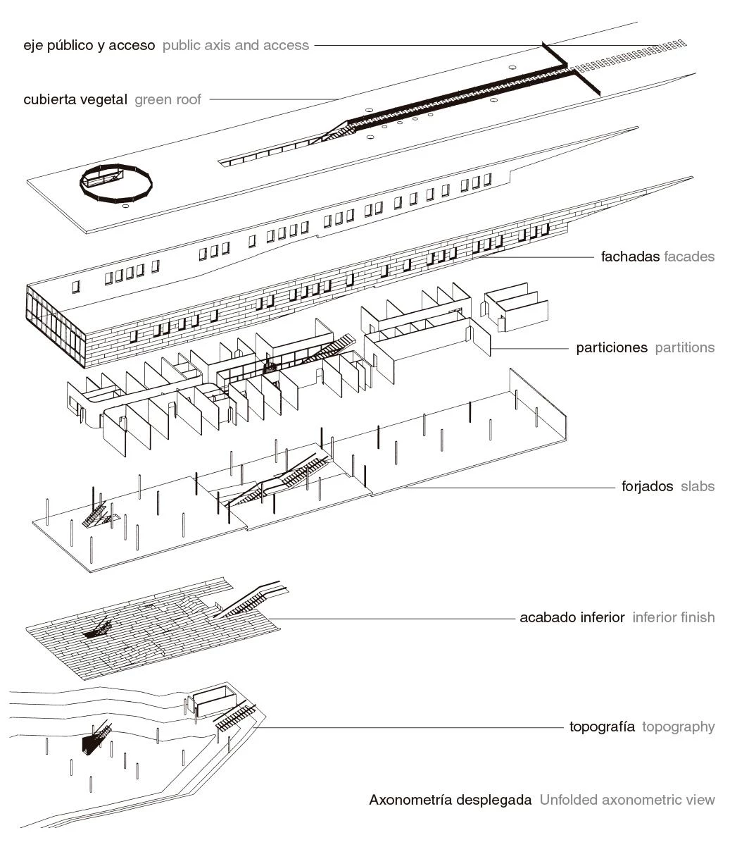 El prisma oblongo se sitúa en una zona de pendiente suave, quedando enterrado en su cota más alta de manera que la cubierta, rematada con un tratamiento vegetal, continúa el parque y resulta imperceptible desde la ciudad. Sin embargo, el extremo opuesto vuela sobre el terreno sostenido por una red de esbeltos pilares, creando un porche sombreado y haciéndose notable hacia el campus. Un sendero público atraviesa el edificio longitudinalmente para conectar ambos frentes mediante una escalera, con el acceso situado en el descansillo intermedio. Este hueco central, cerrado con vidrio, sirve como patio de luces y divide el interior en tres zonas con tipologías diferentes de oficinas. Las fachadas laterales, por su parte, se rematan con chapas de acero cortén.[+][+]