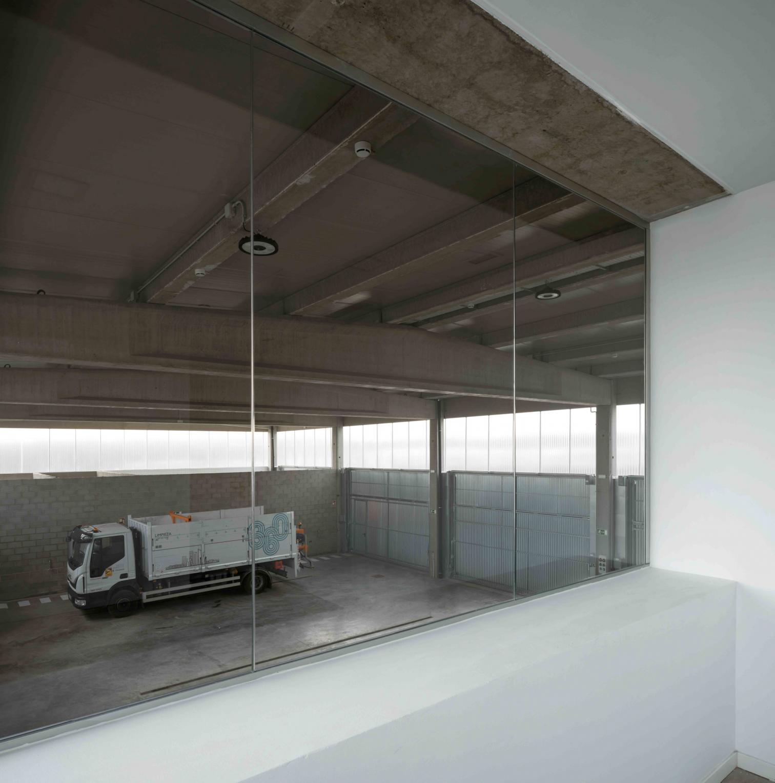 El programa arquitectónico, aunque sencillo, alberga una notable diversidad funcional: oficinas, vestuarios, talleres, lavadero y almacenes se distribuyen en bandas consecutivas, formando una silueta continua de altura constante. Esta disposición se expresa de manera clara tanto en planta como en sección, gracias a una solución estructural basada en elementos prefabricados de hormigón armado.