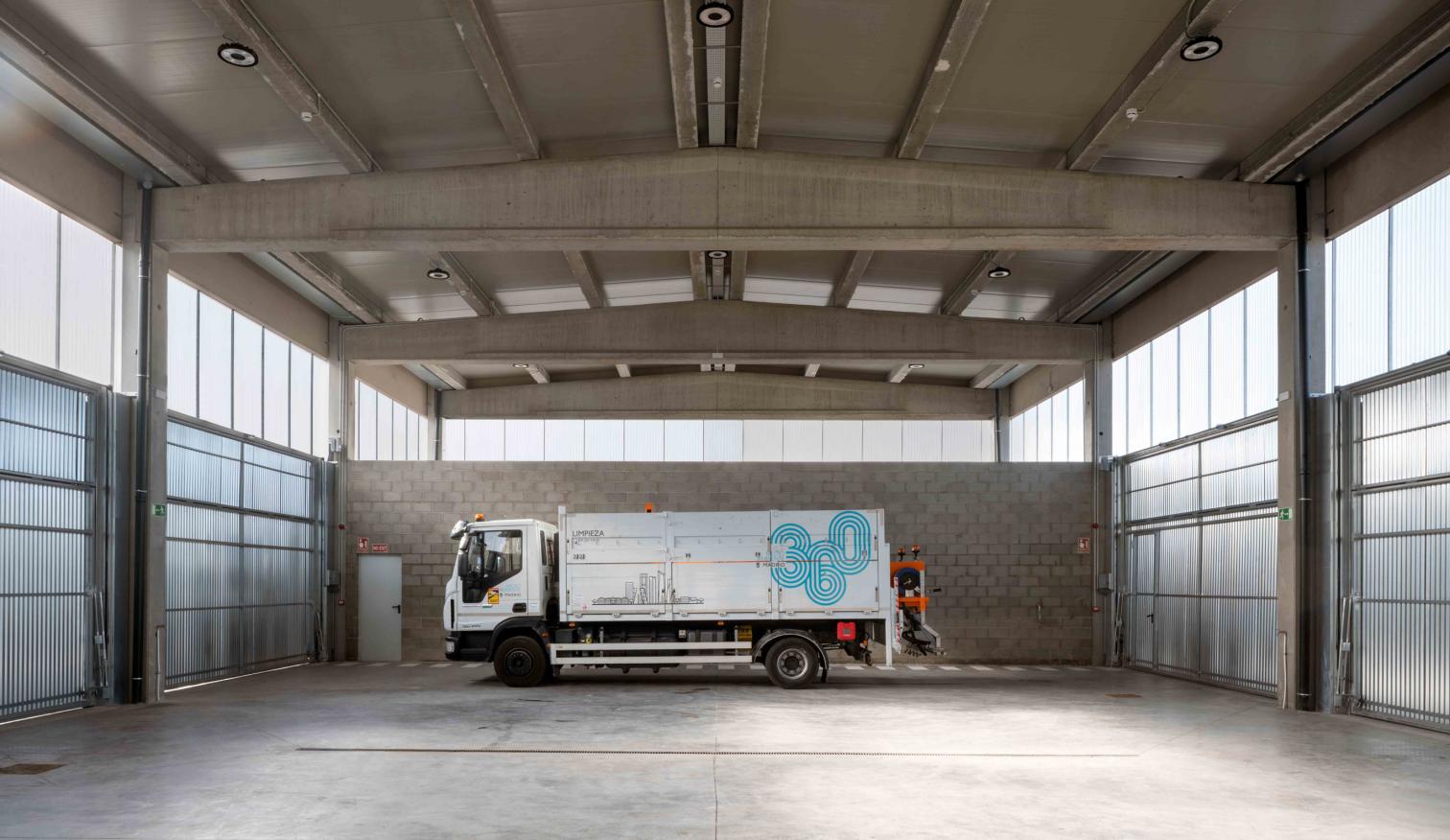 El proyecto responde a las necesidades operativas que requiere un amplio espacio exterior para el aparcamiento y circulación de vehículos de servicio de limpieza viaria. Esta condición ha determinado la disposición del volumen construido dentro de la parcela, en el extremo oeste del polígono del distrito madrileño de Vallecas, organizando un esquema de circulación en anillo que facilita el movimiento fluido alrededor del edificio.
