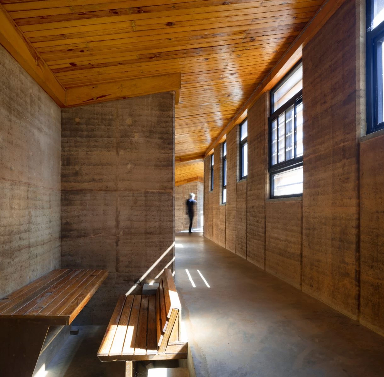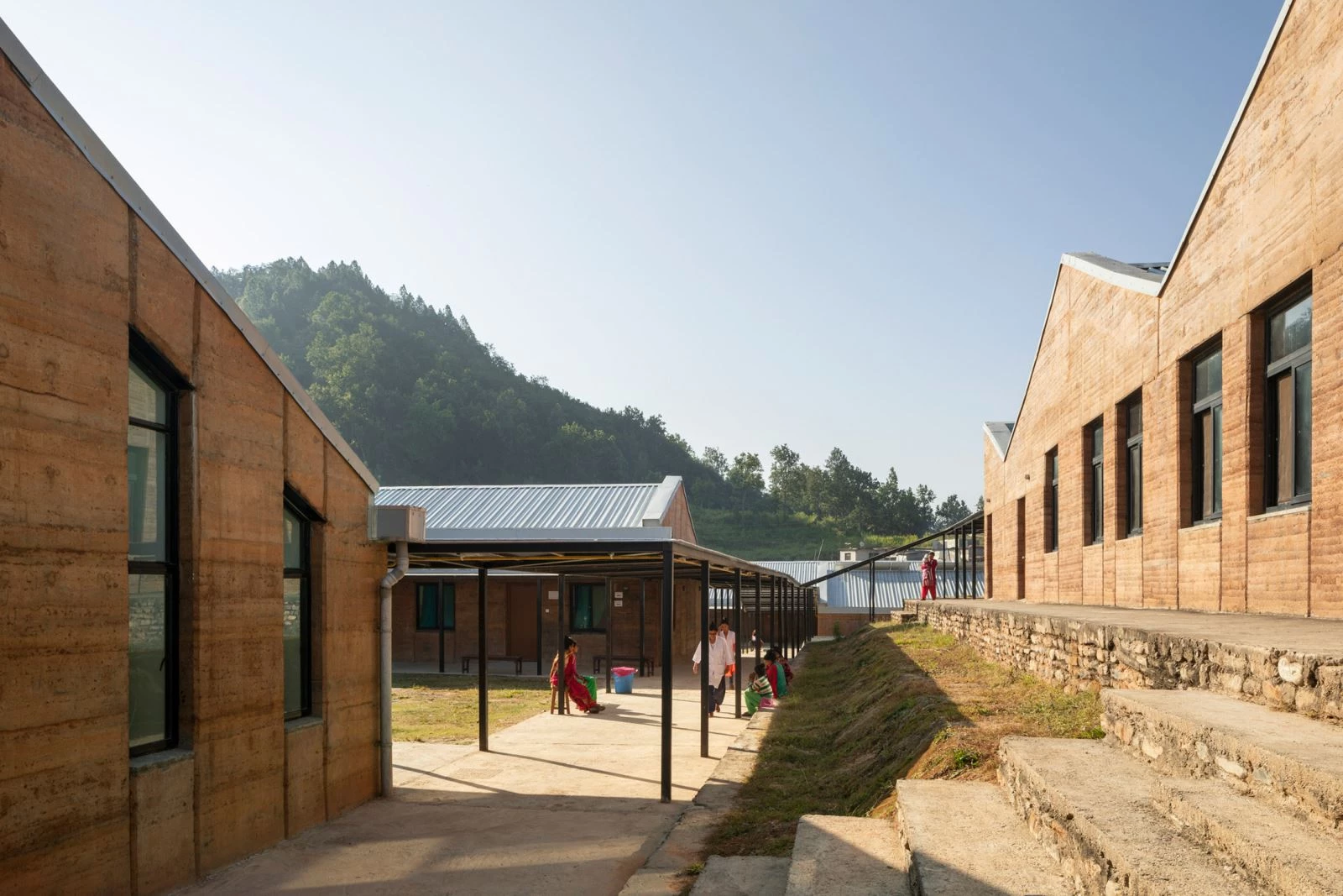 El lenguaje del proyecto está definido por la materialidad de la tierra apisonada, mezclada con un 6 % de cemento para aportar estabilidad, durabilidad y resistencia sísmica. El encofrado de plástico reutilizable permitió una construcción más rápida y el empleo de mano de obra local no cualificada. La piedra local se utiliza para los cimientos, muros de contención y caminos. Parte del mobiliario, puertas y los protectores solares de las ventanas se realizaron con madera de sal, un árbol de la zona. Las cubiertas presentan paneles solares y aislamiento térmico.
