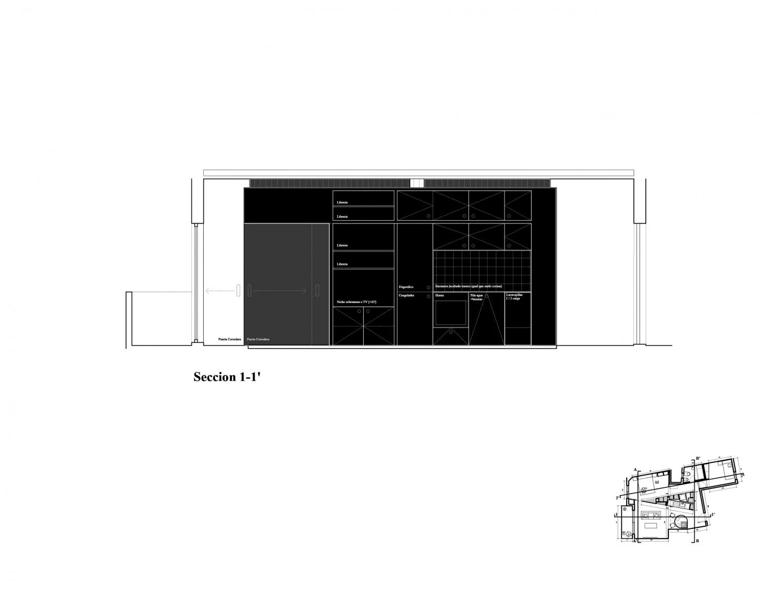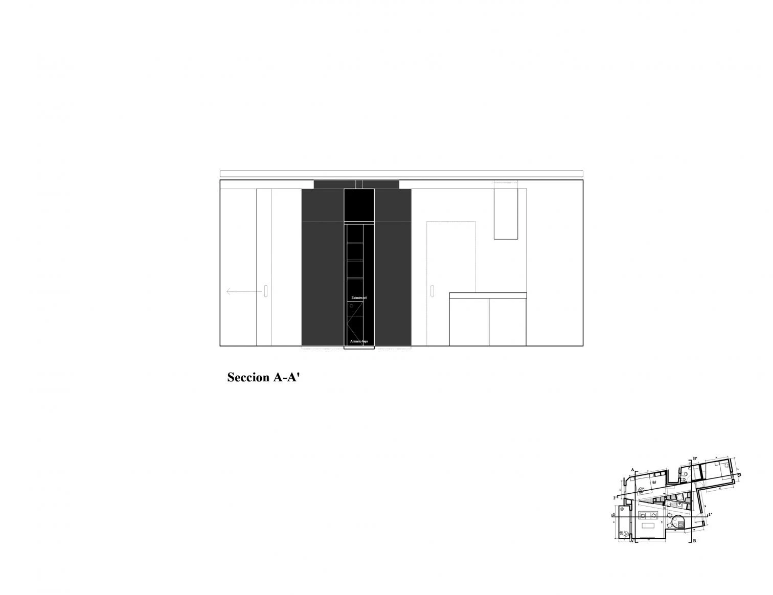 La operación arquitectónica es puramente estratégica. Se plantea una abstracción tipológica de la planta de una vivienda convencional mediante la implantación de un elemento puramente geométrico que contiene todos los mecanismos, instalaciones y objetos necesarios para construir la esfera de lo doméstico. Un dispositivo arquitectónico que congrega, pliega y despliega eventos domésticos.
