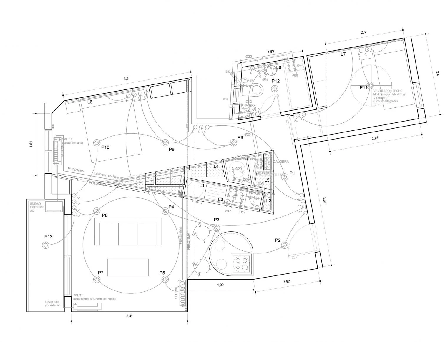 El plano de techo se resuelve con la misma condición de abstracción homogénea que el resto del apartamento, usando un techo acústico perforado que incorpora a modo de otros orificios las luminarias empotradas orientables, que se distribuyen homogéneamente según los posibles requisitos de usos múltiples del espacio inferior a él.