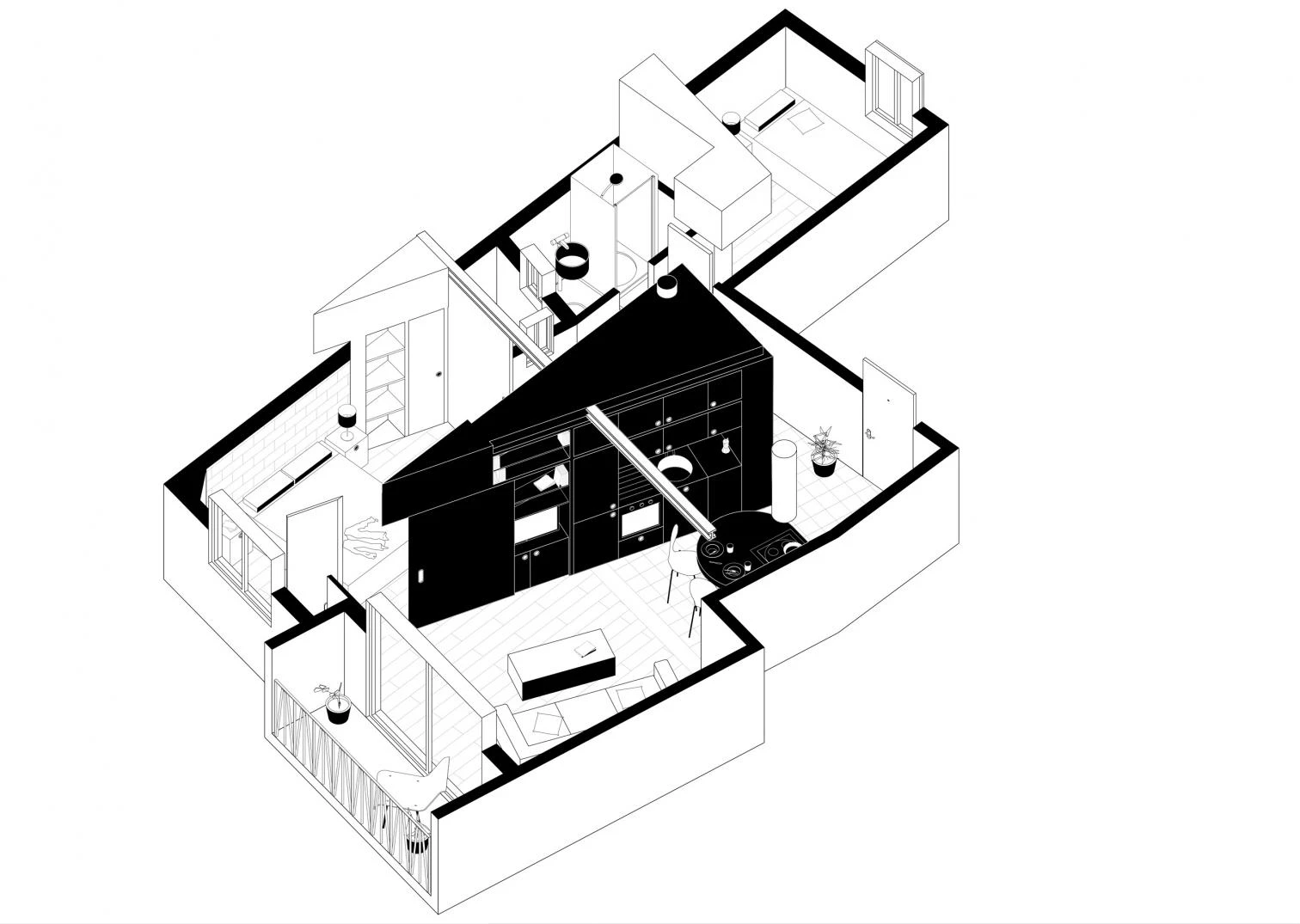 La domesticidad se reduce a pura infraestructura. Los diferentes programas cotidianos, derivados de las necesidades de la propietaria, quedan embebidos en una pieza de mobiliario triangular que asume el rol infraestructural del proyecto.