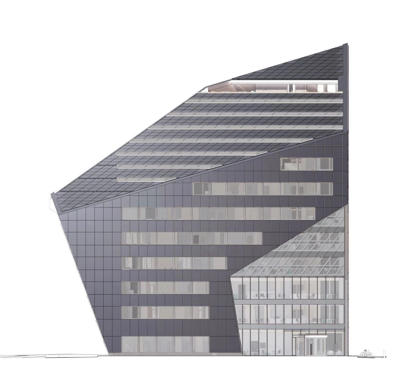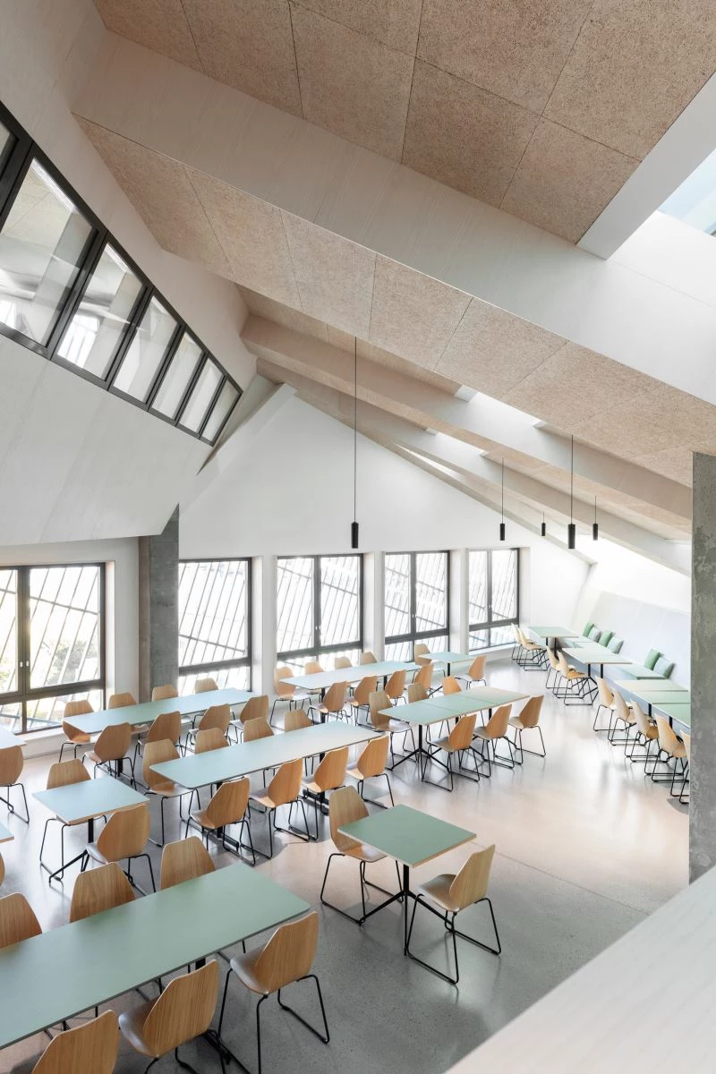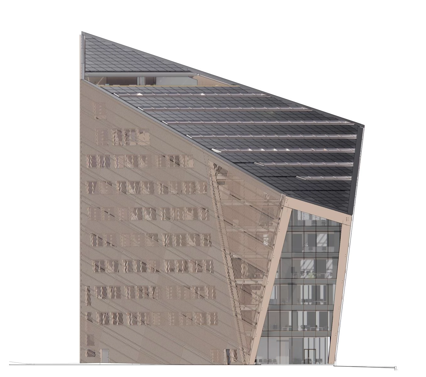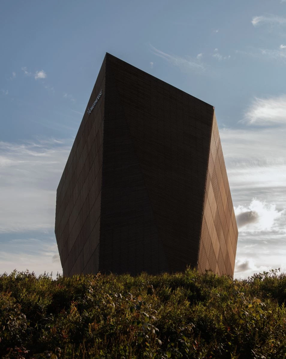 Con un revestimiento exterior de madera, el edificio de once pisos altamente aislado presenta inclinaciones y perforaciones que permiten maximizar la recolección de energía solar y recibir iluminación natural en el interior, minimizando el uso de luz artificial. Además, un sistema de circuitos de agua asegura que el edificio se enfríe y caliente eficientemente, a través de pozos geotérmicos excavados a 350 metros bajo tierra.