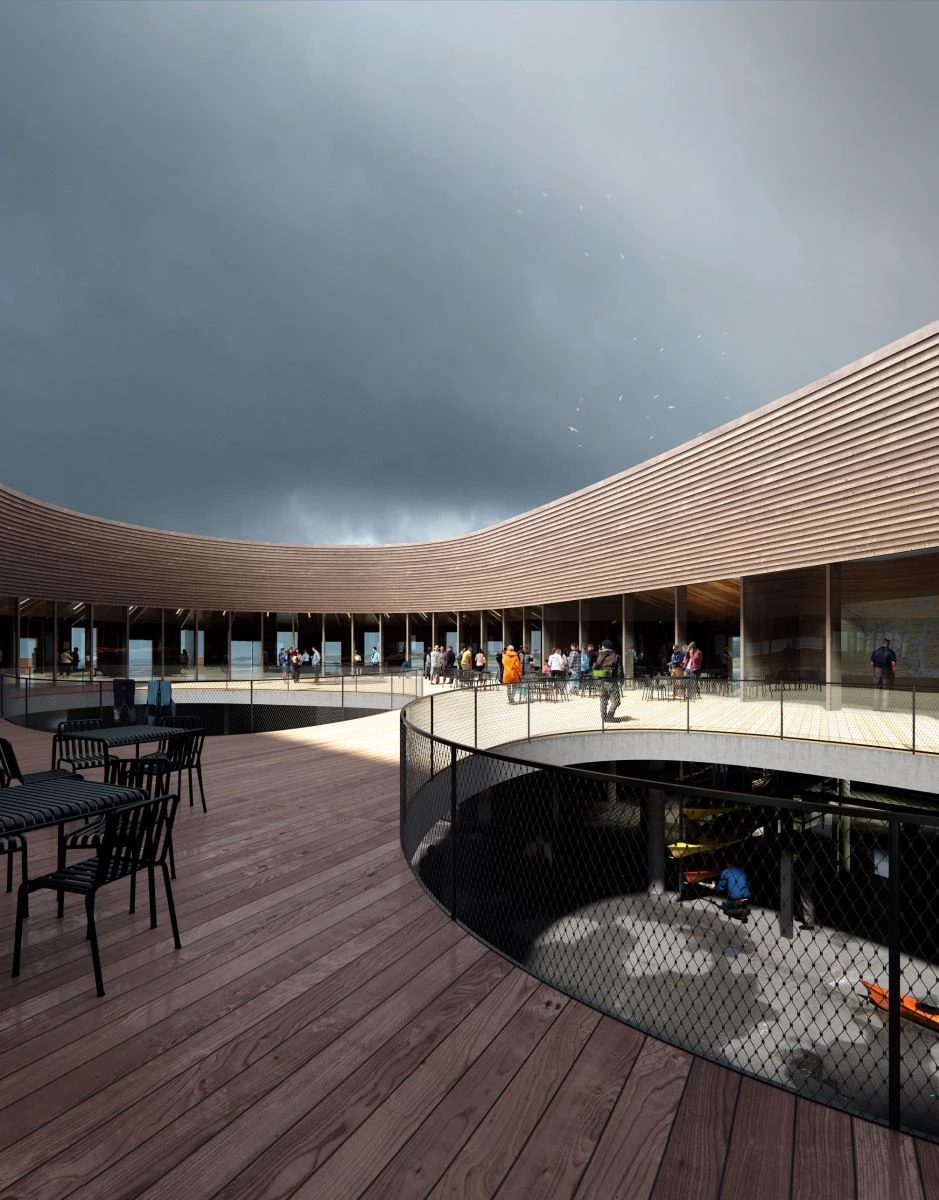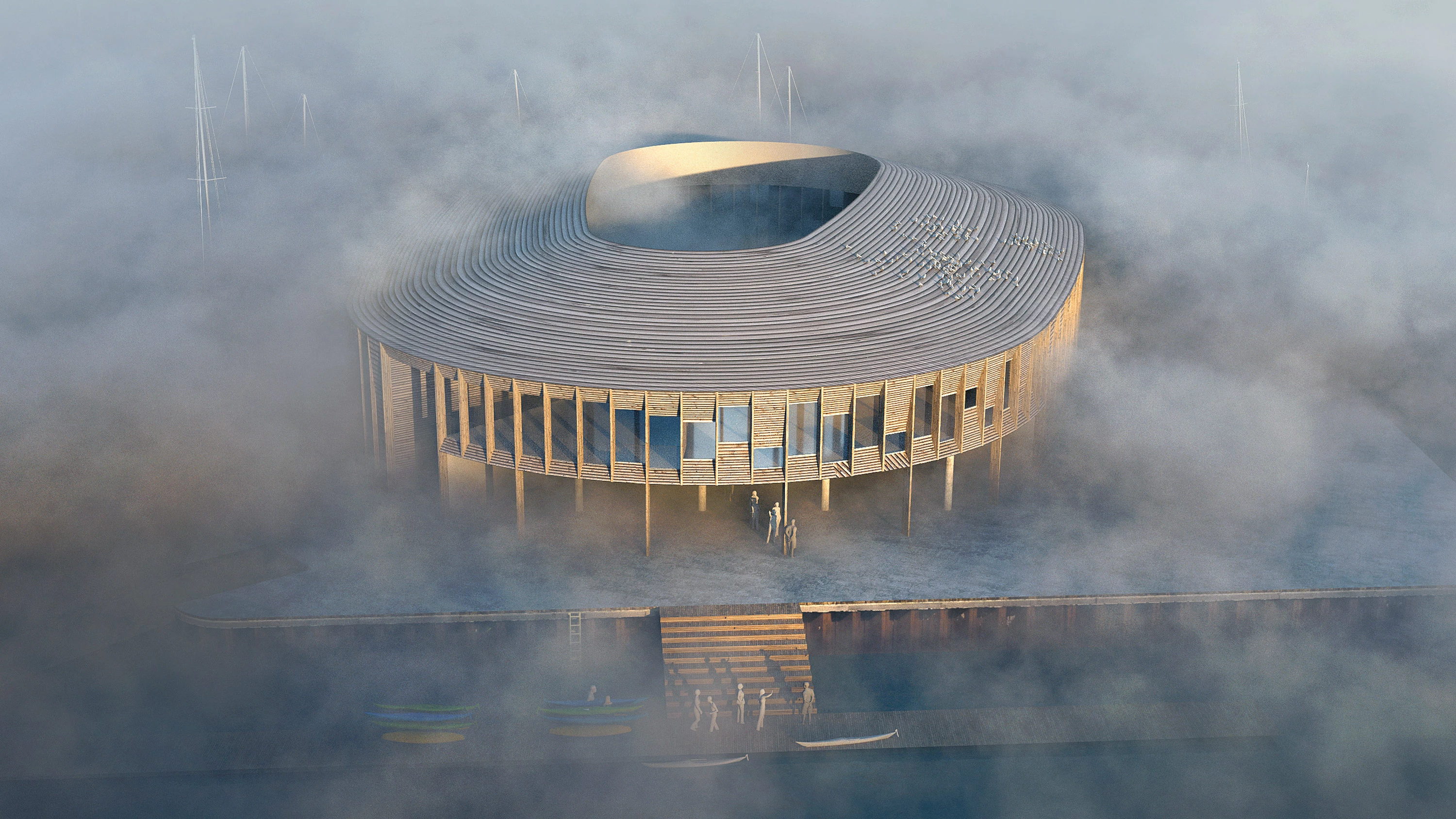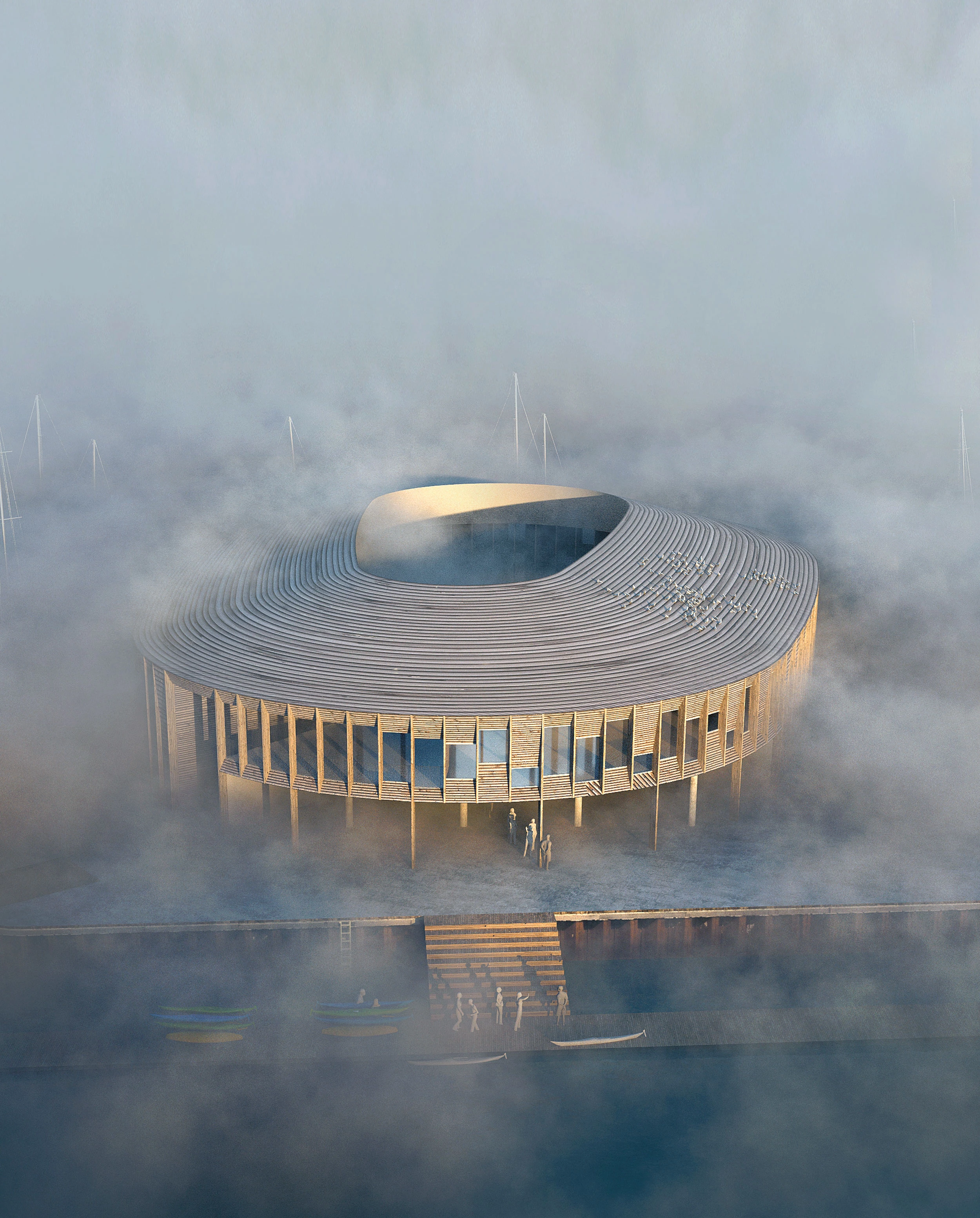 En homenaje a la tradición marítima e inspirado en la geometría y la artesanía de los barcos, se ha diseñado este centro situado en la costa al oeste de Esbjerg. El edificio forma parte de un plan de expansión urbana de la ciudad que incluye múltiples clubes de deportes acuáticos, almacenamiento de barcos, instalaciones de entrenamiento, un gran taller, instalaciones escolares y espacios sociales. La premisa fundamental del proyecto consistió en diseñar un lugar donde los vecinos de la localidad se puedan reunir para fomentar actividades sociales y físicas vinculadas al mar, y desarrollar su propia comunidad. Así pues, la propuesta presenta un cuerpo de planta ovalada y elevado sobre el suelo que permite a los visitantes acceder desde cualquier punto y hacer frente a posibles crecidas del nivel del agua. En el centro del primer nivel se dispone una gran terraza protegida del duro clima nórdico. Unas amplias escaleras conducen a la cubierta y permiten a los usuarios sentarse para disfrutar de las vistas. En este mismo espacio, dos patios se recortan para permitir el paso de la luz natural hasta la planta baja y crear un vínculo visual y social con la calle. La fachada, por último, sigue un ritmo y una repetición inspirados en la construcción tradicional de barcos de madera, tanto en el exterior como en el interior.