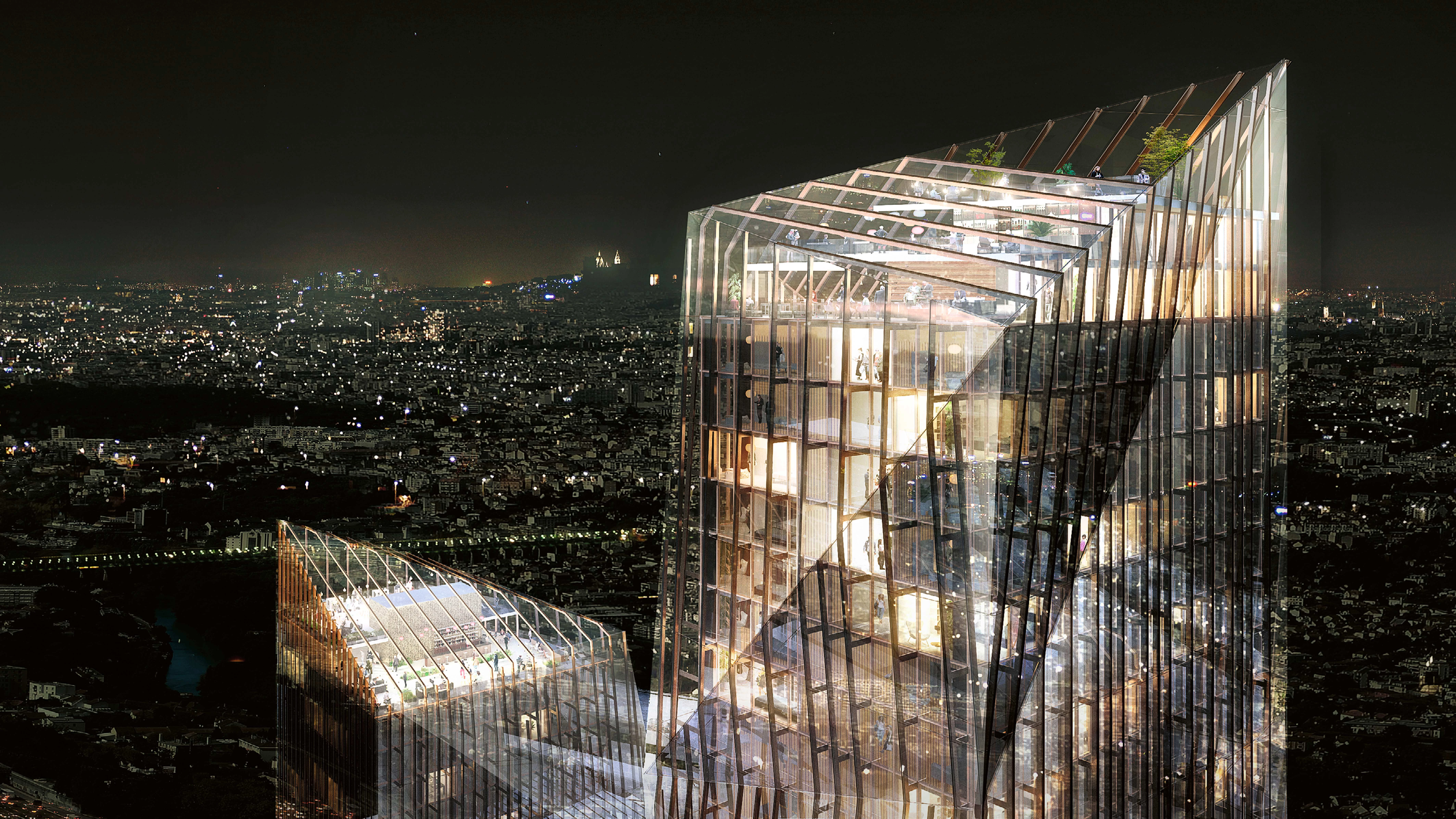 El edificio emerge del suelo como una continuación del parque metropolitano, creando un mirador sobre el jardín y la carretera. En su interior albergará un centro de congresos y dos hoteles que servirán para conectar personas y reforzar la dinámica del nuevo distrito.