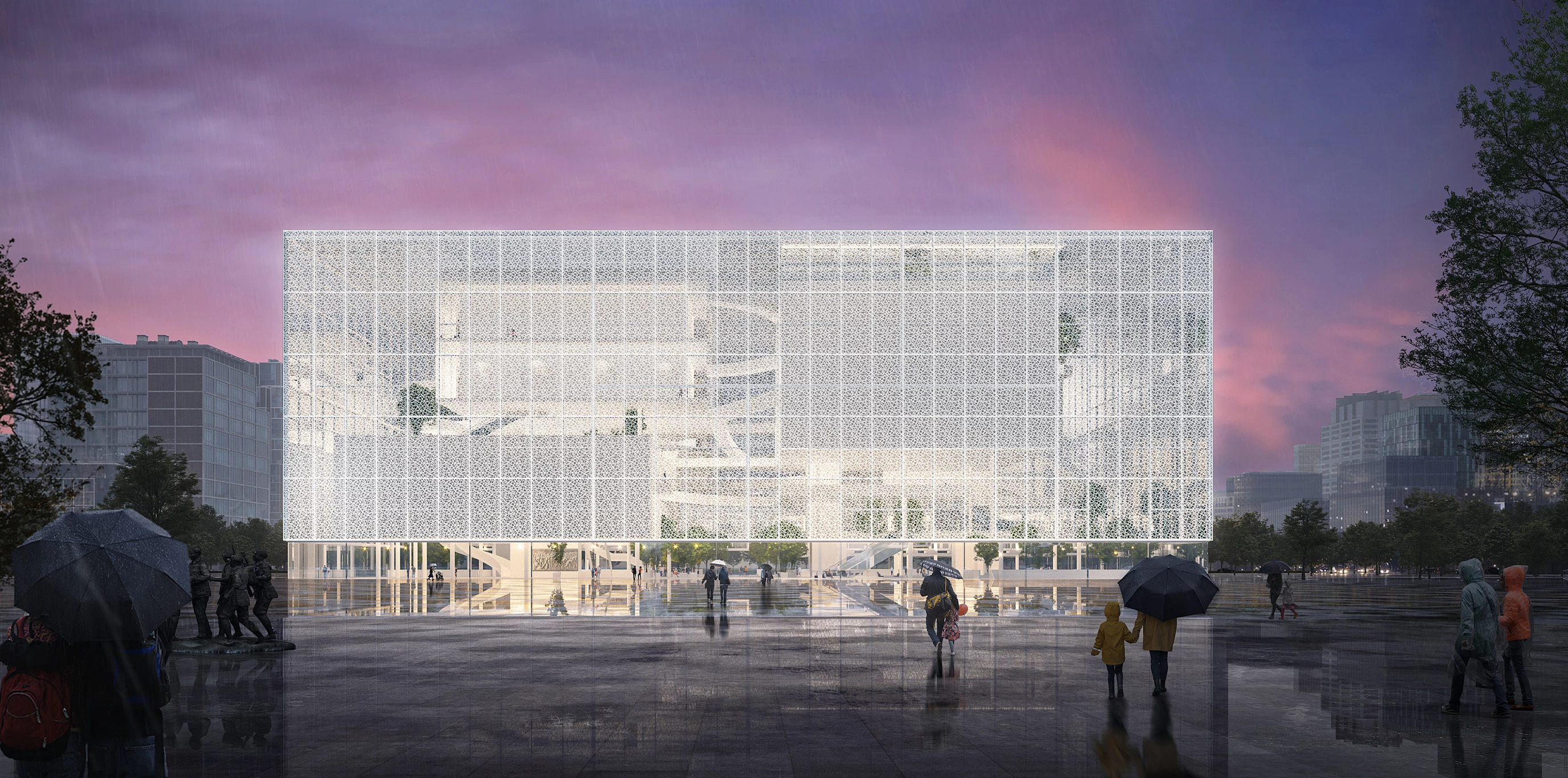La propuesta realizada por el estudio japonés liderado por Sou Fujimoto junto a la firma china Donghua Chen Studio para el proyecto Shenzhen Reform and Opening-up Exhibition Hall resultó ganadora de un concurso internacional. Con 90.000 metros cuadrados, el centro de exposiciones se sitúa en el distrito de Futian de Shenzhen, en el lado norte de la avenida Shennan. El diseño busca establecer un diálogo con el paisaje y el contexto circundantes y, a su vez, transmitir las ideas de reforma y apertura a las empresas extranjeras a través de una cubierta plana y fachadas que presentan transparencias entre el tejido de sus celosías. El sistema de fachada multicapa proporciona una variedad de expresiones espaciales según las condiciones cambiantes derivadas del acceso de la luz natural. En el interior, los espacios están conectados por pasarelas que se entrelazan a través de un gran vestíbulo que contiene árboles como si fuera ‘un jardín en una caja’.