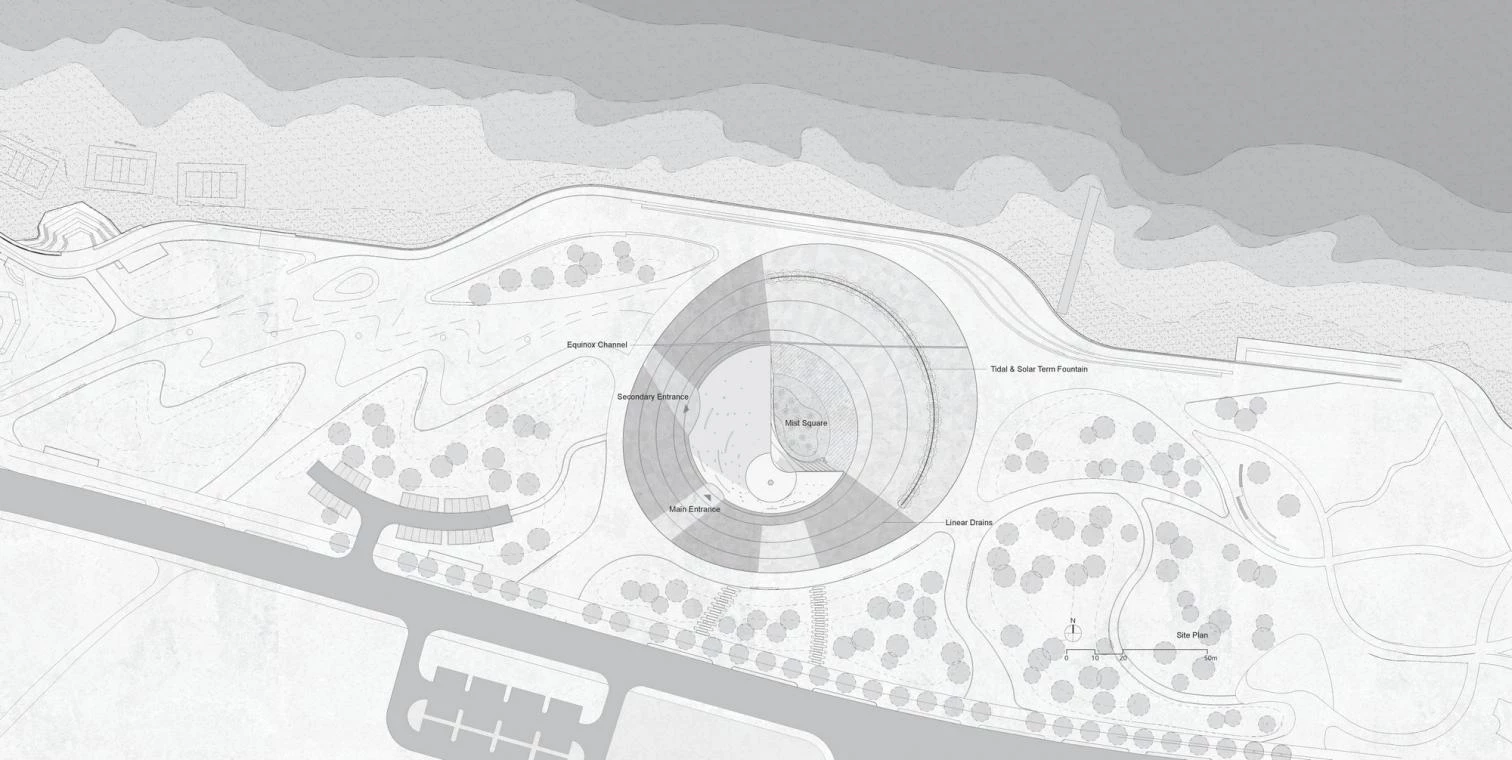 La torre está esculpida por el movimiento del sol observado desde el mirador. El borde norte del revestimiento exterior del edificio es paralelo a la luz solar del mediodía de los equinoccios. El túnel de entrada se alinea con la puesta del sol en el solsticio de invierno. El eje del anfiteatro está orientado hacia el amanecer sobre la isla de Zhifu en el solsticio de verano.