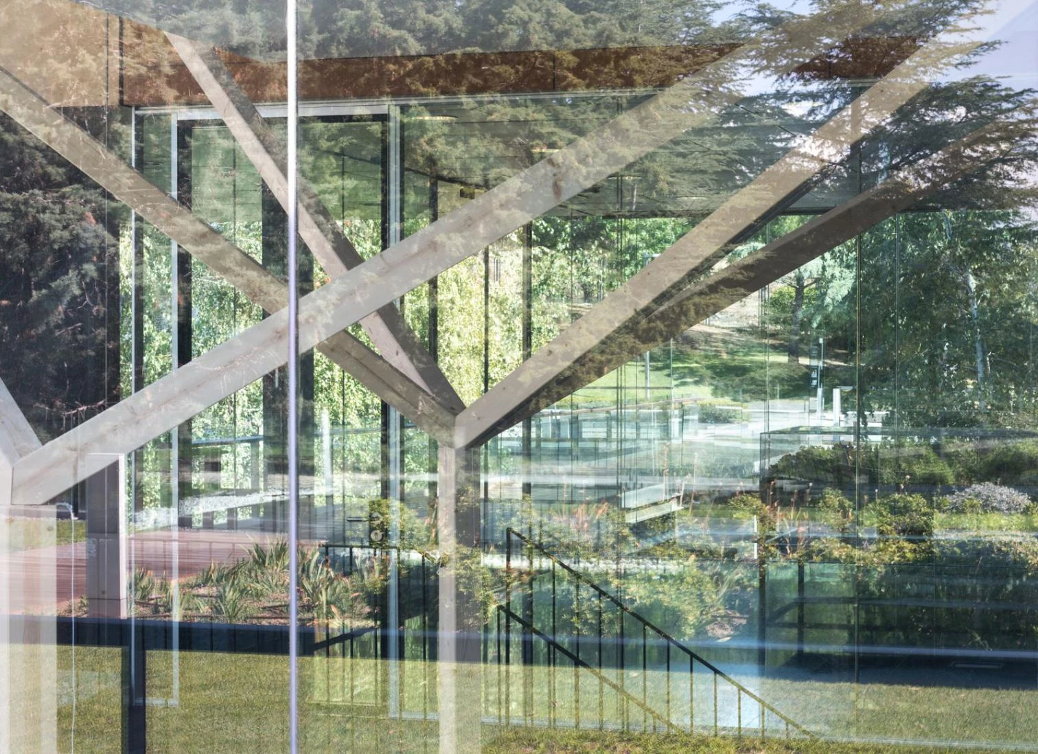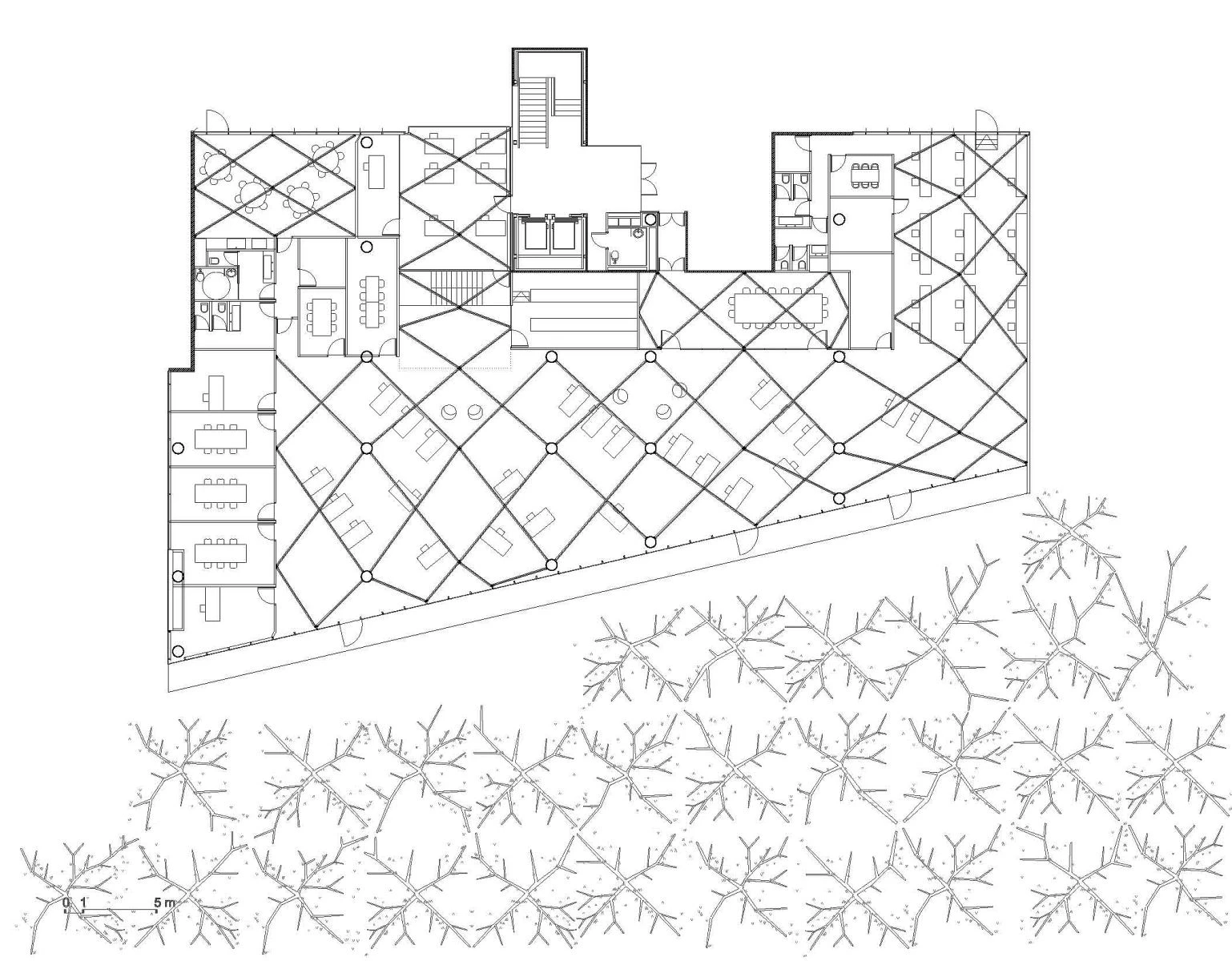 Con oficinas en Madrid y Pamplona, el estudio taller básico de arquitectura de Javier Pérez-Herreras y Francisco Javier Quintana de Uña ha sido el encargado de este proyecto, sede principal de Satlink. Entre abetos y pinos se encuentra este pabellón de oficinas, con una superficie construida de 990 metros cuadrados, abierto en su fachada más larga al bosque y su espalda a un juego de patios. La estructura de hormigón está acompañada de postes y ramificaciones tetraédricas de madera de abedul, como prolongación de la arboleda exterior. El resultado es un bosque luminoso cuya geometría organiza y da escala al espacio interior. Un gran biombo grueso aporta intimidad a los despachos y las salas de reuniones.